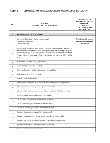 CZĘŚ ĆI. Lp. CHARAKTERYSTYKA SAMOCHODU OSOBOWEGO (SZTUK 1)*: NAZWA PARAMETRU TECHNICZNEGO 1 A. WYMAGANIA PODSTAWOWE: 1. Samochód osobowy (fabrycznie nowy): - nazwa producenta - rok produkcji 2. 3. 4. 5. 6. 7. 8. 9. 10. 11. 12. 13. 14. 15. 16. 17. 18. 19. Samochód osobowy speł niają cy polskie i europejskie wymogi w zakresie bezpieczeń stwa oraz wymagania poruszania siępo drogach publicznych zgodnie z przepisami ustawy z dnia 20 czerwca 1997 r. Prawo o ruchu drogowym (Dz. U. z 2005 r. Nr 108 poz. 908 z póź n. zm.) Nadwozie – 5-drzwiowy hatchback Silnik diesla – 2.0 TDCi 150 KM Skrzynia biegów – automatyczna dwusprzę gł owa Rok produkcji – 2015 lub 2016 System Auto-Start-Stop Klimatyzacja dwustrefowa z automatycznąregulacjątemperatury Klimatyzacja - nawiewy na drugi rzą d siedzeń Ukł ad ABS z elektronicznym ukł adem podział u sił y hamowania Elektroniczny ukł ad stabilizacji toru jazdy Ukł ad wspomagania awaryjnego hamowania Ukł ad poprawiają cy stabilnoś ćna zakrę tach Ukł ad uł atwiają cy ruszanie na wzniesieniach System rozpoznawania znaków drogowych System wspomagają cy utrzymanie pojazdu na pasie ruchu System automatycznego sterowania ś wiatł ami drogowymi System monitorowania koncentracji kierowcy Ś wiatł a z czujnikiem zmierzchu WYKONAWCA WYPEŁ NIA POZYCJE WPISUJĄ C TAK/ NIE LUB OFEROWANE PARAMETRY 2 Należ y podaćnazwę producenta oraz rok produkcji 20. 21. 22. Automatycznie ś ciemniają ce sięlusterko wsteczne Przednie fotele – styl sportowy Przednie fotele - podgrzewane, z regulacjątemperatury 23. Fotel kierowcy – rę czna regulacja poł oż enia w 4. kierunkach oraz podparcia odcinka lę dź wiowego 24. Fotel pasaż era – rę czna regulacja poł oż enia w 4. kierunkach oraz podparcia odcinka lę dź wiowego 25. 17” obrę cze kół ze stopów lekkich, ogumienie letnie zgodnie z zaleceniami producenta 26. 27. 28. 29. 30. 31. 32. 33. 34. 35. 36. 37. 38. Elektryczne sterowanie szyb drzwi przednich i tylnych, opuszczane i podnoszone jednym naciś nię ciem przycisku, z czujnikami przeszkody z funkcją cał kowitego otwierania i zamykania wszystkich szyb Elektrycznie sterowane, podgrzewane i skł adane lusterka boczne Podgrzewana spryskiwaczy przednia szyba z podgrzewanymi dyszami Tempomat – zawiera regulowany ogranicznik prę dkoś ci Przednie ś wiatł a przeciwmgielne z funkcjądoś wietlania zakrę tów Centralny zamek zdalnie sterowany pilotem w kluczyku System monitorowania ciś nienia w oponach Elektryczny hamulec postojowy System centralnego zamka z kluczem elektronicznym (umoż liwia otwarcie drzwi i uruchomienie pojazdu bez tradycyjnego kluczyka) Przycisk rozrusznika Wyś wietlacz mię dzy zegarami - minimum 10" kolorowy Ukł ad kierowniczy – ze wspomaganiem elektrycznym Kolumna kierownicy – z regulacjąpochylenia i odległ oś ci 39. Kierownica oraz uchwyt dź wigni zmiany biegów - wykoń czone skórą 40. Konsola centralna Premium - z podł okietnikiem, gniazdem USB, dwoma uchwytami na kubki 41. Konsola sufitowa krótka, ze schowkiem na okulary, lampkami sufitowymi w tym do czytania map Strona 2 z 10 42. 43. 44. 45. Tylna kanapa skł adana na pł asko, dzielona podł okietnikiem na ś rodku, z 2 uchwytami na kubki 60: 40, z Chromowane obramowanie szyb bocznych Klamki drzwi oraz lusterka boczne lakierowane w kolorze nadwozia Hamulce tarczowe przednich i tylnych kół 46. System elektrycznej blokady tylnych drzwi – uniemoż liwiają cy otwarcie od ś rodka przez dzieci 47. System tankowania z zabezpieczeniem przed zatankowaniem z niewł aś ciwego dystrybutora 48. Nakł adki na progi przednich drzwi - z wykoń czeniem w kolorze alumunium 49. 50. 51. 52. 53. 54. 55. 56. 57. 58. 59. 60. 61. 62. 63. Listwy progowe - lakierowane w kolorze nadwozia Oś wietlenie wnę trza - diodami LED Tylne ś wiatł a – w technologii LED Immobiliser Wewnę trzne klamki drzwi - wykoń czenie chromowane Koł o zapasowe dojazdowe "mini" – z obrę cząstalową16" Dywaniki podł ogowe – welurowe, z przodu i z tył u Kolor Lakieru – czarny Reflektory przednie w technologii LED' Dodatkowo przyciemniane szyby w tylnej czę ś ci nadwozia Czujniki parkowania z przodu i z tył u Radioodtwarzacz CD/MP3 z kolorowym wyś wietlaczem dotykowym minimum 8" zestaw gł oś nomówią cy z Bluetooth i rozbudowanąfunkcjąsterowania gł osem oraz funkcjąwzywania pomocy Zdalne sterowanie z koł a kierownicy Autoalarm obwodowy i pojemnoś ciowy z podł ą cz. pod pilota w kluczyku Komplet opon zimowych w rozmiarze 17 zgodnie z zaleceniami producenta WARUNKI DOSTAWY ORAZ GWARANCJI I SERWISU: Strona 3 z 10 1. 2. 3. 4. 5. 6. Dostawa samochodu odbę dzie siędo siedziby Zamawiają cego na koszt i ryzyko Wykonawcy Gwarancja mechaniczna nie mniejsza niż36 m-cy Gwarancja na powł okęlakiernicząnie mniejsza niż24 m-ce Gwarancja na perforacjęnadwozia nie mniejsza niż144 m – ce Wykonawca zobowią zuje się zapewnić serwis gwarancyjny i pogwarancyjny oferowanego pojazdu, którego odległ oś ć od siedziby Zamawiają cego wynosi nie wię cej niż100 km Wykonawca wraz z dostawą samochodów dostarczy komplet dokumentów niezbę dnych do jego eksploatacji Strona 4 z 10 CZĘŚ ĆII. CHARAKTERYSTYKA SAMOCHODU OSOBOWEGO (SZTUK 1)*: NAZWA PARAMETRU TECHNICZNEGO Lp. 1 A. WYMAGANIA PODSTAWOWE: 1. Samochód osobowy (fabrycznie nowy): - nazwa producenta - rok produkcji 2. 3. 4. 5. 6. 7. 8. 9. B. 1. 2. 3. 4. 5. 6. 7. 8. 9. 10. WYKONAWCA WYPEŁNIA POZYCJE WPISUJĄC TAK/ NIE LUB OFEROWANE PARAMETRY 2 Należ y podaćnazwę producenta oraz rok produkcji Samochód osobowy speł niają cy polskie i europejskie wymogi w zakresie bezpieczeń stwa oraz wymagania poruszania siępo drogach publicznych zgodnie z przepisami ustawy z dnia 20 czerwca 1997 r. Prawo o ruchu drogowym (Dz. U. z 2005 r. Nr 108 poz. 908 z póź n. zm.) Samochód 5 osobowy typu terenowy Pick-up 4x4 Silnik Diesla nie mniejszy niż3.0 nie wię kszy niż3.3 Nie mniej niż195 KM, nie wię cej ni