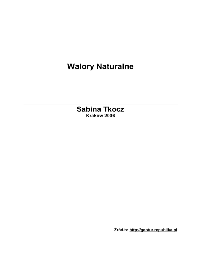 Walory Naturalne Sabina Tkocz Kraków 2006 Źródło: http://geotur.republika.pl WALORY NATURALNE – TO DOBRA ISTNIEJĄCE NIEZALEŻNIE OD DZIAŁALNOŚCI CZŁOWIEKA. Mogą to być: • ukształtowanie powierzchni, • elementy klimatu powtarzające się sezonowo na danym obszarze, • wody powierzchniowe, śródlądowe (rzeki, jezior, morze), • elementy przyrody żywej na powierzchni terenu (lasy naturalne, roślinność stepowa, bagienna, hale górskie), świat zwierzęcy. Część walorów naturalnych została przystosowana do potrzeb człowieka i wydzielona: • lasy zagospodarowane, • rezerwaty przyrody, • parki narodowe, • parki krajobrazowe. Wyróżniany 3 rodzaje naturalnych walorów: • osobliwości skalne o skałki i grupy skalne, wąwozy i doliny rzeczne, wąwozy i lessowe, stożki wulkaniczne, głazy narzutowe i głazowiska, wydmy, • osobliwości wodne o jeziora, wodospady i źródła, zjawiska krasowe, rzeki, W Polsce wyróżnia się 14 szlaków wodnych o szczególnym znaczeniu dla turystyki: o Brda 208 km o Dunajec 199 km o Drawa 195 km o Wda194 km o Pasłęka 156 km o Wielkie Jeziora Mazurskie 130 km o Radunia 110 km o Krutynia 90 km o Kanał Elbląsko – Ostródzki 77km o Poprad 54 km o Czarna Hańcza 51 km o Jeziora Brodnickie 48 km o Jeziora Iławskie 46 o Kanał Augustowski 40 km Dróg żeglugowych i kanałów jest w Polsce dwukrotnie więcej. • Osobliwości fauny i flory o pojedyncze drzewa lub rezerwaty roślinne czy zwierzęce; Możemy na podstawie wieloletnich obserwacji przyjąć pewne cechy – walory – za podstawę do rozwoju turystyki. Szczególnie ważne walory naturalne: • wybrzeże; warunki klimatyczne, plażowe i kąpieliska, • pojezierza; wielkie jeziora, warunki dla turystyki wodnej, wędkarstwa i wypoczynku, Walory Naturalne 1 • • • lasy; duże kompleksy leśne z możliwością wypoczynku oraz polowań, góry; duże zróżnicowanie krajobrazów młodych i starych gór; bardzo atrakcyjne tereny dwusezonowe, tereny narciarskie i do wędrówek pieszych, rezerwaty biosfery; obszary podlegające szczególnej ochronie za względu na nagromadzenie unikalnych elementów przyrody, niezakłócanych działalnością człowieka; W Polsce znajduje się 9 spośród 300 światowych rezerwatów biosfery: o Babiogórski PN, o Białowieski PN, o Karkonoski Rezerwat Biosfery (Karkonoski PN w Polsce i Czechach), o Wschodniokarpacki RB (Bieszczadzki PN+parki krajobrazowe polskie i słowackie i ukraińskie), o Jezioro Łuknajno (rezerwat ptactwa wodnego), o Słowiński PN, o Międzynarodowy RB „Polesie” na pograniczu Polski, Białorusi i Ukrainy, o Kampinoski PN, o Międzynarodowy RB w Tatrach, Walory Naturalne 2