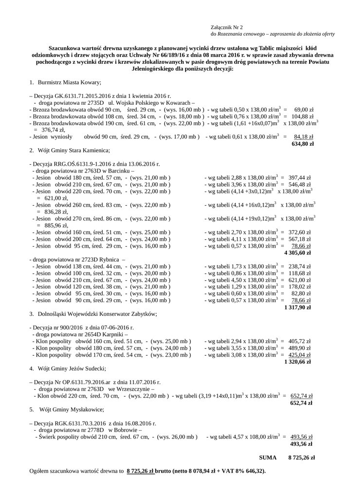 Załącznik Nr 2 do Rozeznania cenowego – zaproszenia do złożenia oferty Szacunkowa wartość drewna uzyskanego z planowanej wycinki drzew ustalona wg Tablic miąższości kłód odziomkowych i drzew stojących oraz Uchwały Nr 66/189/16 z dnia 08 marca 2016 r. w sprawie zasad zbywania drewna pochodzącego z wycinki drzew i krzewów zlokalizowanych w pasie drogowym dróg powiatowych na terenie Powiatu Jeleniogórskiego dla poniższych decyzji: 1. Burmistrz Miasta Kowary; – Decyzja GK.6131.71.2015.2016 z dnia 1 kwietnia 2016 r. - droga powiatowa nr 2735D ul. Wojska Polskiego w Kowarach – - Brzoza brodawkowata obwód 90 cm, śred. 29 cm, - (wys. 16,00 mb ) - wg tabeli 0,50 x 138,00 zł/m3 - Brzoza brodawkowata obwód 108 cm, śred. 34 cm, - (wys. 18,00 mb ) - wg tabeli 0,76 x 138,00 zł/m3 - Brzoza brodawkowata obwód 190 cm, śred. 61 cm, - (wys. 22,00 mb ) - wg tabeli (1,61 +16x0,07)m3 = 376,74 zł, - Jesion wyniosły obwód 90 cm, śred. 29 cm, - (wys. 17,00 mb ) - wg tabeli 0,61 x 138,00 zł/m3 = 69,00 zł = 104,88 zł x 138,00 zł/m3 = 84,18 zł 634,80 zł 2. Wójt Gminy Stara Kamienica; - Decyzja RRG.OŚ.6131.9-1.2016 z dnia 13.06.2016 r. - droga powiatowa nr 2763D w Barcinku – - Jesion obwód 180 cm, śred. 57 cm, - (wys. 21,00 mb ) - Jesion obwód 210 cm, śred. 67 cm, - (wys. 21,00 mb ) - Jesion obwód 220 cm, śred. 70 cm, - (wys. 22,00 mb ) = 621,00 zł, - Jesion obwód 260 cm, śred. 83 cm, - (wys. 22,00 mb ) = 836,28 zł, - Jesion obwód 270 cm, śred. 86 cm, - (wys. 22,00 mb ) = 885,96 zł, - Jesion obwód 160 cm, śred. 51 cm, - (wys. 25,00 mb ) - Jesion obwód 200 cm, śred. 64 cm, - (wys. 24,00 mb ) - Jesion obwód 95 cm, śred. 29 cm, - (wys. 16,00 mb ) - droga powiatowa nr 2723D Rybnica – - Jesion obwód 138 cm, śred. 44 cm, - Jesion obwód 100 cm, śred. 32 cm, - Jesion obwód 210 cm, śred. 67 cm, - Jesion obwód 120 cm, śred. 38 cm, - Jesion obwód 95 cm, śred. 30 cm, - Jesion obwód 90 cm, śred. 29 cm, - (wys. 21,00 mb ) (wys. 20,00 mb ) (wys. 24,00 mb ) (wys. 21,00 mb ) (wys. 16,00 mb ) (wys. 16,00 mb ) - wg tabeli 2,88 x 138,00 zł/m3 = 397,44 zł - wg tabeli 3,96 x 138,00 zł/m3 = 546,48 zł - wg tabeli (4,14 +3x0,12)m3 x 138,00 zł/m3 - wg tabeli (4,14 +16x0,12)m3 x 138,00 zł/m3 - wg tabeli (4,14 +19x0,12)m3 x 138,00 zł/m3 - wg tabeli 2,70 x 138,00 zł/m3 = 372,60 zł - wg tabeli 4,11 x 138,00 zł/m3 = 567,18 zł - wg tabeli 0,57 x 138,00 zł/m3 = 78,66 zł 4 305,60 zł - wg tabeli 1,73 x 138,00 zł/m3 - wg tabeli 0,86 x 138,00 zł/m3 - wg tabeli 4,50 x 138,00 zł/m3 - wg tabeli 1,29 x 138,00 zł/m3 - wg tabeli 0,60 x 138,00 zł/m3 - wg tabeli 0,57 x 138,00 zł/m3 = = = = = = 238,74 zł 118,68 zł 621,00 zł 178,02 zł 82,80 zł 78,66 zł 1 317,90 zł 3. Dolnośląski Wojewódzki Konserwator Zabytków; - Decyzja nr 900/2016 z dnia 07-06-2016 r. - droga powiatowa nr 2654D Karpniki – - Klon pospolity obwód 160 cm, śred. 51 cm, - (wys. 25,00 mb ) - Klon pospolity obwód 180 cm, śred. 57 cm, - (wys. 24,00 mb ) - Klon pospolity obwód 170 cm, śred. 54 cm, - (wys. 23,00 mb ) - wg tabeli 2,94 x 138,00 zł/m3 = 405,72 zł - wg tabeli 3,55 x 138,00 zł/m3 = 489,90 zł - wg tabeli 3,08 x 138,00 zł/m3 = 425,04 zł 1 320,66 zł 4. Wójt Gminy Jeżów Sudecki; – Decyzja Nr OP.6131.79.2016.ar z dnia 11.07.2016 r. - droga powiatowa nr 2763D we Wrzeszczynie – - Klon obwód 220 cm, śred. 70 cm, - (wys. 22,00 mb ) - wg tabeli (3,19 +14x0,11)m3 x 138,00 zł/m3 = 652,74 zł 652,74 zł 5. Wójt Gminy Mysłakowice; – Decyzja RGK.6131.70.3.2016 z dnia 16.08.2016 r. - droga powiatowa nr 2778D w Bobrowie – - Świerk pospolity obwód 210 cm, śred. 67 cm, - (wys. 26,00 mb ) - wg tabeli 4,57 x 108,00 zł/m3 = 493,56 zł 493,56 zł SUMA Ogółem szacunkowa wartość drewna to 8 725,26 zł brutto (netto 8 078,94 zł + VAT 8% 646,32). 8 725,26 zł