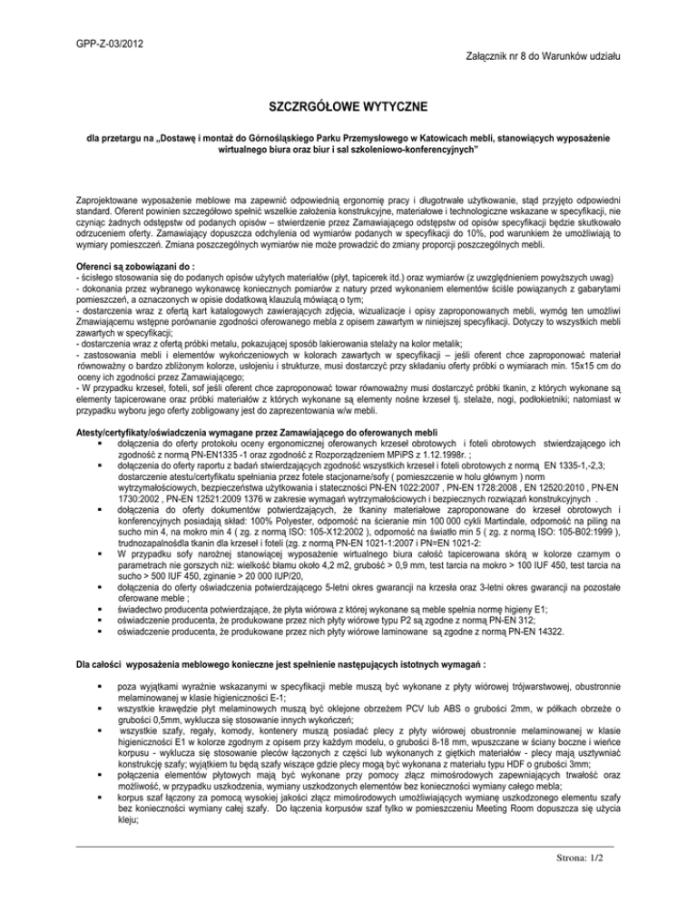 GPP-Z-03/2012 Załącznik nr 8 do Warunków udziału SZCZRGÓŁOWE WYTYCZNE dla przetargu na „Dostawę i montaż do Górnośląskiego Parku Przemysłowego w Katowicach mebli, stanowiących wyposażenie wirtualnego biura oraz biur i sal szkoleniowo-konferencyjnych” Zaprojektowane wyposażenie meblowe ma zapewnić odpowiednią ergonomię pracy i długotrwałe użytkowanie, stąd przyjęto odpowiedni standard. Oferent powinien szczegółowo spełnić wszelkie założenia konstrukcyjne, materiałowe i technologiczne wskazane w specyfikacji, nie czyniąc żadnych odstępstw od podanych opisów – stwierdzenie przez Zamawiającego odstępstw od opisów specyfikacji będzie skutkowało odrzuceniem oferty. Zamawiający dopuszcza odchylenia od wymiarów podanych w specyfikacji do 10%, pod warunkiem że umożliwiają to wymiary pomieszczeń. Zmiana poszczególnych wymiarów nie może prowadzić do zmiany proporcji poszczególnych mebli. Oferenci są zobowiązani do : - ścisłego stosowania się do podanych opisów użytych materiałów (płyt, tapicerek itd.) oraz wymiarów (z uwzględnieniem powyższych uwag) - dokonania przez wybranego wykonawcę koniecznych pomiarów z natury przed wykonaniem elementów ściśle powiązanych z gabarytami pomieszczeń, a oznaczonych w opisie dodatkową klauzulą mówiącą o tym; - dostarczenia wraz z ofertą kart katalogowych zawierających zdjęcia, wizualizacje i opisy zaproponowanych mebli, wymóg ten umożliwi Zmawiającemu wstępne porównanie zgodności oferowanego mebla z opisem zawartym w niniejszej specyfikacji. Dotyczy to wszystkich mebli zawartych w specyfikacji; - dostarczenia wraz z ofertą próbki metalu, pokazującej sposób lakierowania stelaży na kolor metalik; - zastosowania mebli i elementów wykończeniowych w kolorach zawartych w specyfikacji – jeśli oferent chce zaproponować materiał równoważny o bardzo zbliżonym kolorze, usłojeniu i strukturze, musi dostarczyć przy składaniu oferty próbki o wymiarach min. 15x15 cm do oceny ich zgodności przez Zamawiającego; - W przypadku krzeseł, foteli, sof jeśli oferent chce zaproponować towar równoważny musi dostarczyć próbki tkanin, z których wykonane są elementy tapicerowane oraz próbki materiałów z których wykonane są elementy nośne krzeseł tj. stelaże, nogi, podłokietniki; natomiast w przypadku wyboru jego oferty zobligowany jest do zaprezentowania w/w mebli. Atesty/certyfikaty/oświadczenia wymagane przez Zamawiającego do oferowanych mebli dołączenia do oferty protokołu oceny ergonomicznej oferowanych krzeseł obrotowych i foteli obrotowych stwierdzającego ich zgodność z normą PN-EN1335 -1 oraz zgodność z Rozporządzeniem MPiPS z 1.12.1998r. ; dołączenia do oferty raportu z badań stwierdzających zgodność wszystkich krzeseł i foteli obrotowych z normą EN 1335-1,-2,3; dostarczenie atestu/certyfikatu spełniania przez fotele stacjonarne/sofy ( pomieszczenie w holu głównym ) norm wytrzymałościowych, bezpieczeństwa użytkowania i stateczności PN-EN 1022:2007 , PN-EN 1728:2008 , EN 12520:2010 , PN-EN 1730:2002 , PN-EN 12521:2009 1376 w zakresie wymagań wytrzymałościowych i bezpiecznych rozwiązań konstrukcyjnych . dołączenia do oferty dokumentów potwierdzających, że tkaniny materiałowe zaproponowane do krzeseł obrotowych i konferencyjnych posiadają skład: 100% Polyester, odporność na ścieranie min 100 000 cykli Martindale, odporność na piling na sucho min 4, na mokro min 4 ( zg. z normą ISO: 105-X12:2002 ), odporność na światło min 5 ( zg. z normą ISO: 105-B02:1999 ), trudnozapalnośdla tkanin dla krzeseł i foteli (zg. z normą PN-EN 1021-1:2007 i PN=EN 1021-2: W przypadku sofy narożnej stanowiącej wyposażenie wirtualnego biura całość tapicerowana skórą w kolorze czarnym o parametrach nie gorszych niż: wielkość błamu około 4,2 m2, grubość > 0,9 mm, test tarcia na mokro > 100 IUF 450, test tarcia na sucho > 500 IUF 450, zginanie > 20 000 IUP/20, dołączenia do oferty oświadczenia potwierdzającego 5-letni okres gwarancji na krzesła oraz 3-letni okres gwarancji na pozostałe oferowane meble ; świadectwo producenta potwierdzające, że płyta wiórowa z której wykonane są meble spełnia normę higieny E1; oświadczenie producenta, że produkowane przez nich płyty wiórowe typu P2 są zgodne z normą PN-EN 312; oświadczenie producenta, że produkowane przez nich płyty wiórowe laminowane są zgodne z normą PN-EN 14322. Dla całości wyposażenia meblowego konieczne jest spełnienie następujących istotnych wymagań : poza wyjątkami wyraźnie wskazanymi w specyfikacji meble muszą być wykonane z płyty wiórowej trójwarstwowej, obustronnie melaminowanej w klasie higieniczności E-1; wszystkie krawędzie płyt melaminowych muszą być oklejone obrzeżem PCV lub ABS o grubości 2mm, w półkach obrzeże o grubości 0,5mm, wyklucza się stosowanie innych wykończeń; wszystkie szafy, regały, komody, kontenery muszą posiadać plecy z płyty wiórowej obustronnie melaminowanej w klasie higieniczności E1 w kolorze zgodnym z opisem przy każdym modelu, o grubości 8-18 mm, wpuszczane w ściany boczne i wieńce korpusu - wyklucza się stosowanie pleców łączonych z części lub wykonanych z giętkich materiałów - plecy mają usztywniać konstrukcję szafy; wyjątkiem tu będą szafy wiszące gdzie plecy mogą być wykonana z materiału typu HDF o grubości 3mm; połączenia elementów płytowych mają być wykonane przy pomocy złącz mimośrodowych zapewniających trwałość oraz możliwość, w przypadku uszkodzenia, wymiany uszkodzonych elementów bez konieczności wymiany całego mebla; korpus szaf łączony za pomocą wysokiej jakości złącz mimośrodowych umożliwiających wymianę uszkodzonego elementu szafy bez konieczności wymiany całej szafy. Do łączenia korpusów szaf tylko w pomieszczeniu Meeting Room dopuszcza się użycia kleju; Strona: 1/2 GPP-Z -03/2012 Załącznik nr 8 d