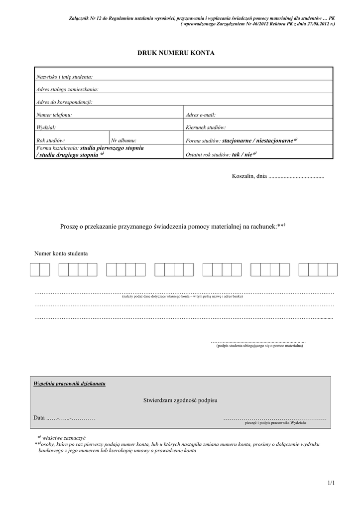 Załącznik Nr 12 do Regulaminu ustalania wysokości, przyznawania i wypłacania świadczeń pomocy materialnej dla studentów … PK ( wprowadzonego Zarządzeniem Nr 46/2012 Rektora PK z dnia 27.08.2012 r.) DRUK NUMERU KONTA Nazwisko i imię studenta: Adres stałego zamieszkania: Adres do korespondencji: Numer telefonu: Adres e-mail: Wydział: Kierunek studiów: Rok studiów: Nr albumu: Forma kształcenia: studia pierwszego stopnia Forma studiów: stacjonarne / niestacjonarne* / studia drugiego stopnia *) Ostatni rok studiów: tak / nie* ) ) Koszalin, dnia ..................................... Proszę o przekazanie przyznanego świadczenia pomocy materialnej na rachunek:**) Numer konta studenta ………………………………………………………………………………………………………………………………………………… (należy podać dane dotyczące własnego konta – w tym pełną nazwę i adres banku) ………………………………………………………………………………………………………………………………………………… …………………………………………………………………………………………………………………………………………........... ….…............................................................. (podpis studenta ubiegającego się o pomoc materialną) Wypełnia pracownik dziekanatu Stwierdzam zgodność podpisu Data ..….-…...-………… …………………………………………… pieczęć i podpis pracownika Wydziału *) właściwe zaznaczyć **)osoby, które po raz pierwszy podają numer konta, lub u których nastąpiła zmiana numeru konta, prosimy o dołączenie wydruku bankowego z jego numerem lub kserokopię umowy o prowadzenie konta 1/1