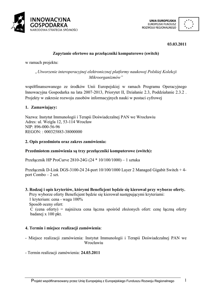 03.03.2011 Zapytanie ofertowe na przełączniki komputerowe (switch) w ramach projektu: „Utworzenie interoperacyjnej elektronicznej platformy naukowej Polskiej Kolekcji Mikroorganizmów” współfinansowanego ze środków Unii Europejskiej w ramach Programu Operacyjnego Innowacyjna Gospodarka na lata 2007-2013, Priorytet II, Działanie 2.3, Poddziałanie 2.3.2 . Projekty w zakresie rozwoju zasobów informacyjnych nauki w postaci cyfrowej 1. Zamawiający: Nazwa: Instytut Immunologii i Terapii Doświadczalnej PAN we Wrocławiu Adres: ul. Weigla 12, 53-114 Wrocław NIP: 896-000-56-96 REGON: : 000325883-38000000 2. Opis przedmiotu oraz zakres zamówienia: Przedmiotem zamówienia są trzy przełączniki komputerowe (switch): Przełącznik HP ProCurve 2810-24G (24 * 10/100/1000) – 1 sztuka Przełącznik D-Link DGS-3100-24 24-port 10/100/1000 Layer 2 Managed Gigabit Switch + 4port Combo – 2 szt. 3. Rodzaj i opis kryteriów, którymi Beneficjent będzie się kierował przy wyborze oferty. Przy wyborze oferty Beneficjent będzie się kierował następującymi kryteriami: 1 kryterium: cena - waga 100% Sposób oceny ofert: C (cena oferty) = najniższa cena łączna spośród złożonych ofert: cenę łączną oferty badanej x 100 pkt. 4. Termin i miejsce realizacji zamówienia: - Miejsce realizacji zamówienia: Instytut Immunologii i Terapii Doświadczalnej PAN we Wrocławiu - Termin realizacji zamówienia: 24.03.2011 Projekt współfinansowany przez Unię Europejską z Europejskiego Funduszu Rozwoju Regionalnego 1 5. Miejsce, sposób i termin składania ofert. Oferty można złożyć w zamkniętej kopercie w siedzibie Zamawiającego. Oferta może być przekazana pocztą elektroniczną na adres: [email protected] w terminie do dnia: 10.03.2011 6. Opis warunków udziału w postępowaniu: 1) O zamówienie może ubiegać się wykonawca, który posiada uprawnienia do wykonywania określonej działalności lub czynności, jeżeli ustawy nakładają obowiązek posiadania takich uprawnień. 2) Ocena spełniania warunków udziału w postępowaniu dokonana będzie w następujący sposób: spełnia, nie spełnia. 3) Oferta powinna zawierać: - nazwę i adres oferenta - opis nawiązujący do przedmiotu zamówienia - wartość oferty 7. Rozstrzygniecie postępowania i zlecenie realizacji zamówienia 1) Postępowanie ofertowe zostanie rozstrzygnięte najpóźniej w dniu 17.03.2010 2) O wynikach postępowania jego uczestnicy zostaną poinformowani drogą telefoniczną lub mailową. 8. Sposób udzielania informacji i wyjaśnień Szczegółowych informacji na temat przedmiotu zamówienia udziela dr Agnieszka Korzeniowska-Kowal, e-mail: [email protected] Projekt współfinansowany przez Unię Europejską z Europejskiego Funduszu Rozwoju Regionalnego 2