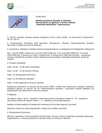 Miasto Żywiec 34-300 Żywiec, Rynek 2 33-475-42-00, 33-475-42-01 30.06.2016 Międzynarodowe Zawody w Skokach Narciarskich na Igielicie o Puchar Gilowic „Nadzieje Beskidzkie”-zapraszamy! 1. Termin i miejsce: Zawody zostaną rozegrane w dniu 2 lipca 2016r. na skoczniach w Gilowicach. HS 19 i HS 25 2. Organizatorzy: Parafialny Klub Sportowy „Olimpijczyk” Gilowice, Śląsko-Beskidzki Związek Narciarski w Wiśle oraz Gmina Gilowice 3. Uczestnicy i kategorie: Zawody zostaną przeprowadzone w następujących kategoriach wiekowych: Kat. I rocznik 2009 i młodsi Kat. II rocznik 2007-2008 Kat. III rocznik 2005-2006 Kat. IV rocznik 2003-2004 Kat. V dziewczyny 2005 i młodsze Kat. VI dziewczyny OPEN Kat.VII Open – wystartują wszyscy niezależnie od wieku, którzy zgłoszą się do zawodów i posiadają odpowiedni sprzęt do skoków. 4. Program Zawodów Godz. 10.00 – 12.00 skoki treningowe Godz. 12.00 – 12.30 otwarty trening Godz. 12.30 odprawa techniczna Godz. 12.45 otwarcie zawodów Godz. 13.00 rozpoczęcie konkursu skoków Rozpoczną zawodnicy na skoczni HS 19 rocznik 2005 i młodsi oraz dziewczyny młodsze. Pozostałe kategorie skaczą na skoczni HS 25. Podsumowanie zawodów i wręczenie nagród odbędzie się bezpośrednio po zakończeniu konkursu skoków. 5.Nagrody: Za zajęcie miejsc I do III – zawodnicy otrzymają puchary Za zajęcie miejsc IV – VI – zawodnicy otrzymają medale Za zajęcie miejsc I – X – zawodnicy otrzymają dyplomy. Najlepsi w poszczególnych kategoriach wiekowych otrzymają nagrody rzeczowe. Wszyscy uczestnicy otrzymają posiłek i napoje oraz słodkie upominki. 6. Postanowienia końcowe: Wszyscy zawodnicy musza posiadać aktualne karty zdrowia. Koszty organizacji zawodów pokrywają organizatorzy, a koszty przyjazdu na zawody kluby we własnych zakresie. Strona 1/2 Miasto Żywiec 34-300 Żywiec, Rynek 2 33-475-42-00, 33-475-42-01 7. Akceptując powyższy regulamin uczestnicy Międzynarodowych Zawodów w Skokach Narciarskich na Igielicie o Puchar Gilowic „Nadzieje Beskidzkie” wyrażają z tym samym zgodę na wykorzystywanie przez organizatora zdjęć i innych informacji do celów promocyjnych. 8. Zgłoszenia - będą przyjmowane do dnia 28.06.2016r. w następującej formie: Telefonicznie: 33 8653065 ( Pasko Henryk) Elektronicznie: email: [email protected] Strona 2/2 Powered by TCPDF (www.tcpdf.org)