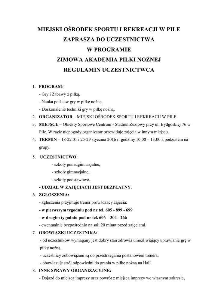 MIEJSKI OŚRODEK SPORTU I REKREACJI W PILE ZAPRASZA DO UCZESTNICTWA W PROGRAMIE ZIMOWA AKADEMIA PIŁKI NOŻNEJ REGULAMIN UCZESTNICTWCA 1. PROGRAM: - Gry i Zabawy z piłką. - Nauka podstaw gry w piłkę nożną. - Doskonalenie techniki gry w piłkę nożną. 2. ORGANIZATOR – MIEJSKI OŚRODEK SPORTU I REKREACJI W PILE 3. MIEJSCE – Obiekty Sportowe Centrum - Stadion Żużlowy przy ul. Bydgoskiej 76 w Pile. W razie niepogody organizator przewiduje zajęcia w innym miejscu. 4. TERMIN – 18-22.01 i 25-29 stycznia 2016 r. godziny 10:00 – 13:00 z podziałem na grupy. 5. UCZESTNICTWO: - szkoły ponadgimnazjalne, - szkoły gimnazjalne, - szkoły podstawowe. - UDZIAŁ W ZAJĘCIACH JEST BEZPŁATNY. 6. ZGŁOSZENIA: - zgłoszenia przyjmuje trener prowadzący zajęcia: - w pierwszym tygodniu pod nr tel. 605 - 899 - 699 - w drugim tygodniu pod nr tel. 606 – 304 - 266 - ewentualnie bezpośrednio na sali 20 minut przed zajęciami. 7. OBOWIĄZKI UCZESTNIKA: - od uczestników wymagany jest dobry stan zdrowia umożliwiający uprawianie grę w piłkę nożną, - uczestnicy zobowiązani są do przestrzegania postanowień trenera, - obowiązuje strój odpowiedni do grania w piłkę nożną na Hali. 8. INNE SPRAWY ORGANIZACYJNE: - Dojazd do miejsca imprezy oraz powrót z miejsca imprezy we własnym zakresie, - Opiekunowie prawni sami w swoim zakresie dostarczają i odbierają uczestnika zajęć z miejsca imprezy. - Zapoznanie się z treścią i przestrzeganie regulaminu obiektu sportowego Centrum oraz hali sportowej. - Zawodnicy biorą udział w zajęciach na własną odpowiedzialność, - Zawodnicy biorą udział w zajęciach za obopólną zgodą rodziców, - Zgłoszenie do udziału w zajęciach odbywa się poprzez wypełnienie KARTY ZGŁOSZENIA dostępnej w kasie na Pływalni Wodnik lub do pobrania na stronie www.mosir.pila.pl. - Organizator nie ponosi odpowiedzialności za szkody poniesione podczas zajęć, - Uczestnicy zajęć ubezpieczeni są od następstw nieszczęśliwych wypadków podczas trwania imprezy, - Organizator zastrzega sobie prawo dokonania zmian w niniejszym regulaminie oraz ostatecznej interpretacji wszelkich kwestii spornych. ORGANIZATOR DYREKTOR MOSIR PIŁA