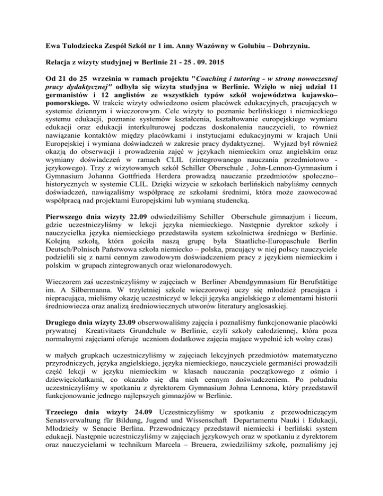 Ewa Tułodziecka Zespół Szkół nr 1 im. Anny Wazówny w Golubiu – Dobrzyniu. Relacja z wizyty studyjnej w Berlinie 21 - 25 . 09. 2015 Od 21 do 25 września w ramach projektu "Coaching i tutoring - w stronę nowoczesnej pracy dydaktycznej" odbyła się wizyta studyjna w Berlinie. Wzięło w niej udział 11 germanistów i 12 anglistów ze wszystkich typów szkół województwa kujawsko– pomorskiego. W trakcie wizyty odwiedzono osiem placówek edukacyjnych, pracujących w systemie dziennym i wieczorowym. Cele wizyty to poznanie berlińskiego i niemieckiego systemu edukacji, poznanie systemów kształcenia, kształtowanie europejskiego wymiaru edukacji oraz edukacji interkulturowej podczas doskonalenia nauczycieli, to również nawiązanie kontaktów między placówkami i instytucjami edukacyjnymi w krajach Unii Europejskiej i wymiana doświadczeń w zakresie pracy dydaktycznej. Wyjazd był również okazją do obserwacji i prowadzenia zajęć w językach niemieckim oraz angielskim oraz wymiany doświadczeń w ramach CLIL (zintegrowanego nauczania przedmiotowo językowego). Trzy z wizytowanych szkół Schiller Oberschule , John-Lennon-Gymnasium i Gymnasium Johanna Gottfrieda Herdera prowadzą nauczanie przedmiotów społeczno– historycznych w systemie CLIL. Dzięki wizycie w szkołach berlińskich nabyliśmy cennych doświadczeń, nawiązaliśmy współpracę ze szkołami średnimi, która może zaowocować współpracą nad projektami Europejskimi lub wymianą studencką. Pierwszego dnia wizyty 22.09 odwiedziliśmy Schiller Oberschule gimnazjum i liceum, gdzie uczestniczyliśmy w lekcji języka niemieckiego. Następnie dyrektor szkoły i nauczycielka języka niemieckiego przedstawiła system szkolnictwa średniego w Berlinie. Kolejną szkołą, która gościła naszą grupę była Staatliche-Europaschule Berlin Deutsch/Polnisch Państwowa szkoła niemiecko – polska, pracujący w niej polscy nauczyciele podzielili się z nami cennym zawodowym doświadczeniem pracy z językiem niemieckim i polskim w grupach zintegrowanych oraz wielonarodowych. Wieczorem zaś uczestniczyliśmy w zajęciach w Berliner Abendgymnasium für Berufstätige im. A Silbermanna. W trzyletniej szkole wieczorowej uczy się młodzież pracująca i niepracująca, mieliśmy okazję uczestniczyć w lekcji języka angielskiego z elementami historii średniowiecza oraz analizą średniowiecznych utworów literatury anglosaskiej. Drugiego dnia wizyty 23.09 obserwowaliśmy zajęcia i poznaliśmy funkcjonowanie placówki prywatnej Kreativitaets Grundchule w Berlinie, czyli szkoły całodziennej, która poza normalnymi zajęciami oferuje uczniom dodatkowe zajęcia mające wypełnić ich wolny czas) w małych grupkach uczestniczyliśmy w zajęciach lekcyjnych przedmiotów matematyczno przyrodniczych, języka angielskiego, języka niemieckiego, nauczyciele germaniści prowadzili część lekcji w języku niemieckim w klasach nauczania początkowego z ośmio i dziewięciolatkami, co okazało się dla nich cennym doświadczeniem. Po południu uczestniczyliśmy w spotkaniu z dyrektorem Gymnasium Johna Lennona, który przedstawił funkcjonowanie jednego najlepszych gimnazjów w Berlinie. Trzeciego dnia wizyty 24.09 Uczestniczyliśmy w spotkaniu z przewodniczącym Senatsverwaltung für Bildung, Jugend und Wissenschaft Departamentu Nauki i Edukacji, Młodzieży w Senacie Berlina. Przewodniczący przedstawił niemiecki i berliński system edukacji. Następnie uczestniczyliśmy w zajęciach językowych oraz w spotkaniu z dyrektorem oraz nauczycielami w technikum Marcela – Breuera, zwiedziliśmy szkołę, poznaliśmy jej profil zawodowy. Po południu wzięliśmy udział w placówce doskonalenia nauczycieli, Schulpraktisches Seminar Friedrichshain-Kreuzberg Nauczyciele aktywni zawodowo, zdobywają dodatkowe umiejętności przed przystąpieniem do egzaminu państwowego, po którym uzyskają pełne kwalifikacje zawodowe. Czwartego dnia wizyty 25.09 zapoznaliśmy się z funkcjonowaniem Gymnasiums JohannaGottfrieda-Herdera, gdzie wymieniliśmy doświadczenia w prowadzeniu zajęć języka obcego, porównaliśmy polskie podejście w dydaktyce języka obcego do doświadczeń naszych niemieckich kolegów. System szkolnictwa w Niemczech pozostaje pod nadzorem państwa. System różni się jednak w poszczególnych krajach związkowych, ponieważ zachowują one niezależność w tej kwestii od władzy centralnej, a decyzje w sprawach dotyczących edukacji podejmują odpowiednie dla danego landu ministerstwa oświaty i wychowania. Istnieje wiele rodzajów szkół. Najogólniej można je podzielić na szkoły ogólnokształcące (Allgemainbildende Schulen) i zawodowe (Berufsbildende Schulen). Obowiązek szkolny obowiązuje w Niemczech od ukończenia szóstego do osiemnastego roku życia, czyli trwa 12 lat. Uczęszczanie do szkół publicznych jest bezpłatne. W pierwszym okresie nauki wszystkie dzieci uczęszczają do szkół podstawowych (Grundschule). W większości landów są one czteroletnie. Wyjątek stanowią właśnie Berlin i Brandenburgia, gdzie jest to 6 lat. W tak zwanej fazie elastycznego rozpoczęcia szkoły (Flexiblen Schuleingangsphase) dzieci rok przed rozpoczęciem obowiązku szkolnego mogą zapisać się do szkoły i rozpocząć naukę. Po zakończeniu nauki na poziomie podstawowym uczniowie rozpoczynają drugi etap kształcenia ogólnokształcącego na poziomie średnim, ten okres nauki rozpoczyna się w Branderburgii i Berlinie w 7 klasie. W tradycyjnym trzystopniowym systemie szkolnictwa uczniowie mogą wybierać zazwyczaj spośród trzech rodzajów szkół ogólnokształcących: szkoły głównej (Hauptschule), szkoły realnej (Realschule) i gimnazjum (Gymnasium). Większość szkół średnich: szkoła główna, szkoła realna, czy gimnazjum kończy się po 9 lub 10 klasie egzaminem i uprawnia do zdobycia zawodu lub do podjęcia studiów na uczelni wyższej, w zależności od ilości zdanych egzaminów i wybranego profi