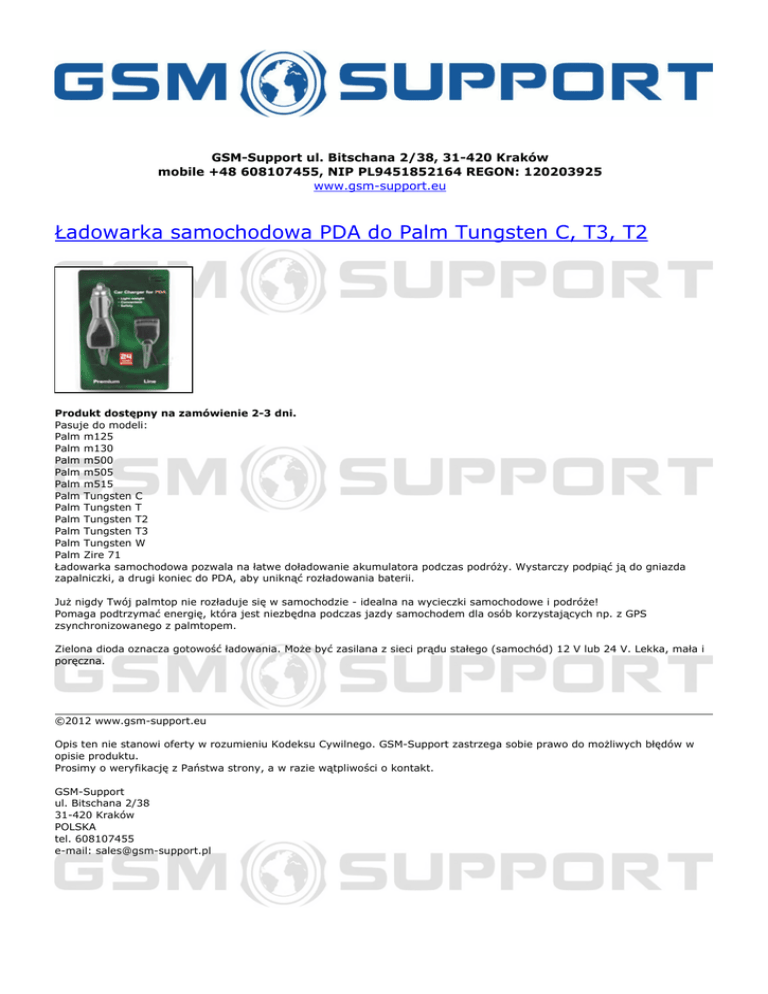 GSM-Support ul. Bitschana 2/38, 31-420 Kraków mobile +48 608107455, NIP PL9451852164 REGON: 120203925 www.gsm-support.eu Ładowarka samochodowa PDA do Palm Tungsten C, T3, T2 Produkt dostępny na zamówienie 2-3 dni. Pasuje do modeli: Palm m125 Palm m130 Palm m500 Palm m505 Palm m515 Palm Tungsten C Palm Tungsten T Palm Tungsten T2 Palm Tungsten T3 Palm Tungsten W Palm Zire 71 Ładowarka samochodowa pozwala na łatwe doładowanie akumulatora podczas podróży. Wystarczy podpiąć ją do gniazda zapalniczki, a drugi koniec do PDA, aby uniknąć rozładowania baterii. Już nigdy Twój palmtop nie rozładuje się w samochodzie - idealna na wycieczki samochodowe i podróże! Pomaga podtrzymać energię, która jest niezbędna podczas jazdy samochodem dla osób korzystających np. z GPS zsynchronizowanego z palmtopem. Zielona dioda oznacza gotowość ładowania. Może być zasilana z sieci prądu stałego (samochód) 12 V lub 24 V. Lekka, mała i poręczna. ©2012 www.gsm-support.eu Opis ten nie stanowi oferty w rozumieniu Kodeksu Cywilnego. GSM-Support zastrzega sobie prawo do możliwych błędów w opisie produktu. Prosimy o weryfikację z Państwa strony, a w razie wątpliwości o kontakt. GSM-Support ul. Bitschana 2/38 31-420 Kraków POLSKA tel. 608107455 e-mail: [email protected] Powered by TCPDF (www.tcpdf.org)