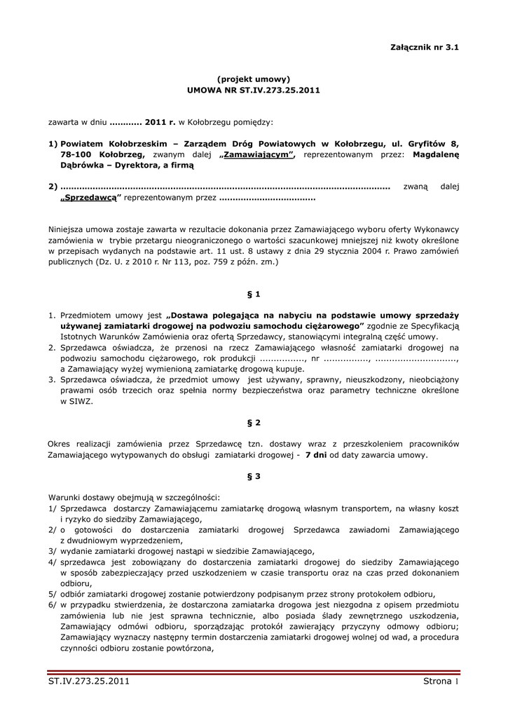 Załącznik nr 3.1 (projekt umowy) UMOWA NR ST.IV.273.25.2011 zawarta w dniu ………... 2011 r. w Kołobrzegu pomiędzy: 1) Powiatem Kołobrzeskim – Zarządem Dróg Powiatowych w Kołobrzegu, ul. Gryfitów 8, 78-100 Kołobrzeg, zwanym dalej „Zamawiającym”, reprezentowanym przez: Magdalenę Dąbrówka – Dyrektora, a firmą 2) …………………………………………………………………………………………………………... „Sprzedawcą” reprezentowanym przez ……………………………… zwaną dalej Niniejsza umowa zostaje zawarta w rezultacie dokonania przez Zamawiającego wyboru oferty Wykonawcy zamówienia w trybie przetargu nieograniczonego o wartości szacunkowej mniejszej niż kwoty określone w przepisach wydanych na podstawie art. 11 ust. 8 ustawy z dnia 29 stycznia 2004 r. Prawo zamówień publicznych (Dz. U. z 2010 r. Nr 113, poz. 759 z późn. zm.) §1 1. Przedmiotem umowy jest „Dostawa polegająca na nabyciu na podstawie umowy sprzedaży używanej zamiatarki drogowej na podwoziu samochodu ciężarowego” zgodnie ze Specyfikacją Istotnych Warunków Zamówienia oraz ofertą Sprzedawcy, stanowiącymi integralną część umowy. 2. Sprzedawca oświadcza, że przenosi na rzecz Zamawiającego własność zamiatarki drogowej na podwoziu samochodu ciężarowego, rok produkcji ................, nr ................, ............................., a Zamawiający wyżej wymienioną zamiatarkę drogową kupuje. 3. Sprzedawca oświadcza, że przedmiot umowy jest używany, sprawny, nieuszkodzony, nieobciążony prawami osób trzecich oraz spełnia normy bezpieczeństwa oraz parametry techniczne określone w SIWZ. §2 Okres realizacji zamówienia przez Sprzedawcę tzn. dostawy wraz z przeszkoleniem pracowników Zamawiającego wytypowanych do obsługi zamiatarki drogowej - 7 dni od daty zawarcia umowy. §3 Warunki dostawy obejmują w szczególności: 1/ Sprzedawca dostarczy Zamawiającemu zamiatarkę drogową własnym transportem, na własny koszt i ryzyko do siedziby Zamawiającego, 2/ o gotowości do dostarczenia zamiatarki drogowej Sprzedawca zawiadomi Zamawiającego z dwudniowym wyprzedzeniem, 3/ wydanie zamiatarki drogowej nastąpi w siedzibie Zamawiającego, 4/ sprzedawca jest zobowiązany do dostarczenia zamiatarki drogowej do siedziby Zamawiającego w sposób zabezpieczający przed uszkodzeniem w czasie transportu oraz na czas przed dokonaniem odbioru, 5/ odbiór zamiatarki drogowej zostanie potwierdzony podpisanym przez strony protokołem odbioru, 6/ w przypadku stwierdzenia, że dostarczona zamiatarka drogowa jest niezgodna z opisem przedmiotu zamówienia lub nie jest sprawna technicznie, albo posiada ślady zewnętrznego uszkodzenia, Zamawiający odmówi odbioru, sporządzając protokół zawierający przyczyny odmowy odbioru; Zamawiający wyznaczy następny termin dostarczenia zamiatarki drogowej wolnej od wad, a procedura czynności odbioru zostanie powtórzona, ST.IV.273.25.2011 Strona 1 7/ w przypadku wykrycia wad, usterek lub niezgodności zamiatarki drogowej z warunkami podanymi w ofercie przetargowej w trakcie odbioru, Zmawiający odmówi dokonania odbioru, 8/ wykrycie wad lub usterek zamiatarki drogowej po odbiorze nie pozbawia Zmawiającego uprawnień wynikających z umowy oraz możliwości dochodzenia od Sprzedawcy roszczeń na zasadach ogólnych. §4 1. Szczegółowy opis techniczny przedmiotu umowy zawiera Specyfikacja Istotnych Warunków Zamówienia oraz oferta Sprzedawcy, stanowiące integralną część umowy. 2. Sprzedawca oświadcza, że zamiatarka drogowa stanowi jego własność, jest wolna od wad prawnych oraz praw osób trzecich, nie toczy się żadne postępowanie, którego byłaby przedmiotem oraz, że nie stanowi przedmiotu zabezpieczenia. §5 1. Strony ustalają cenę ryczałtową za przedmiot umowy: cena netto: ……………… zł słownie: …………………………………………………………………………………………………………… podatek VAT ……… %: ………………… zł słownie: ……………………………………………………………………………………… cena brutto: ………………… zł słownie: ……………………………………………………………………………………………………… 2. Cena ryczałtowa jest ceną niezmienną i obejmuje wszystkie koszty i opłaty, jakie zobowiazany będzie ponieść Sprzedawca, niezbędne do wykonania przedmiotu umowy, w tym koszty przeszkolenia pracowników Zamawiającego oraz koszty wynikające z § 3 umowy. §6 Zapłata dokonana będzie po dostarczeniu zamiatarki drogowej do siedziby Zamawiającego oraz przeszkoleniu pracowników Zamawiającego z obsługi i zasad bhp, na podstawie faktury wystawionej przez Sprzedawcę. §7 1. Zamawiający zobowiązany jest dokonać zapłaty faktury wystawionej przez Sprzedawcę w ciągu 14 dni od daty jej otrzymania. 2. Za datę zapłaty uważa się dzień obciążenia rachunku bankowego Zamawiającego. 3. Za przekroczenie terminu zapłaty, Sprzedawcy przysługują odsetki za opóźnienie w wysokości ustawowej. 4. Sprzedawca nie może bez pisemnej zgody Zamawiającego zbyć wierzytelności wynikającej z umowy. §8 1. Sprzedawca gwarantuje Zamawiającemu należytą jakość, sprawność, funkcjonalność, parametry techniczne zamiatarki drogowej. 2. Sprzedawca zobowiązany jest do wystawienia gwarancji na okres ……… miesięcy na zamiatarkę drogową przed podpisaniem umowy. W przypadku braku gwarancji, Zamawiający ma prawo odmówić przyjęcia zamiatarki. 3. Sprzedawca jako podmiot świadczący gwarancję przystąpi do usuwania awarii, usterki lub wady nie później niż w terminie 2 dni roboczych od otrzymania zgłoszenia (pisemnie lub fax-em). 4. W przypadku nieusunięcia przez Sprzedawcę awarii, usterki lub wady w terminie wymaganym przez Zamawiającego lub w przypadku braku reakcji na zawiadomienie o awarii, usterce, wadz