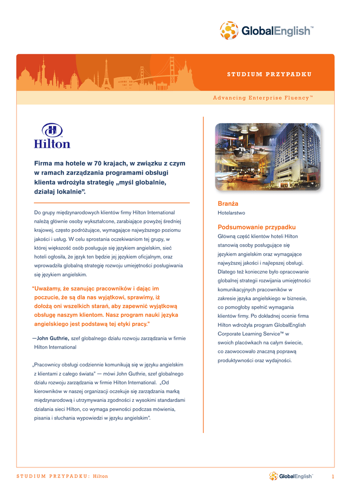 S T U D I U M PCRAZS Y U E PSATD UK DY Advancing Enterprise Fluency™ Firma ma hotele w 70 krajach, w związku z czym w ramach zarządzania programami obsługi klienta wdrożyła strategię „myśl globalnie, działaj lokalnie”. Branża Do grupy międzynarodowych klientów firmy Hilton International należą głównie osoby wykształcone, zarabiające powyżej średniej krajowej, często podróżujące, wymagające najwyższego poziomu jakości i usług. W celu sprostania oczekiwaniom tej grupy, w której większość osób posługuje się językiem angielskim, sieć hoteli ogłosiła, że język ten będzie jej językiem oficjalnym, oraz wprowadziła globalną strategię rozwoju umiejętności posługiwania się językiem angielskim. “Uważamy, że szanując pracowników i dając im poczucie, że są dla nas wyjątkowi, sprawimy, iż dołożą oni wszelkich starań, aby zapewnić wyjątkową obsługę naszym klientom. Nasz program nauki języka angielskiego jest podstawą tej etyki pracy.” —John Guthrie, szef globalnego działu rozwoju zarządzania w firmie Hilton International „Pracownicy obsługi codziennie komunikują się w języku angielskim Hotelarstwo Podsumowanie przypadku Główną część klientów hoteli Hilton stanowią osoby posługujące się językiem angielskim oraz wymagające najwyższej jakości i najlepszej obsługi. Dlatego też konieczne było opracowanie globalnej strategii rozwijania umiejętności komunikacyjnych pracowników w zakresie języka angielskiego w biznesie, co pomogłoby spełnić wymagania klientów firmy. Po dokładnej ocenie firma Hilton wdrożyła program GlobalEnglish Corporate Learning Service™ w swoich placówkach na całym świecie, co zaowocowało znaczną poprawą produktywności oraz wydajności. z klientami z całego świata” — mówi John Guthrie, szef globalnego działu rozwoju zarządzania w firmie Hilton International. „Od kierowników w naszej organizacji oczekuje się zarządzania marką międzynarodową i utrzymywania zgodności z wysokimi standardami działania sieci Hilton, co wymaga pewności podczas mówienia, pisania i słuchania wypowiedzi w języku angielskim”. S T U D I U M P R Z Y P A D K U : Hilton 1 Zatrudnianie najlepszych osób w branży hotelarskiej Obietnica marki Hilton — „Hilton puts back a little of what life takes out” — zobowiązuje do tego, aby stale zapewniać najwyższy poziom obsługi klienta. Główną strategią umożliwiającą spełnianie obietnicy marki jest przyciąganie i utrzymanie najbardziej uzdolnionych osób w branży hotelarskiej na świecie. Firma Hilton International odróżnia się od konkurencji, zapewniając szkolenia tym członkom swoich zespołów, którzy cenią sobie możliwość doskonalenia umiejętności posługiwania się językiem angielskim. Odpowiednie umiejętności językowe sprawiają, że zdolności stają się łatwiejsze do przekazania, umożliwiając firmie szybsze wprowadzanie nowych produktów i ustalanie standardów doskonałego zarządzania na całym świecie. „Naszym celem jest zmiana kultury organizacyjnej w firmie, co pozwoli nam konsekwentnie wywiązywać się z obietnicy danej naszym klientom w wymiarze ogólnoświatowym” — mówi John Guthrie. Podejście edukacyjne Firma Hilton International ustaliła, że najlepszym rozwiązaniem są kursy języka angielskiego online. „Wiedzieliśmy, że nasz sukces będzie zależeć od produktu o najwyższej jakości, z którego można by było korzystać spokojnie i łatwo” — mówi Rosie Hollis, wiceprezes działu kadr na region Bliskiego Wschodu/Azji i Pacyfiku w firmie Hilton International. Rozwiązanie online dałoby nam też szansę uzyskania wiedzy na temat tego, którzy z naszych pracowników są szkoleni, czego się uczą i jaki wpływ ma to na ich możliwości, w ramach jednej organizacji i całej sieci”. Cele firmy Hilton International związane z programem nauczania języka angielskiego były następujące: • Zmaksymalizowanie możliwości wiążących się z globalną działalnością sieci Hilton przez umożliwienie pracownikom o wysokim potencjale przyczyniania się do jej rozwoju, niezależnie od ograniczeń geograficznych. • Wspomaganie wysiłków zmierzających do dywersyfikacji wśród osób zatrudnionych w firmie Hilton i sprawienie, aby obsługą jej hoteli zajmowali się obywatele poszczególnych krajów. • Wdrożenie programu nauczania języka angielskiego dostosowanego do różnych poziomów znajomości języka wśród uczestników, umożliwiającego wyrównanie umiejętności przy jednoczesnym zmaksymalizowaniu efektywności inwestycji w szkolenia. • Rozwinięcie sprawności operacyjnej w ramach światowej organizacji przy jednoczesnym ograniczeniu kosztów. S T U D I U M P R Z Y P A D K U : Hilton 2 Po dokładnych poszukiwaniach firma Hilton International wybrała program GlobalEnglish. „Program GlobalEnglish Corporate Learning Service zapewnia jak dotąd najlepsze funkcje i najłatwiejszą nawigację. Poziom interaktywności jest wysoki, a obsługa jest doskonała. Jesteśmy pod wrażeniem również dlatego, że program GlobalEnglish rozwija wszystkie niezbędne umiejętności związane z posługiwaniem się językiem angielskim: czytanie, pisanie, słuchanie, i mówienie” — dodaje Guthrie. Wyniki Firma Hilton International uzyskała doskonałe wyniki w programie GlobalEnglish. Po korzystaniu z programu GlobalEnglish Corporate Learning Service™ przez niespełna rok 92% uczących się osób stwierdziło, że udało im się już wykorzystać w pracy nowo poznany materiał językowy. Większość uczących się osób z firmy Hilton International zauważyła poprawę wyników w pracy. Ogólnie 71% pracowników firmy Hilton International dzięki lepszej znajomości języka angielskiego mogło zaoszczędzić ponad godzinę tygodniowo: umiejętność odpowiadania na pytania, reagowania na prośby i oferowania pomocy w języku angielskim umiejętności