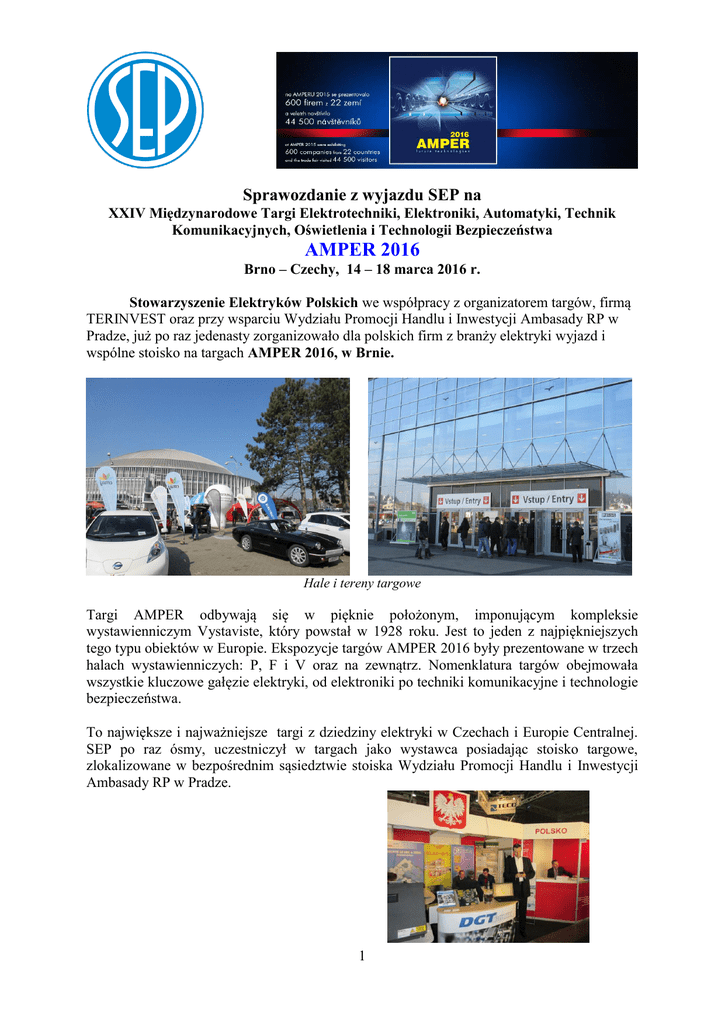 Sprawozdanie z wyjazdu SEP na XXIV Międzynarodowe Targi Elektrotechniki, Elektroniki, Automatyki, Technik Komunikacyjnych, Oświetlenia i Technologii Bezpieczeństwa AMPER 2016 Brno – Czechy, 14 – 18 marca 2016 r. Stowarzyszenie Elektryków Polskich we współpracy z organizatorem targów, firmą TERINVEST oraz przy wsparciu Wydziału Promocji Handlu i Inwestycji Ambasady RP w Pradze, już po raz jedenasty zorganizowało dla polskich firm z branży elektryki wyjazd i wspólne stoisko na targach AMPER 2016, w Brnie. Hale i tereny targowe Targi AMPER odbywają się w pięknie położonym, imponującym kompleksie wystawienniczym Vystaviste, który powstał w 1928 roku. Jest to jeden z najpiękniejszych tego typu obiektów w Europie. Ekspozycje targów AMPER 2016 były prezentowane w trzech halach wystawienniczych: P, F i V oraz na zewnątrz. Nomenklatura targów obejmowała wszystkie kluczowe gałęzie elektryki, od elektroniki po techniki komunikacyjne i technologie bezpieczeństwa. To największe i najważniejsze targi z dziedziny elektryki w Czechach i Europie Centralnej. SEP po raz ósmy, uczestniczył w targach jako wystawca posiadając stoisko targowe, zlokalizowane w bezpośrednim sąsiedztwie stoiska Wydziału Promocji Handlu i Inwestycji Ambasady RP w Pradze. 1 SEP udostępnił swoje stoisko uczestnikom wyjazdu – dla wyłożenia materiałów reklamowych: eksponatów, banerów, katalogów, folderów, płyt CD itp. oraz dla spotkań i przeprowadzania rozmów. Stoiska SEP i WPHiI Ambasady RP w Pradze Stoisko SEP - W. Hetmańska – ELKO-BIS Milan Wenit -Kierownik – Radca WPHiI Ambasady RP w Pradze Od lewej:M. Juraszek, A. Dzięcioł, J. Nowastowski, E.Biel, M. Wenit Na bazie wieloletniej współpracy stoiska SEP i WPHiI Ambasady RP w Pradze znajdowały się w bezpośrednim sąsiedztwie, a stworzone wspólne stoisko z górującym nad nim polskim godłem, stanowiło godną reprezentację naszego kraju. Ambasadę reprezentował Pan Milan Wenit – Kierownik WPHiI/Radca oraz Pan Krzysztof Dębiec I Sekretarz WPHiI. AMPER 2016 w liczbach: 605 wystawców z 23 krajów (w tym 149 wystawców z zagranicy: Słowacja 48, Niemcy 23, Austria 18, Polska 14, Szwajcaria 7, Taiwan 6, Chiny 6, Węgry 5, Francja 4, Wielka Brytania 3, Rosja 3, Belgia 2, Holandia 1, Chorwacja 1, Hiszpania 1, Włochy 1, Norwegia 1, Turcja 1, Ukraina 1, Rumunia 1, Indie 1, Korea Południowa 1) Ekspozycja obejmowała łącznie 30 500 metrów kwadratowych powierzchni wystawienniczej. 27 eksponatów zostało zgłoszonych przez 20 wystawców do konkursu GOLDEN AMPER 2016, na najlepszy produkt targowy 32 godziny transmisji na żywo ze sceny AMPER FORUM zostało transmitowanych przez redakcję Elektrika.tv ponad 45 000 zwiedzających odwiedziło tragi 2 Uczestnicy wyjazdu, przedstawiciele firm na stoisku SEP: 1) POLSKA IZBA GOSPODARCZA ELEKTROTECHNIKI /PIGE/- Bydgoszcz Janusz Nowastowski – Wiceprezes Zarządu/Dyrektor Biura 2) ELECTRIC POWER QUALITY Sp. z o.o. - Gdańsk Drugi od lewej: Grzegorz Pinker – Engineering Commercial Manager i Marek Juraszek – Business Development Manager 3) ELKO-BIS Systemy Odgromowe Sp. z o.o. – Wrocław Od lewej: Wioleta Hetmańska – ELKO-BIS Specjalista ds. Exportu i Anna Dzięcioł – SEP Panowie Martin Chmelik/Stepan Rapp przedstawiciele firmy ELKO-BIS na Czechy, byli również na zmianę uczestnikami naszego stoiska i chętnie służyli nam pomocą. 3 4) POLFER Podzespoły Indukcyjne S.A. – Łosice Joanna Iwaniuk – Sales Manager i Leszek Kordaczuk – Kierownik Działu Rozwoju i Technologii 5) DGTronik Sp. z o.o. – Straszyn Emilia Kukla – Key accounts; i Tomasz Janke – Sales Representative; 6) ANDRA Sp. z o.o. – Warszawa Od lewej: Janusz. Nowastowski-PIGE; Konrad Miszkurka – ANDRA-.Koordynator Projektów; Krzysztof Dębiec – WPHiI Ambasady RP w Pradze 4 7) SICAME Polska Sp. z o.o. – Warszawa Od lewej: Wojciech Zientalak – Dyrektor Techniczny ds. Rozwoju Biznesu Marcin Rutkowski – Prezes Zarządu; Milan Wenit Radca WPHiI Ambasady RP w Pradze 8) Stowarzyszenie Elektryków Polskich /SEP/ – Warszawa Anna Dzięcioł – Specjalista - Dział Naukowy/ SEP Foreign Relations/Koordynator wyjazdu Na targach wystawiały się następujące polskie firmy: SEP; Wydział Promocji, Handlu i Inwestycji Ambasady RP w Pradze; International Wire Polska Sp. z o.o.; INTROL Sp. z. o.o.; LC ELEKTRONIK Leszek Czabak; MICEL Sp. z o. o.; MPL POWER ELEKTRO Sp. z. o.o.; MARMAT Sp. z. o.o.; TRANSFER MULTISORT ELEKTRONIK Sp. z. o.o.; ZPUE Koronea Sp. z. o.o.; MICRONIKA; ZREW TRANSFORMATORY. Polskie stoiska na targach – MIKRONIKA MARMAT 5 Specjalnymi gośćmi naszego stoiska byli: Jindrich Kurdiovsky– TERINVEST Trade Fair Manager Mariusz Strzeszewski - Prezes POLFER Piotr Waszczuk - POLFER Project Manager Jindrich Kurdiovsky i Anna Dzięcioł Od lewej:L.Kordaczuk,J.Iwaniuk,P.Waszczuk, M. Strzeszewski Edward Biel– PRE BIEL – Kraków Właściciel firmy. Alicja Sikora – Dyrektor Finansowy MIFLEX – Kutno Od lewej: J. Nowastowski; E. Biel; M. Rutkowski; W. Zientalak Od lewej: A. Dzięcioł, A. Sikora Piotr Kuchta Z-ca Prezesa BOPLAST Sp. z o.o Lębork Magdalena Jeruzal – Export DirectorRADIOLEX - Pruszcz Gdański Od lewej: P. Kuchta, J. Nowastowski, G. Pinker Od prawej: M. Jeruzal, J. Nowastowski 6 Pierwszego dnia targów, w godzinach wieczornych, wzięliśmy udział w uroczystym ogłoszeniu zwycięzców w konkursie GOLDEN AMPER 2016 - dla najlepszych, innowacyjnych produktów prezentowanych na targach. Ceremonia zgromadziła jak zwykle wybitnych czeskich naukowców i przedstawicieli z branży elektryki. Miłą niespodzianką było wyróżnienie przyznane polskiej firmie ZPUE KORONEA, za wyłącznik liniowy średniego napięcia „Recloser” THO-RC 27. Uroczystość Złotego Ampera Zdobywcy nagród Złotego AMPERA Statuetka Złotego AMPERA Przedstawiciel polskiej firmy ZPUE S.A. Koronea odbierający wyróżnienie W środę 16 marca, po targach spotkaliśmy się wieczorem w kult