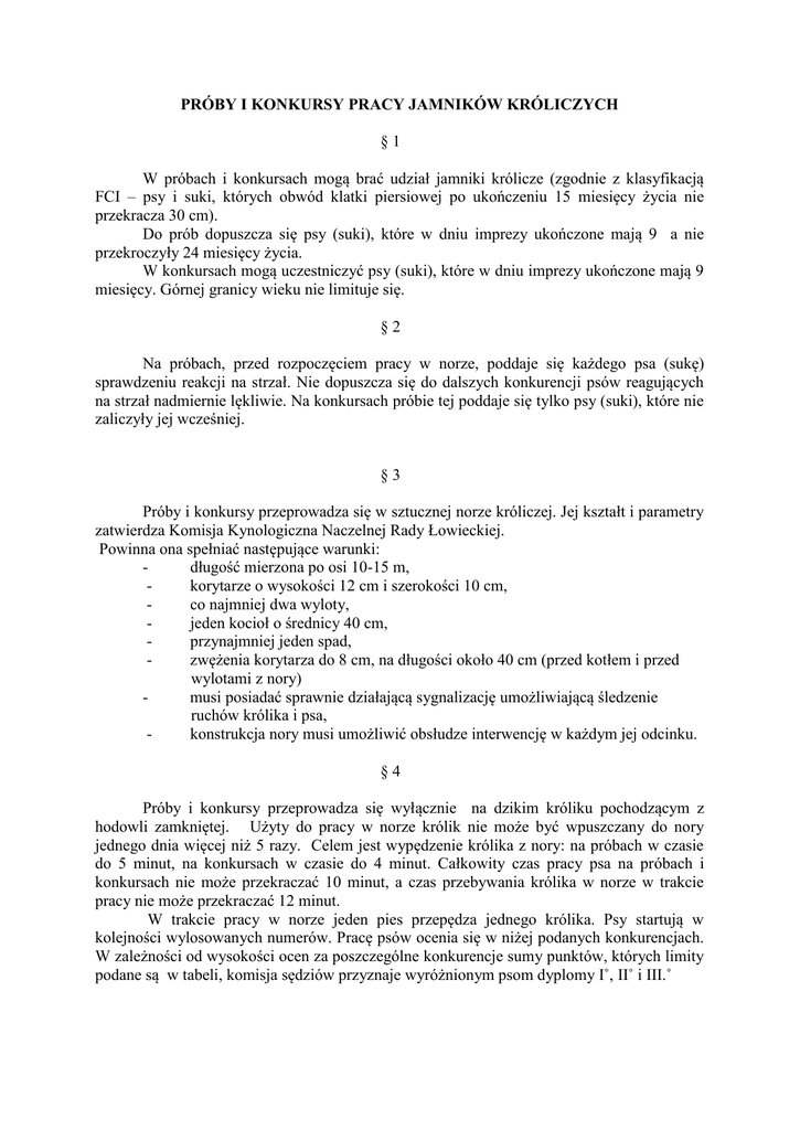 PRÓBY I KONKURSY PRACY JAMNIKÓW KRÓLICZYCH §1 W próbach i konkursach mogą brać udział jamniki królicze (zgodnie z klasyfikacją FCI – psy i suki, których obwód klatki piersiowej po ukończeniu 15 miesięcy życia nie przekracza 30 cm). Do prób dopuszcza się psy (suki), które w dniu imprezy ukończone mają 9 a nie przekroczyły 24 miesięcy życia. W konkursach mogą uczestniczyć psy (suki), które w dniu imprezy ukończone mają 9 miesięcy. Górnej granicy wieku nie limituje się. §2 Na próbach, przed rozpoczęciem pracy w norze, poddaje się każdego psa (sukę) sprawdzeniu reakcji na strzał. Nie dopuszcza się do dalszych konkurencji psów reagujących na strzał nadmiernie lękliwie. Na konkursach próbie tej poddaje się tylko psy (suki), które nie zaliczyły jej wcześniej. §3 Próby i konkursy przeprowadza się w sztucznej norze króliczej. Jej kształt i parametry zatwierdza Komisja Kynologiczna Naczelnej Rady Łowieckiej. Powinna ona spełniać następujące warunki: długość mierzona po osi 10-15 m, korytarze o wysokości 12 cm i szerokości 10 cm, co najmniej dwa wyloty, jeden kocioł o średnicy 40 cm, przynajmniej jeden spad, zwężenia korytarza do 8 cm, na długości około 40 cm (przed kotłem i przed wylotami z nory) musi posiadać sprawnie działającą sygnalizację umożliwiającą śledzenie ruchów królika i psa, konstrukcja nory musi umożliwić obsłudze interwencję w każdym jej odcinku. §4 Próby i konkursy przeprowadza się wyłącznie na dzikim króliku pochodzącym z hodowli zamkniętej. Użyty do pracy w norze królik nie może być wpuszczany do nory jednego dnia więcej niż 5 razy. Celem jest wypędzenie królika z nory: na próbach w czasie do 5 minut, na konkursach w czasie do 4 minut. Całkowity czas pracy psa na próbach i konkursach nie może przekraczać 10 minut, a czas przebywania królika w norze w trakcie pracy nie może przekraczać 12 minut. W trakcie pracy w norze jeden pies przepędza jednego królika. Psy startują w kolejności wylosowanych numerów. Pracę psów ocenia się w niżej podanych konkurencjach. W zależności od wysokości ocen za poszczególne konkurencje sumy punktów, których limity podane są w tabeli, komisja sędziów przyznaje wyróżnionym psom dyplomy I˚, II˚ i III.˚ §5 Królika umieszcza się kotle bezpośrednio przed rozpoczęciem konkurencji. Przewodnik, ściśle na polecenie sędziego, z odległości około 1 metra od otworu wejściowego, puszcza do nory psa uwolnionego ze smyczy i obroży. Przewodnikowi wolno jest zachęcać psa do pracy tylko przed jego wejściem do nory. Pies powinien wejść do nory: na próbach – w czasie 2 minut, a na konkursach – 1 minuty. Pies po dojściu do kotła w którym zamknięty jest królik , powinien oszczekiwać go 2 minuty, po czym na polecenie sędziego przewodnik zabiera psa z przed kotła, nakłada mu dopasowany, miękki kaganiec i puszcza go ponownie do nory. Czas na założenie kagańca i ponowne wejście psa do nory nie powinno trwać dłużej niż 1 minutę. W momencie dojścia psa do zastawek kotła podnosi się jednocześnie. Od tego momentu mierzy się „czas przepędzenia”. Mierzy się go aż do chwili w której pies dojdzie do królika zapędzonego i zamkniętego w klatce. Klatkę po zamknięciu królika odstawia się na odległość ok.30 cm od wyjścia nory. §6 - Na próbach i konkursach bez oceny pozostają psy (suki), które: nie wejdą do nory w czasie: 2 minut na próbach i 1 minuty na konkursie, nie podejmą pracy w kagańcu w czasie 1 minuty, nie przejdą przez przewężenie, dwukrotnie na konkursach opuszczą norę i w czasie 1 minuty samodzielnie nie podejmują pracy, trzykrotnie na próbach opuszczą norę i w czasie 1 minuty samodzielnie nie podejmą pracy, nie wypędzą królika z nory w regulaminowym czasie, §7 Warunki utrzymania zwierząt na konkursie muszą być zgodne z przepisami o ochronie zwierząt zawartymi w ustawie o ochronie zwierząt (Dz.U. z 21 sierpnia 1997r. , z póź. zmianami) OBJAŚNIENIA I WSKAZÓWKI DO OCENY PRACY Praca w norze z królikiem O wysokości oceny decyduje czas, w jakim królik zostanie wypędzony z nory. Limit czasowy na konkursach – 4, a na próbach – 5 minut. Gdy pies nie wypłoszy królika w czasie do 1 minuty, nie może w konkurencji „wypłaszanie” otrzymać oceny wyższej niż „3”. Sposób szukania w norze Przy ocenianiu sposobu szukania należy zwrócić uwagę na styl pracy oraz na to, czy pies opuści norę tym samym wylotem co królik. Wyjście innym otworem obniża ocenę. Pies, który opuści norę innym otworem i dojdzie do królika zamkniętego już w klatce po powierzchni nie może otrzymać oceny wyższej niż „2”. Pasja Ocenia się ją na podstawie całej pracy w norze oraz sposobu i szybkości wejścia i wyjścia psa z nory. Głos - rytmiczność, donośność Cechy głosu – donośność i rytmiczność ocenia się podczas oszczekiwania królika zamkniętego w kotle. Najwyższą ocenę może otrzymać pies szczekający rytmicznie, silnym i dźwięcznym głosem. Psy o słabo słyszalnym głosie podczas szczekania robiące. długie i częste przerwy nie mogą otrzymać oceny wyższej niż „2” Posłuszeństwo, apel Konkurencję tę należy przeprowadzić przed pracą w norze, w możliwie dużej odległości od niej. Polega ona na sprawdzeniu: 1/ reagowania psa (suki) na znaki i komendy wydawane przez przewodnika gwizdkiem, trąbką lub znakiem ręki. Psy, które nie dają się wziąć na smycz lub uciekają od przewodnika otrzymują ocenę „0”. W przypadku pogonienia psa za zwierzyną powinien on wrócić do przewodnika w czasie 10 minut. 2/ chodzenia na smyczy przy nodze. Pies powinien iść na luźnej smyczy, tuż przy nodze lub za nogą przewodnika, który omija drzewa z prawej i lewej strony pnia. Na polecenie sędziego powinien wykonać dwa ostre skręty w prawo i lewo, dwukrotnie zatrzymać się, zmienić tempo marszu oraz kierunek. Pr