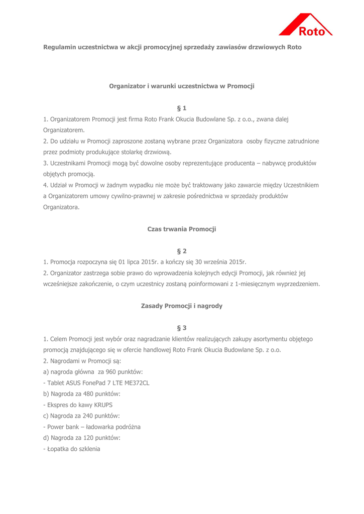 Regulamin uczestnictwa w akcji promocyjnej sprzedaży zawiasów drzwiowych Roto Organizator i warunki uczestnictwa w Promocji §1 1. Organizatorem Promocji jest firma Roto Frank Okucia Budowlane Sp. z o.o., zwana dalej Organizatorem. 2. Do udziału w Promocji zaproszone zostaną wybrane przez Organizatora osoby fizyczne zatrudnione przez podmioty produkujące stolarkę drzwiową. 3. Uczestnikami Promocji mogą być dowolne osoby reprezentujące producenta – nabywcę produktów objętych promocją. 4. Udział w Promocji w żadnym wypadku nie może być traktowany jako zawarcie między Uczestnikiem a Organizatorem umowy cywilno-prawnej w zakresie pośrednictwa w sprzedaży produktów Organizatora. Czas trwania Promocji §2 1. Promocja rozpoczyna się 01 lipca 2015r. a kończy się 30 września 2015r. 2. Organizator zastrzega sobie prawo do wprowadzenia kolejnych edycji Promocji, jak również jej wcześniejsze zakończenie, o czym uczestnicy zostaną poinformowani z 1-miesięcznym wyprzedzeniem. Zasady Promocji i nagrody §3 1. Celem Promocji jest wybór oraz nagradzanie klientów realizujących zakupy asortymentu objętego promocją znajdującego się w ofercie handlowej Roto Frank Okucia Budowlane Sp. z o.o. 2. Nagrodami w Promocji są: a) nagroda główna za 960 punktów: - Tablet ASUS FonePad 7 LTE ME372CL b) Nagroda za 480 punktów: - Ekspres do kawy KRUPS c) Nagroda za 240 punktów: - Power bank – ładowarka podróżna d) Nagroda za 120 punktów: - Łopatka do szklenia 3. Sposób przyznawania nagród: Nagrody będą przyznawane na podstawie dokumentu potwierdzającego zakup asortymentu. Weryfikacji dokona przedstawiciel Organizatora Promocji. 4. Uczestnikom Promocji nie przysługuje prawo do żądania wypłaty pieniężnej stanowiącej równowartość przysługującej im nagrody rzeczowej. 5. Uczestnicy mogą w ramach zgromadzonej liczby punktów swobodnie decydować o wykorzystaniu zgromadzonych punktów na poszczególne nagrody. Oznacza to, iż uczestnik zamiast otrzymania jednej nagrody, do otrzymania której się kwalifikuje, może otrzymać kilka nagród wymagających zgromadzenia mniejszej liczby punktów. §4 1. Weryfikacja dowodów zakupu będzie trwać do 30.11.2015. Zasady ustalania i gromadzenia Roto-punktów §5 1. Zasady dotyczące punktacji określone będą każdorazowo i przekazane do wiadomości Uczestników w materiałach informacyjnych dystrybuowanych przez Organizatora, jako zaproszenie do uczestnictwa w akcji promocyjnej. Rozstrzygnięcie Promocji i zasady odbioru nagród §6 1. Nagroda zostanie przekazana osobiście przez wyznaczonego pracownika firmy Roto Frank w terminie do 31.12.2015 §7 1. Wartość nagród rzeczowych przekazywanych uczestnikom Promocji stanowi dla nich przychód z innych źródeł określony w art. 20 ust. 1 ustawy o podatku dochodowym od osób fizycznych (Dz. U. z 2012 r., poz. 361). 2. Zgodnie z art. 42a powołanej wyżej ustawy Spółka będzie sporządzać imienne informacje na formularzu PIT-8C i przekazywać je otrzymującym nagrody uczestnikom oraz urzędom skarbowym właściwym według miejsca ich zamieszkania w terminie do końca lutego następnego roku podatkowego. Wykazany w informacji PIT-8C przychód z nieodpłatnych świadczeń uzyskany w związku z otrzymaną nagrodą podlegać będzie wykazaniu w zeznaniu rocznym, składanym przez uczestników poprzez doliczenie do pozostałych przychodów opodatkowanych według skali podatkowej określonej w art. 27 ust. ustawy o PIT. Postanowienia końcowe §8 1. Organizator zastrzega sobie możliwość dokonania zmian w Regulaminie. O wszelkich zmianach w Regulaminie Uczestnicy zostaną poinformowani za pomocą poczty e-mail. Regulamin jest również dostępny w siedzibie Organizatora oraz na stronie www.roto-frank.com/pl/serwis/promocje/. 2. Wszelkie sytuacje sporne, które mogą powstać w wyniku Promocji, będą rozstrzygane przez Komisję Promocyjną powołaną przez Organizatora. Warszawa, 01. Lipca 2015