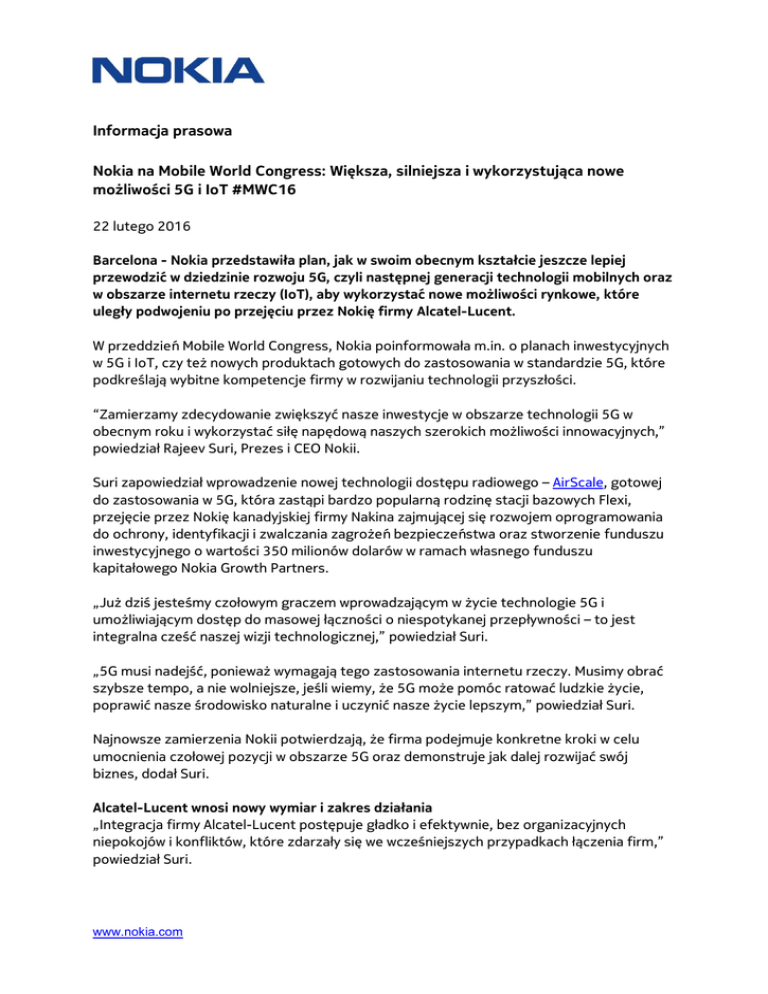 Informacja prasowa Nokia na Mobile World Congress: Większa, silniejsza i wykorzystująca nowe możliwości 5G i IoT #MWC16 22 lutego 2016 Barcelona - Nokia przedstawiła plan, jak w swoim obecnym kształcie jeszcze lepiej przewodzić w dziedzinie rozwoju 5G, czyli następnej generacji technologii mobilnych oraz w obszarze internetu rzeczy (IoT), aby wykorzystać nowe możliwości rynkowe, które uległy podwojeniu po przejęciu przez Nokię firmy Alcatel-Lucent. W przeddzień Mobile World Congress, Nokia poinformowała m.in. o planach inwestycyjnych w 5G i IoT, czy też nowych produktach gotowych do zastosowania w standardzie 5G, które podkreślają wybitne kompetencje firmy w rozwijaniu technologii przyszłości. “Zamierzamy zdecydowanie zwiększyć nasze inwestycje w obszarze technologii 5G w obecnym roku i wykorzystać siłę napędową naszych szerokich możliwości innowacyjnych,” powiedział Rajeev Suri, Prezes i CEO Nokii. Suri zapowiedział wprowadzenie nowej technologii dostępu radiowego – AirScale, gotowej do zastosowania w 5G, która zastąpi bardzo popularną rodzinę stacji bazowych Flexi, przejęcie przez Nokię kanadyjskiej firmy Nakina zajmującej się rozwojem oprogramowania do ochrony, identyfikacji i zwalczania zagrożeń bezpieczeństwa oraz stworzenie funduszu inwestycyjnego o wartości 350 milionów dolarów w ramach własnego funduszu kapitałowego Nokia Growth Partners. „Już dziś jesteśmy czołowym graczem wprowadzającym w życie technologie 5G i umożliwiającym dostęp do masowej łączności o niespotykanej przepływności – to jest integralna cześć naszej wizji technologicznej,” powiedział Suri. „5G musi nadejść, ponieważ wymagają tego zastosowania internetu rzeczy. Musimy obrać szybsze tempo, a nie wolniejsze, jeśli wiemy, że 5G może pomóc ratować ludzkie życie, poprawić nasze środowisko naturalne i uczynić nasze życie lepszym,” powiedział Suri. Najnowsze zamierzenia Nokii potwierdzają, że firma podejmuje konkretne kroki w celu umocnienia czołowej pozycji w obszarze 5G oraz demonstruje jak dalej rozwijać swój biznes, dodał Suri. Alcatel-Lucent wnosi nowy wymiar i zakres działania „Integracja firmy Alcatel-Lucent postępuje gładko i efektywnie, bez organizacyjnych niepokojów i konfliktów, które zdarzały się we wcześniejszych przypadkach łączenia firm,” powiedział Suri. www.nokia.com Dodał, że połączona firma ma zamiar wykorzystać możliwości sprzedaży dodatkowych produktów i przedstawiać kompleksowe, połączone oferty swoim klientom na całym świecie. Te możliwości są efektem nowego zakresu działania, który wniósł do Nokii AlcatelLucent, obok większych możliwości innowacyjnych, skali działania i dostępu do klientów, powiedział Suri. „Kiedy łączymy Nokię i Alcatel-Lucent, to nagle Nokia znajduje się w kompletnie nowej pozycji z potencjalnym rynkiem o wartości 141 miliardów euro. To, co będziemy mogli zaoferować naszym klientom i z kolei ich klientom – jest po prostu nieporównywalne,” wyjaśnił Suri. Na koniec 2015 roku Nokia i Alcatel-Lucent osiągnęły razem sprzedaż netto o wartości 26 miliardów euro, miały połączone wydatki na R&D w wysokości 4.5 miliarda euro, przy zatrudnieniu ponad 40 000 inżynierów i naukowców oraz połączone przychody w gotówce o wartości 10 miliardów euro. Wspólne działania Nokii i Alcatel-Lucent zainaugurowano oficjalnie 14 stycznia 2016. Gotowi na 5G I IoT AirScale, nowa technologia Nokii dostosowana do wymagań 5G, wspiera każdą technologię mobilną od 2G poprzez LTE-Advanced Pro oraz 5G - jak tylko zostanie wprowadzone. AirScale to także nowa stacja bazowa dostosowana do zakresów częstotliwości, które będą stosowane w przyszłości oraz następnej generacji produktów radiowych, które pozwolą użytkownikom doświadczyć łączności nieporównywalnej z wcześniejszymi możliwościami. AirScale zużywa też o 60% mniej energii niż produkty Flexi. Przejęcie firmy Nakina, które ma nastąpić w pierwszym kwartale 2016 roku, jest krokiem w kierunku realizacji jednego z priorytetów Nokii, czyli jest wprowadzenia najlepszych systemów bezpieczeństwa sieci, aby umożliwić działanie 5G i IoT. Przejęcie to jest w zgodzie z polityką włączania do Nokii niewielkich firm pozwalających rozszerzyć zakres technologii i dodać wyjątkowe możliwości. Nowy fundusz IoT będzie inwestował w dobrze rokujące firmy szczególnie w zakresie Connected Enterprise, internetu rzeczy dla konsumentów (Consumer IoT), autonomicznych samochodów (Connected Car), Digital Health oraz technologii skupiających się na możliwościach big data i analityki. Podczas MWC Nokia przedstawia swoją wizję technologiczną w zakresie różnorodnych tematów np. CTO działu technologii mobilnych Hossein Moiin prezentuje wizję 5G oraz jak Nokia tworzy nową wartość dla różnych branż, zaś Kathrin Buvac, Nokia Chief Strategy Officer, przedstawia strategię i założenia rozwoju firmy, a także plany przyciągnięcia kobiet do sektora technologicznego. Skontaktuj się z Nokią: Zapisz się, aby otrzymywać informacje o naszych produktach Strona internetowa Blog www.nokia.com Twitter YouTube LinkedIn Facebook Periscope O Nokii Nokia to globalny lider, oferujący technologie łączące miliardy ludzi i urządzeń na całym świecie. Firma, wspierana innowacjami opracowywanymi przez cenione ośrodki badawczorozwojowe Bell Labs oraz Nokia Technologies, jest wiodącym dostawcą rozwiązań, które są fundamentem współczesnego, połączonego świata. Dostarczając najnowocześniejsze oprogramowanie, urządzenia i technologie dla każdego typu sieci Nokia zapewnia wyjątkowe możliwości wsparcia dostawcom usług, instytucjom rządowym oraz międzynarodowym firmom w oferowaniu nowatorskich rozwiązań z zakresu sieci 5G, usług w chmurze oraz internetu rzeczy. http://nokia.com Kontakt dla mediów Nokia Communications Tel.: +358 10 4