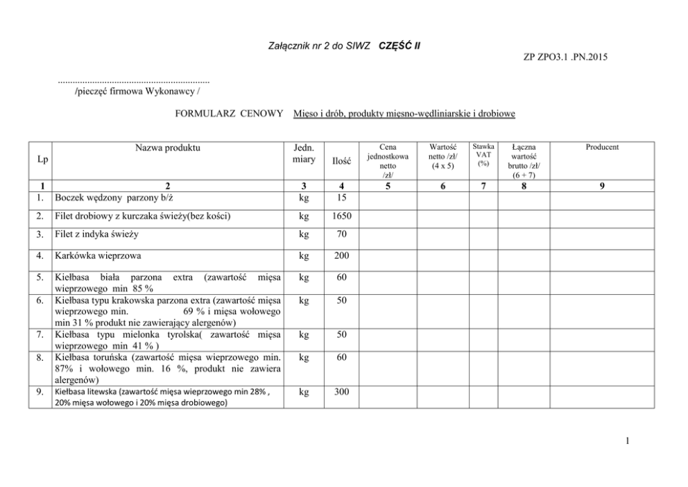 Załącznik nr 2 do SIWZ CZĘŚĆ II ZP ZPO3.1 .PN.2015 .............................................................. /pieczęć firmowa Wykonawcy / FORMULARZ CENOWY Nazwa produktu Lp Mięso i drób, produkty mięsno-wędliniarskie i drobiowe Jedn. miary Ilość 3 kg 4 15 . 1 2 1. Boczek wędzony parzony b/ż 2. Filet drobiowy z kurczaka świeży(bez kości) kg 1650 3. Filet z indyka świeży kg 70 4. Karkówka wieprzowa kg 200 5. Kiełbasa biała parzona extra (zawartość mięsa wieprzowego min 85 % Kiełbasa typu krakowska parzona extra (zawartość mięsa wieprzowego min. 69 % i mięsa wołowego min 31 % produkt nie zawierający alergenów) Kiełbasa typu mielonka tyrolska( zawartość mięsa wieprzowego min 41 % ) Kiełbasa toruńska (zawartość mięsa wieprzowego min. 87% i wołowego min. 16 %, produkt nie zawiera alergenów) kg 60 kg 50 kg 50 kg 60 Kiełbasa litewska (zawartość mięsa wieprzowego min 28% , 20% mięsa wołowego i 20% mięsa drobiowego) kg 300 6. 7. 8. 9. Cena jednostkowa netto /zł/ Wartość netto /zł/ (4 x 5) Stawka VAT (%) Łączna wartość brutto /zł/ (6 + 7) Producent 5 6 7 8 9 1 Załącznik nr 2 do SIWZ CZĘŚĆ II ZP ZPO3.1 .PN.2015 kg 100 11. Kości wieprzowe karkowo-schabowe kg 500 12. Kurczak świeży kg 180 13. Łopatka cielęca kg 60 14. Łopatka wieprzowa b/k kg 1000 kg 1000 kg 100 17. Parówki wieprzowe odtłuszczone kg 300 18. Parówki z szynki – zawartość szynki min. 85% kg 100 19. Pasztet luzem (zawartość mięsa wieprzowego min. 41 %) 20. Pasztet drobiowy Podlaski op.150 g kg 50 szt. 400 21. Pieczeń typu wiedeńska kg 30 22. Polędwica drobiowa (zawartość mięsa drobiowego min. 53%) 23. Polędwica miodowa drobiowa kg 40 kg 40 24. Polędwica typu Sopocka ( zawartość mięsa wieprzowego min. 78 %) 25. Porcje rosołowe z kurcząt ze skrzydełkami tzw. całe kg 100 kg 200 10. Kiełbasa typu żywiecka (zawartość mięsa wieprzowego min 60% produkt nie zawiera alergenów) 15. Mięso garmażeryjne z łopatki wieprzowego nie mniej niż 90%) 16. Mięso gulaszowe z fileta indyka (zawartość mięsa 2 Załącznik nr 2 do SIWZ CZĘŚĆ II ZP ZPO3.1 .PN.2015 26. Schab surowy b/k kg 850 27. Szynka surowa b/k kg 1500 kg 90 kg 400 30. Udziec cielęcy kg 30 31. Udziec z kurczaka kg 1000 28. Szynka wieprzowa gotowana wieprzowego min. 76 %) 29. Udko pałka z kurcząt ( zawartość mięsa Łącznie: * lub równoważne - Zamawiający dopuszcza możliwość złożenia ofert równoważnych; za równoważną uzna produkt o takich samych lub bardzo zbliżonych – nie gorszych- walorach smakowych, zapachowych i kolorystycznych; sposobie użycia i terminie przydatności do spożycia Miejscowość ...................................... ……, data .................... Podpisano: …………………………………………. /podpis osoby działającej w imieniu Wykonawcy/ 3