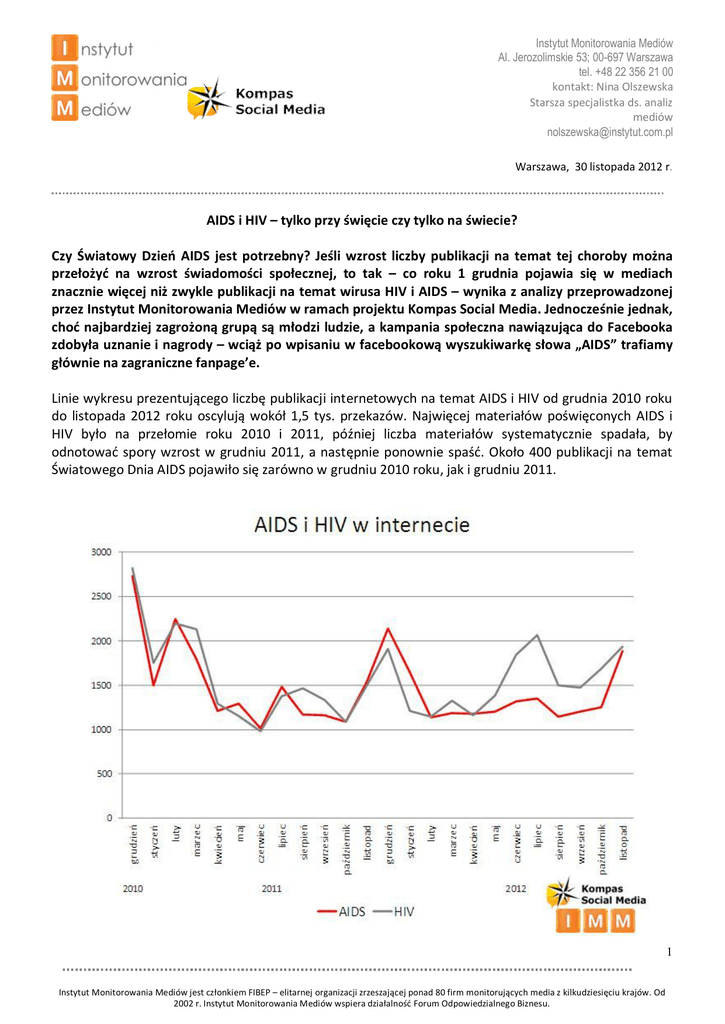 Instytut Monitorowania Mediów Al. Jerozolimskie 53; 00-697 Warszawa tel. +48 22 356 21 00 kontakt: Nina Olszewska Starsza specjalistka ds. analiz mediów [email protected] Warszawa, 30 listopada 2012 r. AIDS i HIV – tylko przy święcie czy tylko na świecie? Czy Światowy Dzień AIDS jest potrzebny? Jeśli wzrost liczby publikacji na temat tej choroby można przełożyć na wzrost świadomości społecznej, to tak – co roku 1 grudnia pojawia się w mediach znacznie więcej niż zwykle publikacji na temat wirusa HIV i AIDS – wynika z analizy przeprowadzonej przez Instytut Monitorowania Mediów w ramach projektu Kompas Social Media. Jednocześnie jednak, choć najbardziej zagrożoną grupą są młodzi ludzie, a kampania społeczna nawiązująca do Facebooka zdobyła uznanie i nagrody – wciąż po wpisaniu w facebookową wyszukiwarkę słowa „AIDS” trafiamy głównie na zagraniczne fanpage’e. Linie wykresu prezentującego liczbę publikacji internetowych na temat AIDS i HIV od grudnia 2010 roku do listopada 2012 roku oscylują wokół 1,5 tys. przekazów. Najwięcej materiałów poświęconych AIDS i HIV było na przełomie roku 2010 i 2011, później liczba materiałów systematycznie spadała, by odnotować spory wzrost w grudniu 2011, a następnie ponownie spaść. Około 400 publikacji na temat Światowego Dnia AIDS pojawiło się zarówno w grudniu 2010 roku, jak i grudniu 2011. 1 Instytut Monitorowania Mediów jest członkiem FIBEP – elitarnej organizacji zrzeszającej ponad 80 firm monitorujących media z kilkudziesięciu krajów. Od 2002 r. Instytut Monitorowania Mediów wspiera działalność Forum Odpowiedzialnego Biznesu. Facebook milczy. Przynajmniej po polsku „Życie to nie Facebook” – akcja ważna, potrzebna i trafiająca do właściwego odbiory – w opinii specjalistów i internautów. Twórcy kampanii za pomocą nawiązania do Facebooka zwrócili uwagę na zagrożenia, które płyną z kontaktów z przypadkowymi znajomymi – znacznie poważniejsze niż w przypadku, gdy kontakty te ograniczone są do rzeczywistości wirtualnej i mediów społecznościowych. Jednocześnie jednak, gdy wpiszemy dziś „AIDS” w facebookową wyszukiwarkę, trafiamy przede wszystkim na profile zagraniczne. Fan page Światowego Dnia Walki z AIDS ma w wersji angielskiej tysiące fanów, w polskiej odsłonie – 85. Profil sprawia wrażenie porzuconego, ostatni post pojawił się w styczniu 2012. Wydarzenie utworzone przez PCK „Światowy Dzień AIDS w Łodzi” na razie zgromadziło 162 fanów (30 listopada, 12:00). Zobacz pozostałe raporty również na stronie IMM. Instytut Monitorowania Mediów wyraża zgodę na publikację raportu, wyników badań i dołączonych do nich materiałów graficznych pod warunkiem podania źródła ("Instytut Monitorowania Mediów” lub „Kompas Social Media”) w artykule oraz oznaczenia źródła przy każdej grafice. Autor: Nina Olszewska, starsza specjalistka analiz przekazów mediowych IMM. O raporcie: Analizę wykonano na podstawie ponad 72 564 materiałów internetowych dostarczonych przez Instytut Monitorowania Mediów, w których pojawiły się słowa „HIV/AIDS”. Raport obejmuje materiały od 1 grudnia 2010 do 30 listopada 2012 r. O Kompasie Social Media: Kompas Social Media to projekt Instytutu Monitorowania Mediów. Jest to audyt dotychczasowej obecności firmy, marki, osoby czy całej branży w mediach społecznościowych na tle jej obecności w Internecie. Raport umożliwia identyfikację najbardziej popularnych miejsc dyskusji na temat marki lub firmy, wskazuje również kanały jeszcze niezagospodarowane. Audyt sygnalizuje momenty największego nasilenia komentarzy, z uwzględnieniem głównych tematów, co pomaga w szczegółowej analizie komentarzy internautów na badany temat. W raporcie uwzględniony jest też wydźwięk publikacji na temat badanego hasła. Analiza wyszczególnia również autorów treści w sieci, będących lub mogących się stać liderami opinii. Kompas pomaga ocenić dotychczasowe przekazy na temat firmy/ marki i znaleźć miejsca w Internecie, w których pojawia się ona jak i jej klienci. To pomoc w dostosowaniu lub zoptymalizowaniu komunikacji w poszczególnych kanałach w Internecie. O IMM: Instytut Monitorowania Mediów to lider branży monitoringu mediów w Polsce. Od ponad dekady dostarcza klientom kompleksową usługę badania wizerunku w prasie, radiu, telewizji oraz w internecie i w mediach społecznościowych. Rozwój potrzeb na rynku monitorowania mediów spowodował, że od 2003 roku IMM uruchomił dziewiętnaście ośrodków lokalnych w największych miastach Polski, dzięki czemu stało się możliwe pozyskiwanie informacji z gazet regionalnych już w dniu ich wydania. Od początku 2010 roku IMM oferuje możliwość zamówienia monitoringu mediów z krajów Europy Środkowo-Wschodniej (CEE). IMM publikuje szereg ogólnodostępnych raportów, w tym „Najbardziej Opiniotwórcze Media” – cykliczny ranking najczęściej cytowanych mediów, a także regularne badania polskiego dyskursu internetowego w ramach projektu Kompas Social Media. 2 Instytut Monitorowania Mediów jest członkiem FIBEP – elitarnej organizacji zrzeszającej ponad 80 firm monitorujących media z kilkudziesięciu krajów. Od 2002 r. Instytut Monitorowania Mediów wspiera działalność Forum Odpowiedzialnego Biznesu.