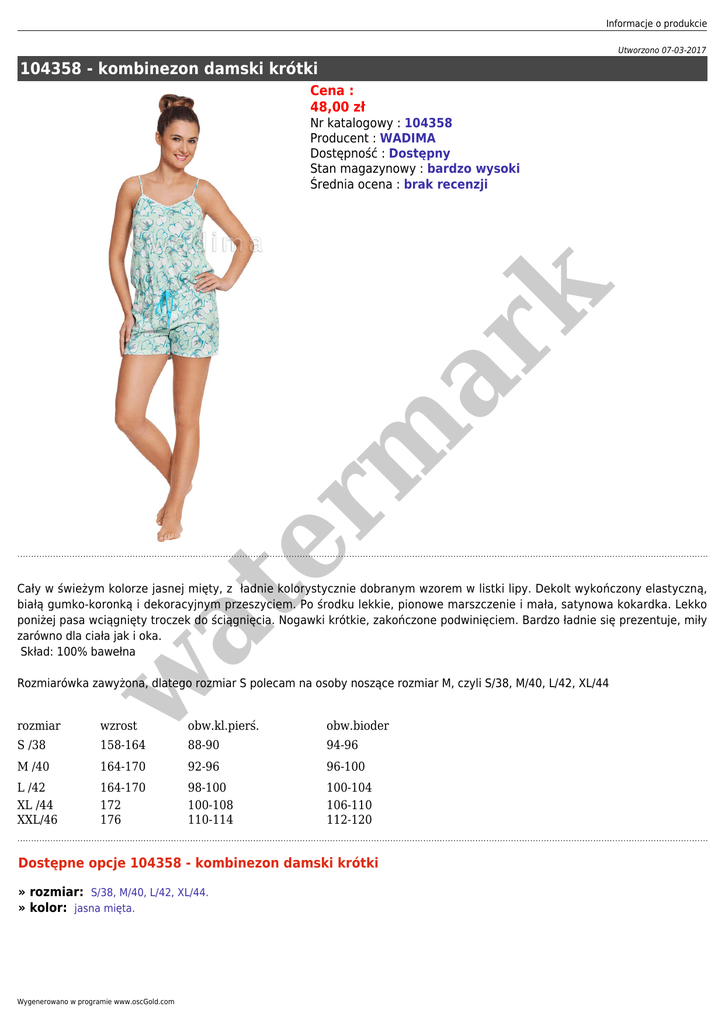 Informacje o produkcie Utworzono 07-03-2017 104358 - kombinezon damski krótki Cena : 48,00 zł er m ar k Nr katalogowy : 104358 Producent : WADIMA Dostępność : Dostępny Stan magazynowy : bardzo wysoki Średnia ocena : brak recenzji w at Cały w świeżym kolorze jasnej mięty, z ładnie kolorystycznie dobranym wzorem w listki lipy. Dekolt wykończony elastyczną, białą gumko-koronką i dekoracyjnym przeszyciem. Po środku lekkie, pionowe marszczenie i mała, satynowa kokardka. Lekko poniżej pasa wciągnięty troczek do ściągnięcia. Nogawki krótkie, zakończone podwinięciem. Bardzo ładnie się prezentuje, miły zarówno dla ciała jak i oka. Skład: 100% bawełna Rozmiarówka zawyżona, dlatego rozmiar S polecam na osoby noszące rozmiar M, czyli S/38, M/40, L/42, XL/44 rozmiar wzrost obw.kl.pierś. obw.bioder S /38 158-164 88-90 94-96 M /40 164-170 92-96 96-100 L /42 XL /44 XXL/46 164-170 172 176 98-100 100-108 110-114 100-104 106-110 112-120 Dostępne opcje 104358 - kombinezon damski krótki » rozmiar: S/38, M/40, L/42, XL/44. » kolor: jasna mięta. Wygenerowano w programie www.oscGold.com