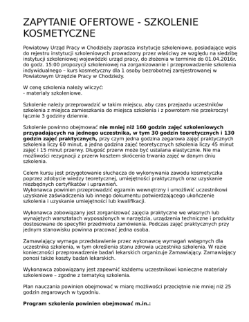 ZAPYTANIE OFERTOWE - SZKOLENIE KOSMETYCZNE Powiatowy Urząd Pracy w Chodzieży zaprasza instytucje szkoleniowe, posiadające wpis do rejestru instytucji szkoleniowych prowadzony przez właściwy ze względu na siedzibę instytucji szkoleniowej wojewódzki urząd pracy, do złożenia w terminie do 01.04.2016r. do godz. 15:00 propozycji szkoleniowej na zorganizowanie i przeprowadzenie szkolenia indywidualnego – kurs kosmetyczny dla 1 osoby bezrobotnej zarejestrowanej w Powiatowym Urzędzie Pracy w Chodzieży. W cenę szkolenia należy wliczyć: - materiały szkoleniowe. Szkolenie należy przeprowadzić w takim miejscu, aby czas przejazdu uczestników szkolenia z miejsca zamieszkania do miejsca szkolenia i z powrotem nie przekroczył łącznie 3 godziny dziennie. Szkolenie powinno obejmować nie mniej niż 160 godzin zajęć szkoleniowych przypadających na jednego uczestnika, w tym 30 godzin teoretycznych i 130 godzin zajęć praktycznych, przy czym jedna godzina zegarowa zajęć praktycznych szkolenia liczy 60 minut, a jedna godzina zajęć teoretycznych szkolenia liczy 45 minut zajęć i 15 minut przerwy. Długość przerw może być ustalana elastycznie. Nie ma możliwości rezygnacji z przerw kosztem skrócenia trwania zajęć w danym dniu szkolenia. Celem kursu jest przygotowanie słuchacza do wykonywania zawodu kosmetyczka poprzez zdobycie wiedzy teoretycznej, umiejętności praktycznych oraz uzyskanie niezbędnych certyfikatów i uprawnień. Wykonawca powinien przeprowadzić egzamin wewnętrzny i umożliwić uczestnikowi uzyskanie zaświadczenia lub innego dokumentu potwierdzającego ukończenie szkolenia i uzyskanie umiejętności lub kwalifikacji. Wykonawca zobowiązany jest zorganizować zajęcia praktyczne we własnych lub wynajętych warsztatach wyposażonych w narzędzia, urządzenia techniczne i produkty dostosowane do specyfiki przedmiotu zamówienia. Podczas zajęć praktycznych przy jednym stanowisku powinna pracować jedna osoba. Zamawiający wymaga przedstawienie przez wykonawcę wymagań wstępnych dla uczestnika szkolenia, w tym określenia stanu zdrowia uczestnika szkolenia. W razie konieczności przeprowadzenie badań lekarskich organizuje Zamawiający. Zamawiający ponosi także koszty badań lekarskich. Wykonawca zobowiązany jest zapewnić każdemu uczestnikowi konieczne materiały szkoleniowe – zgodne z tematyką szkolenia. Plan nauczania powinien obejmować w miarę możliwości przeciętnie nie mniej niż 25 godzin zegarowych w tygodniu. Program szkolenia powinien obejmować m.in.: • • • • • • • • • • • masaż twarzy i drenaż limfatyczny twarzy, masaż twarzy, szyi i dekoltu naturalnymi pędzlami, rodzaje masek z podziałem na formę i ich aplikacja, rodzaje i aplikacja peelingów kosmetycznych, eksfoliacja kwasami – peeling kwasami owocowymi AHA i BHA, oxybrazja – peeling za pomocą powietrza i soli fizjologicznej, regulacja brwi, henna brwi i rzęs, trwała rzęs, przedłużanie rzęs technika 1:1 – rzęsy jedwabne, depilacja za pomocą wosku, depilacja za pomocą pasty cukrowej, zabiegi z wykorzystaniem aparatury specjalistycznej (mikrodermabrazja, kawitacja, ultradźwięki). Zlecenie zorganizowania i przeprowadzenia ww. szkolenia zostanie dokonane na podstawie art. 4 pkt. 8 to jest bez stosowania przepisów ustawy z dnia 29.01.2004r. Prawo zamówień publicznych (Dz.U. z 2013r., poz. 907 z późn. zm.) Propozycje szkoleniowe proszę składać wyłącznie na załączonym formularzu propozycji szkoleniowej wraz z programem szkolenia opracowanym z wykorzystaniem standardów kwalifikacji zawodowych i modułowych programów szkoleń zawodowych, który musi zawierać: nazwę i zakres szkolenia, czas trwania i sposób organizacji szkolenia, wymagania wstępne dla uczestników szkolenia, cele szkolenia, plan nauczania określający tematy zajęć edukacyjnych oraz ich wymiar, z uwzględnieniem, w miarę potrzeby, części teoretycznej i części praktycznej, • opis treści szkolenia w zakresie poszczególnych zajęć edukacyjnych, • wykaz literatury oraz niezbędnych środków i materiałów dydaktycznych, • przewidziane sprawdziany i egzaminy. • • • • • Złożenie propozycji szkoleniowej nie stanowi oferty w rozumieniu art. 66 Kodeksu Cywilnego i nie wymaga odpowiedzi. Zaproszenie do składania propozycji szkoleniowej nie jest ogłoszeniem o zamówienie publiczne. Wybór instytucji szkoleniowej zostanie dokonany na podstawie kryteriów wyboru instytucji szkoleniowej do przeprowadzenia szkoleń osób bezrobotnych oraz poszukujących pracy. Dodatkowe informacje można uzyskać pod numerem telefonu (67) 28-20-465 wew.10 Propozycje szkoleniowe można składać: osobiście, fax-em, pocztą tradycyjną lub elektroniczną ( [email protected]). Załączniki zapytanie ofertowe.pdf program szkolenia.doc formularz propozycji szkoleniowej.doc Kryteria wyboru instytucji szkoleniowych 2014.docx