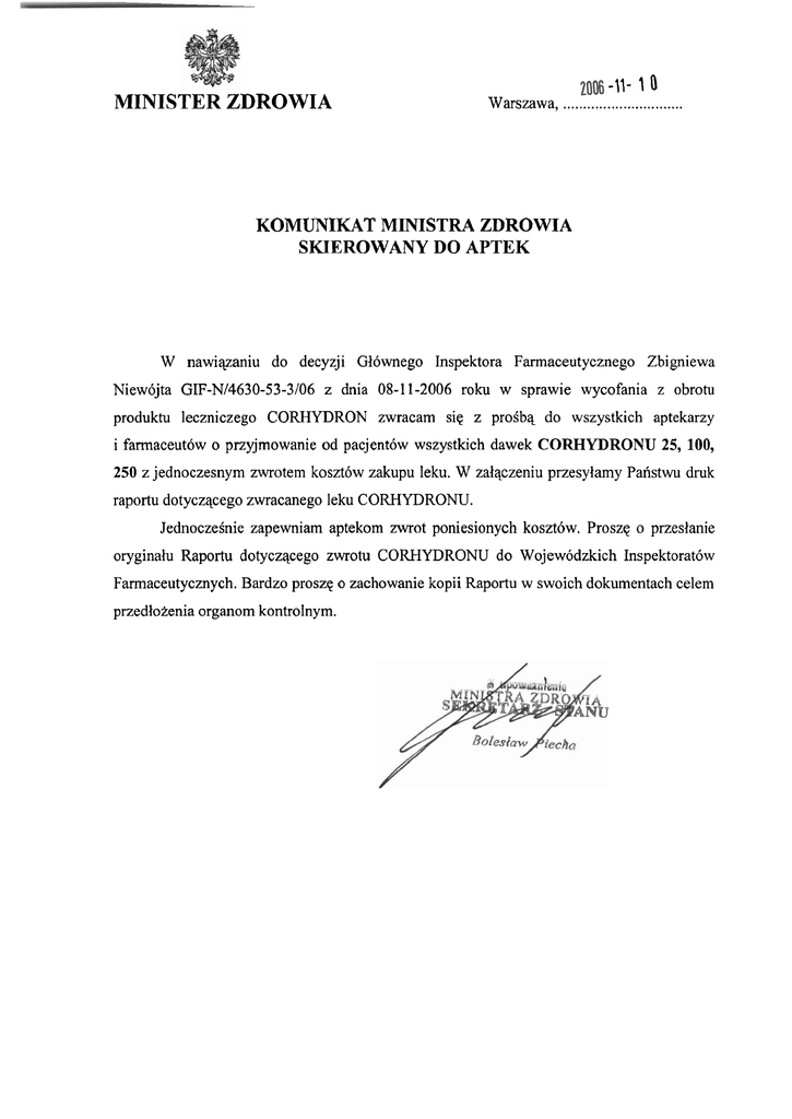 MINISTER ZDROWIA -11- 1 0 Warszawa, .............................. KOMUNIKAT MINISTRA ZDROWIA SKIEROWANY DO APTEK W nawiqzaniu do decyzji Glownego Inspektora Farmaceutycznego Zbigniewa Niewojta GIF-Nl4630-53-3/06 z dnia 08-11-2006 roku w sprawie wycofania z obrotu produktu leczniczego CORHYDRON zwracam siq z proibq do wszystkich aptekarzy i farmaceutow o przyjmowanie od pacjent6w wszystkich dawek CORHYDRONU 25, 100, 250 z jednoczesnym zwrotem koszt6w zakupu leku. W zalqczeniu przesylamy Panstwu druk raportu dotyczqcego zwracanego leku CORHYDRONU. Jednoczeinie zapewniam aptekom zwrot poniesionych kosztow. Proszq o przeslanie oryginalu Raportu dotyczqcego zwrotu CORHYDRONU do Wojewodzkich Inspektorat6w Farmaceutycznych. Bardzo prosze o zachowanie kopii Raportu w swoich dokumentach celem przedloienia organom kontrolnym.