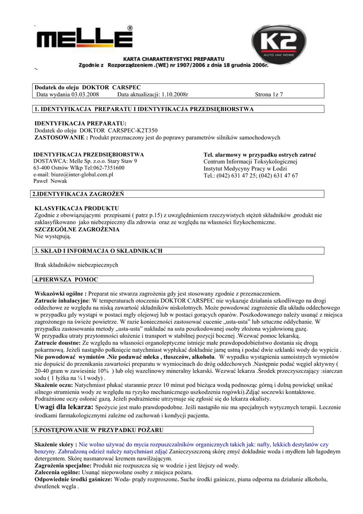 Dodatek do oleju DOKTOR CARSPEC Data wydania 03.03.2008 Data aktualizacji: 1.10.2008r Strona 1z 7 1. IDENTYFIKACJA PREPARATU I IDENTYFIKACJA PRZEDSIĘBIORSTWA IDENTYFIKACJA PREPARATU: Dodatek do oleju DOKTOR CARSPEC-K2T350 ZASTOSOWANIE : Produkt przeznaczony jest do poprawy parametrów silników samochodowych IDENTYFIKACJA PRZEDSIĘBIORSTWA DOSTAWCA: Melle Sp. z.o.o. Stary Staw 9 63-400 Ostrów Wlkp Tel:062-7351600 e-mail: [email protected] Paweł Nowak Tel. alarmowy w przypadku ostrych zatruć Centrum Informacji Toksykologicznej Instytut Medycyny Pracy w Łodzi Tel.: (042) 631 47 25; (042) 631 47 67 2.IDENTYFIKACJA ZAGROśEŃ KLASYFIKACJA PRODUKTU Zgodnie z obowiązującymi przepisami ( patrz p.15) z uwzględnieniem rzeczywistych stęŜeń składników ,produkt nie zaklasyfikowano jako niebezpieczny dla zdrowia oraz ze względu na własności fizykochemiczne. SZCZEGÓLNE ZAGROśENIA Nie występują. 3. SKŁAD I INFORMACJA O SKŁADNIKACH Brak składników niebezpiecznych 4.PIERWSZA POMOC Wskazówki ogólne : Preparat nie stwarza zagroŜenia gdy jest stosowany zgodnie z przeznaczeniem. Zatrucie inhalacyjne: W temperaturach otoczenia DOKTOR CARSPEC nie wykazuje działania szkodliwego na drogi oddechowe ze względu na niską zawartość składników niskolotnych. MoŜe powodować zagroŜenie dla układu oddechowego w przypadku gdy wystąpi w postaci mgły olejowej lub w postaci gorących oparów. Poszkodowanego naleŜy usunąć z miejsca zagroŜonego na świeŜe powietrze. W razie konieczności zastosować cucenie „usta-usta” lub sztuczne oddychanie. W przypadku zastosowania metody „usta-usta” nakładać na usta poszkodowanej osoby złoŜona wyjałowioną gazę. W przypadku utraty przytomności ułoŜenie i transport w stabilnej pozycji bocznej .Wezwać pomoc lekarską. Zatrucie doustne: Ze względu na własności organoleptyczne istnieje małe prawdopodobieństwo dostania się drogą pokarmową. JeŜeli nastąpiło połknięcie natychmiast wypłukać dokładnie jamę ustną i podać dwie szklanki wody do wypicia . Nie powodować wymiotów .Nie podawać mleka , tłuszczów, alkoholu. W wypadku wystąpienia samoistnych wymiotów nie dopuścić do przenikania zawartości preparatu w wymiocinach do dróg oddechowych .Następnie podać węgiel aktywny ( 20-40 gram w zawiesinie 10% ) lub olej wazelinowy mineralny lekarski. Wezwać lekarza .Środek przeczyszczający :siarczan sodu ( 1 łyŜka na ¼ l wody) . SkaŜenie oczu: Natychmiast płukać starannie przez 10 minut pod bieŜąca wodą podnosząc górną i dolną powiekę( unikać silnego strumienia wody ze względu na ryzyko mechanicznego uszkodzenia rogówki).Zdjąć soczewki kontaktowe. PodraŜnione oczy osłonić gazą. JeŜeli podraŜnienie utrzymuje się zgłosić się do lekarza okulisty. Uwagi dla lekarza: SpoŜycie jest mało prawdopodobne. Jeśli nastąpiło nie ma specjalnych wytycznych terapii. Leczenie środkami farmakologicznymi zaleŜne od zachowań i kondycji pacjenta. 5.POSTĘPOWANIE W PRZYPADKU POśARU SkaŜenie skóry : Nie wolno uŜywać do mycia rozpuszczalników organicznych takich jak: nafty, lekkich destylatów czy benzyny. Zabrudzoną odzieŜ naleŜy natychmiast zdjąć Zanieczyszczoną skórę zmyć dokładnie woda i mydłem lub łagodnym detergentem. Skórę nasmarować kremem nawilŜającym. ZagroŜenia specjalne: Produkt nie rozpuszcza się w wodzie i jest lŜejszy od wody. Zalecenia ogólne: Usunąć niepowołane osoby z miejsca poŜaru. Odpowiednie środki gaśnicze: Woda- prądy rozproszone. Suche środki gaśnicze, piana odporna na działanie alkoholu, dwutlenek węgla . Dodatek do oleju DOKTOR CARSPEC Strona 2z5 Środki których nie wolno uŜywać ze względów bezpieczeństwa: Gaszenie pełnym strumieniem wody. Woda moŜe być uŜyta tylko do chłodzenia powierzchni gorących, a nie do gaszenia poŜaru. Środki ochrony indywidualnej dla straŜaków: Ze względu na wysokie temperatury panujące w czasie poŜaru zaleca się zaleca się stosowanie odpowiedniej odzieŜy ochronnej i odpowiedniego zabezpieczenia górnych dróg oddechowych, istnieje moŜliwość wydzielania się oparów i węglowodorów . Gaszenie poŜaru: Małe poŜary gasić gaśnica proszkową lub śniegową: DuŜe poŜary Gasić pianą. Preparaty naraŜone na działanie ognia lub wysokiej temperatury chłodzić wodą z bezpiecznej odległości poŜaru prysznicem wodnym , o ile to moŜliwe usunąć je z obszaru zagroŜenia. ZagroŜenia związane ze spalaniem: Tlenek węgla oraz moŜliwe powstawanie niebezpiecznych palnych gazów lub par. Własności wybuchowe: Nie posiada własności wybuchowych. W przypadku poŜaru wydzielające się gazy i opary mogą stanowić zagroŜenie Inne wskazówki: Zanieczyszczoną wodę zebrać do zbiorników. Nie moŜna jej usuwać do kanalizacji. 6. POSTĘPOWANIE W PRZYPADKU NIEZAMIERZONEGO UWOLNIENIA DO ŚRODOWISKA Środki ochrony indywidualnej: Przy duŜych uwolnieniach wentylować przestrzeń. Izolować od źródeł ognia. Nie palić tytoniu. Natychmiast zabezpieczyć źródło wycieku produktu. Uwaga - powierzchnie na które został wylany produkt są śliskie. Ewakuować osoby niezwiązane z usuwaniem awarii. Nie wdychać par. Stosować ubranie ochronne i zabezpieczenia oczu i dróg oddechowych. Unikać zanieczyszczenia substancją. Uszkodzone opakowania usunąć z miejsca. Przestrzegać przepisów bezpieczeństwa pkt 7 i8. Środki ostroŜności w zakresie ochrony środowiska: Zapobiec przedostaniu się do wód bez uprzedniej neutralizacji w oczyszczalni ścieków. Metody oczyszczania: Ciecz pozostałą po uwolnieniu zebrać przy pomocy łopatki ,pompki lub materiałów absorbujących do szczelnych opakowań metalowych i przekazać do zlikwidowania wg pkt 13 Inne specjalne zalecenia: Nie ma. 7. POSTĘPOWANIE Z PREPARATEM I ICH MAGAZYNOWANIE Posługiwanie się: Zapobieganie zatruciom: podczas stosowania nie jeść , nie pić , unikać kontaktu z cieczą. przestrzegać zasad higieny osobistej , stosować o
