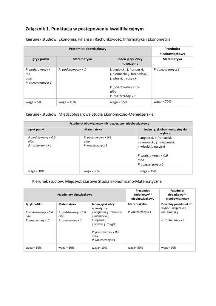 Załącznik 1. Punktacja w postępowaniu kwalifikacyjnym Kierunek studiów: Ekonomia, Finanse i Rachunkowość, Informatyka i Ekonometria Przedmiot obowiązkowy Język polski Matematyka Jeden język obcy nowożytny P. podstawowy x 0.6 albo P. rozszerzony x 1 P. podstawowy x 1 j. angielski, j. francuski, j. niemiecki, j. hiszpański, j. włoski, j. rosyjski P. podstawowy x 0.6 albo P. rozszerzony x 1 waga = 5% waga = 10% waga = 15% Przedmiot nieobowiązkowy Matematyka P. rozszerzony x 1 waga = 70% Kierunek studiów: Międzyobszarowe Studia Ekonomiczno-‐Menedżerskie Przedmiot obowiązkowy lub rozszerzony, nieobowiązkowy Język polski Matematyka P. podstawowy x 0,6 albo P. rozszerzony x 1 P. podstawowy x 0,6 albo P. rozszerzony x 1 waga = 30% waga = 35% Jeden język obcy nowożytny do wyboru j. angielski, j. francuski, j. niemiecki, j. hiszpański, j. włoski, j. rosyjski P. podstawowy x 0.6 albo P. rozszerzony x 1 waga = 35% Kierunek studiów: Międzyobszarowe Studia Ekonomiczno-‐Matematyczne Przedmioty obowiązkowe Przedmiot dodatkowy** nieobowiązkowy Przedmiot dodatkowy** nieobowiązkowy Język polski P. podstawowy x 0.6 albo P. rozszerzony x 1 Matematyka P. podstawowy x 0.6 albo P. rozszerzony x 1 Jeden język obcy nowożytny j. angielski, j. francuski, j. niemiecki, j. hiszpański, j. włoski, j. rosyjski P. podstawowy x 0.6 albo P. rozszerzony x 1 Matematyka P. rozszerzony x 1 Dowolny przedmiot do wyboru włącznie z matematyką P. rozszerzony x 1 waga = 10% waga = 10% waga= 10% waga= 50% waga= 20%
