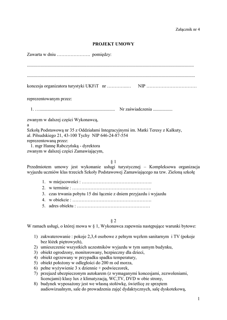 Załącznik nr 4 PROJEKT UMOWY Zawarta w dniu …………………. pomiędzy: .................................................................................................................................................. ................................................................................................................................................... koncesja organizatora turystyki UKFiT nr ………….… NIP …………………………… reprezentowanym przez: 1. ….................................................................. Nr zaświadczenia ................. zwanym w dalszej części Wykonawcą, a Szkołą Podstawową nr 35 z Oddziałami Integracyjnymi im. Matki Teresy z Kalkuty, al. Piłsudskiego 21, 43-100 Tychy NIP 646-24-87-554 reprezentowaną przez: 1. mgr Hannę Rabczyńską - dyrektora zwanym w dalszej części Zamawiającym, §1 Przedmiotem umowy jest wykonanie usługi turystycznej – Kompleksowa organizacja wyjazdu uczniów klas trzecich Szkoły Podstawowej Zamawiającego na tzw. Zieloną szkołę 1. 2. 3. 4. 5. w miejscowości : ………………………………………. w terminie : ……………………………………………. czas trwania pobytu 15 dni łącznie z dniem przyjazdu i wyjazdu w obiekcie : ……………………………………………. adres obiektu : ………………………………………… §2 W ramach usługi, o której mowa w § 1, Wykonawca zapewnia następujące warunki bytowe: 1) zakwaterowanie : pokoje 2,3,4 osobowe z pełnym węzłem sanitarnym i TV (pokoje bez łóżek piętrowych), 2) umieszczenie wszystkich uczestników wyjazdu w tym samym budynku, 3) obiekt ogrodzony, monitorowany, bezpieczny dla dzieci, 4) obiekt ogrzewany w przypadku spadku temperatury, 5) obiekt położony w odległości do 200 m od morza, 6) pełne wyżywienie 3 x dziennie + podwieczorek, 7) przejazd ubezpieczonym autokarem (z wymaganymi koncesjami, zezwoleniami, licencjami) klasy lux z klimatyzacją, WC,TV, DVD w obie strony, 8) budynek wyposażony jest we własną stołówkę, świetlicę ze sprzętem audiowizualnym, sale do prowadzenia zajęć dydaktycznych, salę dyskotekową, 1 9) ośrodek posiada: boiska sportowe ( do siatkówki, koszykówki), plac zabaw, stoły do ping-ponga, miejsce na ognisko na terenie obiektu, 10) pomoc przy wnoszeniu i wynoszeniu bagaży. §3 W ramach ceny skierowania Wykonawca usługi, zobowiązuje się do zapewnienia następujących świadczeń: 1) zapewnienie obsługi dwóch wykwalifikowanych kierowców na jeden autokar 2) w przypadku awarii autokaru Wykonawca zapewnia autokar zastępczy na własny koszt 3) …...miejsca bezpłatne dla opiekunów klas zwykłych (jeden na 15 uczestników), 2 miejsca bezpłatne dla opiekunów klasy integracyjnej oraz bezpłatne miejsce dla kierownika kolonii 4) oddzielne pokoje dla opiekunów i kierownika kolonii 5) trzy wycieczki autokarowe: ….............................................................................................................................................. ….............................................................................................................................................. ….............................................................................................................................................. 6) rejs statkiem po morzu, 7) całodobowa opieka medyczna: pielęgniarka 24 h, 8) w koniecznych przypadkach zapewnienie opieki lekarskiej w ramach ubezpieczenia zdrowotnego, polegającej na wezwaniu lekarza do obiektu lub niezwłocznym dowiezieniu uczestnika zielonej szkoły do punktu opieki medycznej ( przychodnia lub szpital) bezpłatnym transportem, 9) leki podstawowe : przeciwbólowe, przeciwgorączkowe, opatrunkowe, 10) wydzielona izolatka dla dzieci chorych ( w przypadku dziecka umieszczonego w izolatce opiekę nad nim zapewnia pielęgniarka), 11) zapewnienie sprzętu sportowego, 12) animacje prowadzone przez wykwalifikowanych animatorów 13) dodatkowe atrakcje (organizowanie dyskotek, chrztu morskiego, ogniska z pieczeniem kiełbasek, bezpłatny wstęp na basen, przejażdżka kolejką itp.), 14) suchy prowiant na drogę powrotną, 15) upominki dla uczestników ( czapeczki i dyplomy), 16) opieka rezydenta biura, 17) dostarczenie dokumentów wymaganych przy dofinansowaniu. §4 Wykonawca zabezpiecza usługi wymienione w § 2 i § 3 dla grupy liczącej …...... uczniów, ... opiekunów i kierownika kolonii. Ostateczna liczba uczestników tzw. Zielonej szkoły podana zostanie na 14 dni przed rozpoczęciem turnusu. §5 Koszt pobytu jednego dziecka wraz z przejazdem autokarowym wynosi:…….......…....……… słownie : ……………………………………………………………………………………….. (brutto) z podatkiem VAT 2 §6 Wykonawca ponosi pełną odpowiedzialność za bezpieczeństwo i opiekę nad dziećmi w czasie podróży, jak i pobytu, w ramach kosztów ujętych w oferowanej cenie. Wykonawca zobowiązany jest przez cały okres obowiązywania umowy do posiadania ważnej polisy ubezpieczeniowej od odpowiedzialności cywilnej w zakresie prowadzonej działalności związanej z przedmiotem zamówienia na sumę ubezpieczenia nie mniejszą niż określone w umowie wynagrodzenie brutto. §7 Strony umowy ustalają następujące terminy płatności: pierwsza wpłata w wysokości 25% wartości wszystkich skierowań pomniejszona o dopłatę z WFOŚiGW nastąpi do dnia 30.04.2015r. druga wpłata w wysokości 75% wartości wszystkich skierowań pomniejszona o dopłatę z WFOŚiGW nastąpi do dnia …...................... Środki przyznane z WFOŚiGW zostaną przekazane zgodnie z obowiązującymi przepisami. Forma płatności będzie realizowana przelewem na konto: ….................................................................................................................................................. §8 W przypadku konieczności odwołania imprezy 