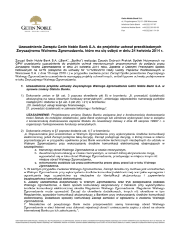 Uzasadnienie Zarządu Getin Noble Bank S.A. do projektów uchwał przedkładanych Zwyczajnemu Walnemu Zgromadzeniu, które ma się odbyć w dniu 24 kwietnia 2014 r. Zarząd Getin Noble Bank S.A. („Bank”, „Spółka”) realizując Zasady Dobrych Praktyk Spółek Notowanych na GPW przedstawia uzasadnienie do projektów uchwał merytorycznych proponowanych do podjęcia przez Zwyczajne Walne Zgromadzenie w dniu 24 kwietnia 2014 roku. Zgodnie z Dobrymi Praktykami Spółek Notowanych na GPW (załącznik do uchwały Nr 17/1249/2010 Rady Giełdy Papierów Wartościowych w Warszawie S.A. z dnia 19 maja 2010 r.) w przypadku zwołania przez Zarząd Spółki posiedzenia Zwyczajnego Walnego Zgromadzenia uzasadnienia wymagają projekty uchwał innych, aniżeli typowe uchwały podejmowane w toku Zwyczajnego Walnego Zgromadzenia. 1. Uzasadnienie projektu uchwały Zwyczajnego Walnego Zgromadzenia Getin Noble Bank S.A. w sprawie zmiany Statutu Banku. 1) Dokonanie zmian w §4 ust. 3 poprzez skreślenie pkt 8) w brzmieniu: „8. prowadzić działalność akwizycyjną na rzecz otwartych funduszy emerytalnych”, zmieniając odpowiednio numerację punktów następnych i dodanie w §4 ust. 3 pkt 20) i 21) w brzmieniu: „20. świadczyć usługi leasingu finansowego, 21. prowadzić działalność w zakresie faktoringu i forfaitingu”. UZASADNIENIE: Projektowana zmiana Statutu Banku związana jest z koniecznością dostosowania treści Statutu do rodzajów działalności, jakie Bank wykonuje lub zamierza wykonywać oraz w związku z koniecznością dostosowania zapisów Statutu do nowelizacji Ustawy z dnia 28 sierpnia 19997 r. o organizacji i funkcjonowaniu funduszy emerytalnych. 2) Dokonanie zmiany w §7 poprzez dodanie ust. 4-7 w brzmieniu: „4. Dopuszczalne jest uczestnictwo w Walnym Zgromadzeniu przy wykorzystaniu środków komunikacji elektronicznej, jeżeli Zarząd podejmie taką decyzję. Zarząd podejmuje decyzję, o której mowa w zdaniu poprzedzającym w przypadku spełnienia przez Bank warunków technicznych niezbędnych do udziału w Walnym Zgromadzeniu przy wykorzystaniu środków komunikacji elektronicznej obejmujących w szczególności: a. transmisję obrad Walnego Zgromadzenia w czasie rzeczywistym, b. dwustronną komunikację w czasie rzeczywistym, w ramach której akcjonariusze mogą wypowiadać się w toku obrad Walnego Zgromadzenia, przebywając w miejscu innym niż miejsce obrad Walnego Zgromadzenia, c. wykonywanie osobiście lub przez pełnomocnika prawa głosu przed lub w toku Walnego Zgromadzenia. 5. W każdym przypadku zwołania Walnego Zgromadzenia, Zarząd określa czy możliwe jest uczestnictwo w Walnym Zgromadzeniu przy wykorzystaniu środków komunikacji elektronicznej oraz jakie wymagania i ograniczenia tego uczestnictwa są niezbędne do identyfikacji akcjonariuszy i zapewnienia bezpieczeństwa komunikacji elektronicznej. 6. Zasady uczestnictwa akcjonariuszy w Walnym Zgromadzeniu oraz tryb postępowania podczas Walnego Zgromadzenia, a także sposób komunikacji akcjonariuszy z Bankiem przy wykorzystaniu środków komunikacji elektronicznej określa Regulamin Walnego Zgromadzenia. Regulamin Walnego Zgromadzenia może upoważnić Zarząd do określenia dodatkowych, innych niż określone w tym Regulaminie, sposobów komunikacji akcjonariuszy z Bankiem przy wykorzystaniu środków komunikacji elektronicznej. Dodatkowe sposoby komunikacji Zarząd zamieści w ogłoszeniu o zwołaniu Walnego Zgromadzenia. 7. Niezależnie od powyższego Bank może przeprowadzić samą transmisję obrad Walnego Zgromadzenia w sieci Internet oraz dokonać rejestracji obrad i umieszczenia zapisu z obrad na stronie internetowej Banku po ich zakończeniu.”; Getin Noble Bank Spółka Akcyjna z siedzibą przy ulicy Przyokopowej 33, 01-208 Warszawa, wpisana do rejestru przedsiębiorców Krajowego Rejestru Sądowego pod numerem 0000304735 przez Sąd Rejonowy dla m.st. Warszawy, XII Wydział Gospodarczy Krajowego Rejestru Sądowego, NIP 1080004850, REGON 141334039, wysokość kapitału zakładowego wynosi 2.650.143.319,00 złotych (wpłacony w całości). Opłata jak za połączenie lokalne wg taryfy operatora. UZASADNIENIE: Bank jako spółka, której akcje notowane są rynku regulowanym prowadzonym przez Giełdę Papierów Wartościowych w Warszawie S.A. jest zobowiązany do stosowania zasad ładu korporacyjnego określonych w „Dobrych Praktykach Spółek Notowanych na GPW”. Jedną z deklarowanych do stosowania przez Bank zasad jest zapewnienie akcjonariuszom, możliwości udziału w Walnych Zgromadzeniach przy wykorzystaniu środków komunikacji elektronicznej. W celu rozpoczęcia stosowania ww. zasady konieczna jest zmiana Statutu. Powyższa konieczność wynika również z zapisów Kodeksu Spółek Handlowych, w którym art. 406(5) stanowi, że statut spółki może dopuszczać udział w Walnym Zgromadzeniu przy wykorzystaniu środków komunikacji elektronicznej. Oznacza to, że do wprowadzenia przez Bank możliwości uczestniczenia w obradach Walnego Zgromadzenia na odległość potrzebna jest w każdym przypadku regulacja statutowa. 3) Uchylenie w §19 ust. 1 w brzmieniu: „1. Zarząd podejmuje decyzje w formie uchwały, chyba że ze Statutu lub Regulaminu Zarządu uchwalonego w trybie określonym w § 16 ust. 2, wynika co innego. Uchwały podejmowane są na posiedzeniach, przy czym dla ważności uchwały wymagane są podpisy przynajmniej połowy składu Zarządu.” i nadanie mu nowego brzmienia: „1. Zarząd podejmuje decyzje w formie uchwały, chyba że ze Statutu lub Regulaminu Zarządu uchwalonego w trybie określonym w § 16 ust. 2, wynika co innego. Uchwały podejmowane są na posiedzeniach.”; UZASADNIENIE: Propozycje zmian Statutu Spółki odnoszące do nadania nowego brzmienia § 19 ust. 1 Statutu Spółki mają na celu usprawnienie prac Zarządu. 4) Skreślenie §23 ust. 3 w brzmieniu: „3. W ramach departamentu mogą funkcjonować komórki organizacyjne w postaci wydziałów 