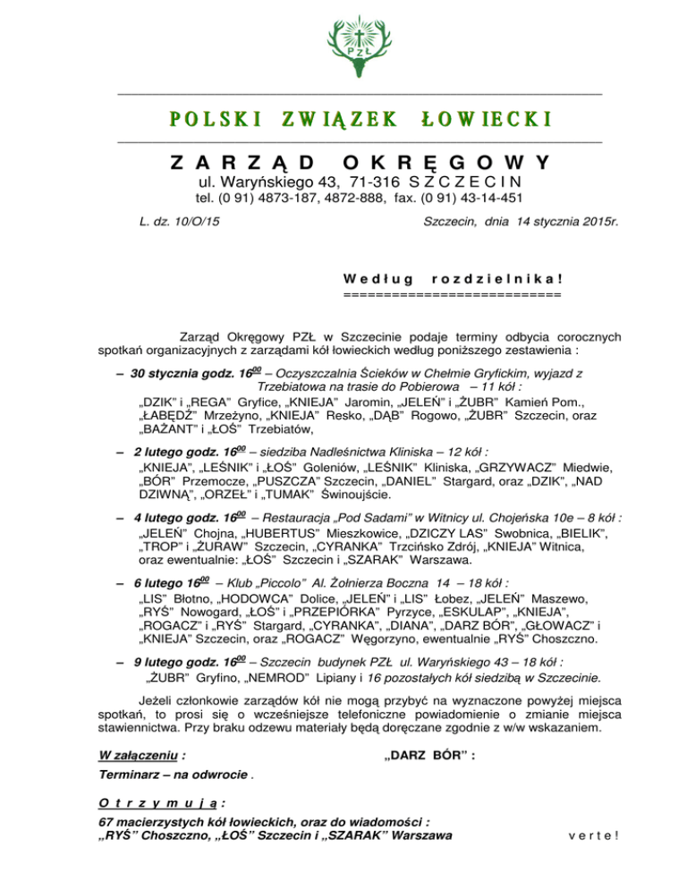 ______________________________________________________________________ ______________________________________________________________________ Z A R Z Ą D O K R Ę G O W Y ul. Waryńskiego 43, 71-316 S Z C Z E C I N tel. (0 91) 4873-187, 4872-888, fax. (0 91) 43-14-451 L. dz. 10/O/15 Szczecin, dnia 14 stycznia 2015r. Według rozdzielnika! =========================== Zarząd Okręgowy PZŁ w Szczecinie podaje terminy odbycia corocznych spotkań organizacyjnych z zarządami kół łowieckich według poniższego zestawienia : – 30 stycznia godz. 1600 – Oczyszczalnia Ścieków w Chełmie Gryfickim, wyjazd z Trzebiatowa na trasie do Pobierowa – 11 kół : „DZIK” i „REGA” Gryfice, „KNIEJA” Jaromin, „JELEŃ” i „ŻUBR” Kamień Pom., „ŁABĘDŹ” Mrzeżyno, „KNIEJA” Resko, „DĄB” Rogowo, „ŻUBR” Szczecin, oraz „BAŻANT” i „ŁOŚ” Trzebiatów, – 2 lutego godz. 1600 – siedziba Nadleśnictwa Kliniska – 12 kół : „KNIEJA”, „LEŚNIK” i „ŁOŚ” Goleniów, „LEŚNIK” Kliniska, „GRZYWACZ” Miedwie, „BÓR” Przemocze, „PUSZCZA” Szczecin, „DANIEL” Stargard, oraz „DZIK”, „NAD DZIWNĄ”, „ORZEŁ” i „TUMAK” Świnoujście. – 4 lutego godz. 1600 – Restauracja „Pod Sadami” w Witnicy ul. Chojeńska 10e – 8 kół : „JELEŃ” Chojna, „HUBERTUS” Mieszkowice, „DZICZY LAS” Swobnica, „BIELIK”, „TROP” i „ŻURAW” Szczecin, „CYRANKA” Trzcińsko Zdrój, „KNIEJA” Witnica, oraz ewentualnie: „ŁOŚ” Szczecin i „SZARAK” Warszawa. – 6 lutego 1600 – Klub „Piccolo” Al. Żołnierza Boczna 14 – 18 kół : „LIS” Błotno, „HODOWCA” Dolice, „JELEŃ” i „LIS” Łobez, „JELEŃ” Maszewo, „RYŚ” Nowogard, „ŁOŚ” i „PRZEPIÓRKA” Pyrzyce, „ESKULAP”, „KNIEJA”, „ROGACZ” i „RYŚ” Stargard, „CYRANKA”, „DIANA”, „DARZ BÓR”, „GŁOWACZ” i „KNIEJA” Szczecin, oraz „ROGACZ” Węgorzyno, ewentualnie „RYŚ” Choszczno. – 9 lutego godz. 1600 – Szczecin budynek PZŁ ul. Waryńskiego 43 – 18 kół : „ŻUBR” Gryfino, „NEMROD” Lipiany i 16 pozostałych kół siedzibą w Szczecinie. Jeżeli członkowie zarządów kół nie mogą przybyć na wyznaczone powyżej miejsca spotkań, to prosi się o wcześniejsze telefoniczne powiadomienie o zmianie miejsca stawiennictwa. Przy braku odzewu materiały będą doręczane zgodnie z w/w wskazaniem. W załączeniu : „DARZ BÓR” : Terminarz – na odwrocie . O t r z y m u j ą: 67 macierzystych kół łowieckich, oraz do wiadomości : „RYŚ” Choszczno, „ŁOŚ” Szczecin i „SZARAK” Warszawa verte! -2- OCENA i WYCENA TROFEÓW za sezon łowiecki 2014/15 : ================================================== 21 lutego godz. 1100 – 1500 PŁOTY Nowy Zamek ul. Sienkiewicza 3 22 lutego godz. 1100 – 1500 WITNICA Restauracja „Pod Sadami” ul. Chojeńska 10e 25 lutego godz. 1600 – 2000 GOLENIÓW siedziba Nadleśnictwa ul. Parkowa 1 28 lutego godz. 1000 – 1600 STARGARD Klub „Piccolo” Al. Żołnierza Boczna 14 1 marca godz. 1000 – 1600 SZCZECIN siedziba organizacji ul. Waryńskiego 43 Druki arkuszy oceny (wykazów samców) według obowiązującego wzoru do pobrania na naszej stronie internetowej www.pzl.szczecin.pl, zakładka – druki dla kół łowieckich. Zestawienia odstrzelonych jeleni byków muszą być sporządzone rozdzielnie dla poszczególnych nadleśnictw (według właściwości miejsca zatwierdzania planów). Dla jeleni byków należy na końcu wykazów wyszczególnić ilościowo wszystkie ubytki i sztuki pozyskane na polowaniach dewizowych, oraz dołączyć formularze z przeprowadzonych ocen tych odstrzałów (jeżeli nie zostały już wcześniej przekazane) . Czynności do wyświadczenia : 1. Powiadomienie z odpowiednim wyprzedzeniem czasowym członków kół o lokalizacji punktów i czasie oceny prawidłowości odstrzału i wyceny trofeów. 2. Do dnia 20 lutego br. przekazanie do ZO PZŁ właściwego dla miejsca położenia obwodu wykazów samców zwierzyny płowej pozyskanych w sez. łow. 2014/15. 3. Ustalenie stanów liczebności zwierzyny w nadleśnictwie do dnia 10 marca br. 4. Uzgadnianie projektów rocznych planów łowieckich w siedzibie organizacji wyłącznie w terminie 16 do 20 marca br. (do 13.03. uzgodnienia PZŁ - nadleśnictwa). 5. Do dnia 21 marca br. złożenie we właściwych terytorialnie nadleśnictwach projektów rocznych planów łowieckich na rok gospodarczy 2015/16, z opiniami wójtów (burmistrzów, prezydentów miast) i uzgodnionych z ZO PZŁ. 6. Przekazanie kopii zatwierdzonych planów odpowiednim ZO PZŁ. 7. Do dnia 20 kwietnia br. złożenie rocznych sprawozdań ŁOW-1 w macierzystych ZO PZŁ, oraz załączników w ZO właściwych dla miejsca położenia obwodów. OFERTA SPRZEDAŻY DLA KÓŁ ŁOWIECKICH Z MAGAZYNU ZO PZŁ SZCZECIN L.p. P o z y c j a – t y t u ł (o p i s) Cena Ilość egz. 1. ALBUM ŁOWIECTWO (dwa tomy) 110,00 19 2. ALBUM ŁOWIECTWO – HUNTING wydanie dwujęzyczne 121,90 76 3. ŁOWIECTWO – ZESZYT EDUKACYJNY wydanie dla dzieci szkół podstawowych (św. Hubert, sygnały myśliwskie, tradycje myśliwskie, psy myśliwskie, polowanie z ptakami łowczymi, zwierzyna gruba, zwierzyna drobna, zwierzęta pod ścisłą ochroną, ochrona pól i lasów, opieka nad zwierzyną, jak zachować się w lesie, myśliwi dzieciom, zadania tropiciela) 8,00 640 4. KOLOROWANKI – CZYM ZAJMUJĄ SIĘ MYŚLIWI ? (dla dzieci w wieku do 6 lat) 4,00 620 5. ŁOWIECTWO – ZESZYT EDUKACYJNY DLA GIMNAZJUM (historia, tradycje, zwyczaje, język, instrumenty dziczyzna, ochrona przyrody, pies, zwierzęta łowne) 8,00 200
