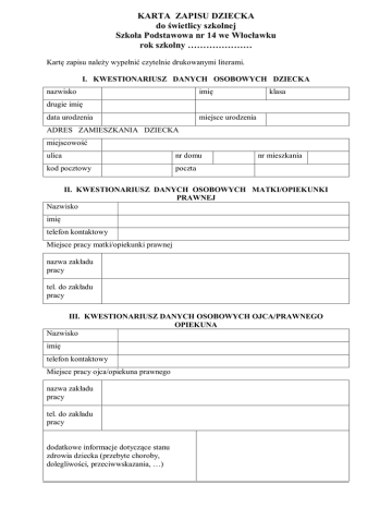 KARTA ZAPISU DZIECKA do świetlicy szkolnej Szkoła Podstawowa nr 14 we Włocławku rok szkolny ………………… Kartę zapisu należy wypełnić czytelnie drukowanymi literami. I. KWESTIONARIUSZ DANYCH OSOBOWYCH DZIECKA nazwisko imię klasa drugie imię data urodzenia miejsce urodzenia ADRES ZAMIESZKANIA DZIECKA miejscowość ulica nr domu kod pocztowy poczta nr mieszkania II. KWESTIONARIUSZ DANYCH OSOBOWYCH MATKI/OPIEKUNKI PRAWNEJ Nazwisko imię telefon kontaktowy Miejsce pracy matki/opiekunki prawnej nazwa zakładu pracy tel. do zakładu pracy III. KWESTIONARIUSZ DANYCH OSOBOWYCH OJCA/PRAWNEGO OPIEKUNA Nazwisko imię telefon kontaktowy Miejsce pracy ojca/opiekuna prawnego nazwa zakładu pracy tel. do zakładu pracy dodatkowe informacje dotyczące stanu zdrowia dziecka (przebyte choroby, dolegliwości, przeciwwskazania, …) IV. INFORMACJE DOTYCZĄCE POBYTU DZIECKA W ŚWIETLICY Wyrażam zgodę / nie wyrażam zgody* na samodzielny powrót dziecka ze świetlicy do domu o godz. ………. * niepotrzebne skreślić Dziecko będzie przebywało w świetlicy w następujących godzinach: poniedziałek wtorek od godz. ……… do godz. ……… i od godz. ……… do godz. ……… od godz. ……… do godz. ……… i od godz. ……… do godz. ……… środa od godz. ……… do godz. ……… i od godz. ……… do godz. ……… czwartek od godz. ……… do godz. ……… i od godz. ……… do godz. ……… piątek od godz. ……… do godz. ……… i od godz. ……… do godz. ……… Dziecko będzie odbierane ze świetlicy o godz. ………… wyłącznie przez niżej wymienione osoby: imię i nazwisko stopień pokrewieństwa telefon kontaktowy Inne informacje: - czy dziecko korzysta z obiadów: ……… - czy dziecko może odrabiać prace domowe w świetlicy: …………………… - inne: V. Oświadczenie 1. Uprzedzony o odpowiedzialności karnej z art. 233 KK oświadczam, że podane dane są zgodne ze stanem faktycznym. 2. Wyrażam zgodę na przetwarzanie danych osobowych zawartych w karcie zapisu zgodnie z ustawą z dnia 29 sierpnia 1997 r. o ochronie danych osobowych (Dz. U. z 2002 r. Nr 101, poz. 926 z późn. zm.) 3. Mam świadomość, że świetlica szkolna odpowiada za bezpieczeństwo dziecka w godzinach pracy czyli od poniedziałku do piątku w godz. 700 – 1630. 4. Zobowiązuję się do odbioru dziecka najpóźniej do godz. 1630. 5. Zobowiązuję się o wszystkich zmianach danych zawartych w kwestionariuszu powiadamiać wychowawcę świetlicy. 6. W przypadku rezygnacji z uczęszczania do świetlicy szkolnej zobowiązuję się niezwłocznie powiadomić wychowawcę świetlicy i wypełnić kartę rezygnacji. Włocławek, ………… data wypełnienia karty ………………………………………………… czytelny podpis rodzica/prawnego opiekuna