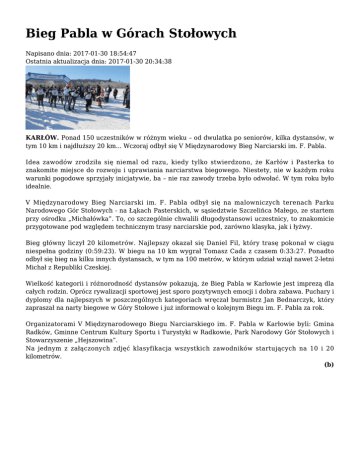 Bieg Pabla w Górach Stołowych Napisano dnia: 2017-01-30 18:54:47 Ostatnia aktualizacja dnia: 2017-01-30 20:34:38 KARŁÓW. Ponad 150 uczestników w różnym wieku – od dwulatka po seniorów, kilka dystansów, w tym 10 km i najdłuższy 20 km... Wczoraj odbył się V Międzynarodowy Bieg Narciarski im. F. Pabla. Idea zawodów zrodziła się niemal od razu, kiedy tylko stwierdzono, że Karłów i Pasterka to znakomite miejsce do rozwoju i uprawiania narciarstwa biegowego. Niestety, nie w każdym roku warunki pogodowe sprzyjały inicjatywie, ba – nie raz zawody trzeba było odwołać. W tym roku było idealnie. V Międzynarodowy Bieg Narciarski im. F. Pabla odbył się na malowniczych terenach Parku Narodowego Gór Stołowych - na Łąkach Pasterskich, w sąsiedztwie Szczelińca Małego, ze startem przy ośrodku „Michałówka”. To, co szczególnie chwalili długodystansowi uczestnicy, to znakomicie przygotowane pod względem technicznym trasy narciarskie pod, zarówno klasyka, jak i łyżwy. Bieg główny liczył 20 kilometrów. Najlepszy okazał się Daniel Fil, który trasę pokonał w ciągu niespełna godziny (0:59:23). W biegu na 10 km wygrał Tomasz Cada z czasem 0:33:27. Ponadto odbył się bieg na kilku innych dystansach, w tym na 100 metrów, w którym udział wziął nawet 2-letni Michał z Republiki Czeskiej. Wielkość kategorii i różnorodność dystansów pokazują, że Bieg Pabla w Karłowie jest imprezą dla całych rodzin. Oprócz rywalizacji sportowej jest sporo pozytywnych emocji i dobra zabawa. Puchary i dyplomy dla najlepszych w poszczególnych kategoriach wręczał burmistrz Jan Bednarczyk, który zapraszał na narty biegowe w Góry Stołowe i już informował o kolejnym Biegu im. F. Pabla za rok. Organizatorami V Międzynarodowego Biegu Narciarskiego im. F. Pabla w Karłowie byli: Gmina Radków, Gminne Centrum Kultury Sportu i Turystyki w Radkowie, Park Narodowy Gór Stołowych i Stowarzyszenie „Hejszowina”. Na jednym z załączonych zdjęć klasyfikacja wszystkich zawodników startujących na 10 i 20 kilometrów. (b)