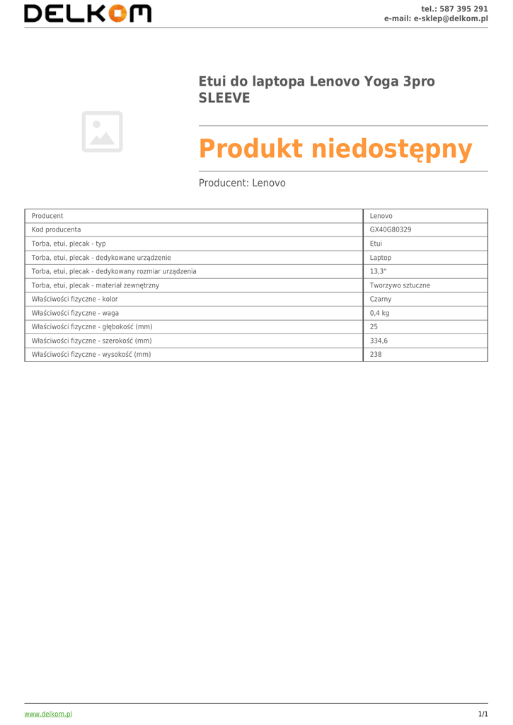 tel.: 587 395 291 e-mail: [email protected] Etui do laptopa Lenovo Yoga 3pro SLEEVE Produkt niedostępny Producent: Lenovo Producent Lenovo Kod producenta GX40G80329 Torba, etui, plecak - typ Etui Torba, etui, plecak - dedykowane urządzenie Laptop Torba, etui, plecak - dedykowany rozmiar urządzenia 13,3" Torba, etui, plecak - materiał zewnętrzny Tworzywo sztuczne Właściwości fizyczne - kolor Czarny Właściwości fizyczne - waga 0,4 kg Właściwości fizyczne - głębokość (mm) 25 Właściwości fizyczne - szerokość (mm) 334,6 Właściwości fizyczne - wysokość (mm) 238 www.delkom.pl 1/1