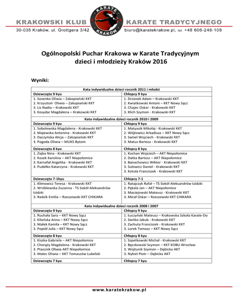 Ogólnopolski Puchar Krakowa w Karate Tradycyjnym dzieci i młodzieży Kraków 2016 Wyniki: Kata indywidualne dzieci rocznik 2011 i młodsi Dziewczęta 9 kyu Chłopcy 9 kyu 1. Sosenko Oliwia – Zakopiański KKT 1. Drzonek Adam – Krakowski KKT 2. Krzysztoń Oliwia – Zakopiański KKT 2. Kwiatkowski Antoni – KKT Nowy Sącz 3. Lis Nadia – Krakowski KKT 3. Chajec Oskar - Krakowski KKT 3. Kosydar Magdalena – Krakowski KKT 3. Klich Szymon - Krakowski KKT Kata indywidualne dzieci rocznik 2010 i 2009 Dziewczęta 9 kyu Chłopcy 9 kyu 1. Sobolewska Magdalena - Krakowski KKT 1. Matyasik Mikołaj - Krakowski KKT 2. Majewska Antonina - Krakowski KKT 2. Wójtowicz Arkadiusz – KKT Nowy Sącz 3. Daczyńska Alicja – Zakopiański KKT 3. Samel Wojciech - Krakowski KKT 3. Pogoda Oliwia – MUKS Bytom 3. Matus Bartosz - Krakowski KKT Dziewczęta 8 kyu 1. Zięba Nina - Krakowski KKT 2. Kosek Karolina – AKT Niepołomice 3. Karnafał Angelika - Krakowski KKT 3. Pudełko Katarzyna - Krakowski KKT Chłopcy 8 kyu 1. Kochan Wojciech – AKT Niepołomice 2. Datka Bartosz – AKT Niepołomice 3. Banachowicz Wiktor - Krakowski KKT 3. Sułowicz Daniel - Krakowski KKT 3. Kotuła Franciszek - Krakowski KKT Dziewczęta 7-1kyu 1. Klimowicz Teresa - Krakowski KKT 2. Wróblewska Zuzanna - TS Sokół Aleksandrów Łódzki 3. Radzik Emilia – Rzeszowski KKT CHIKARA Chłopcy 7-1 1. Ratajczyk Rafał – TS Sokół Aleksandrów Łódzki 2. Pękala Jan – AKT Niepołomice 3. Maciejowski Mateusz - Krakowski KKT 3. Micał Oskar – Rzeszowski KKT CHIKARA Kata indywidualne dzieci rocznik 2008 i 2007 Dziewczęta 9 kyu Chłopcy 9 kyu 1. Ruchała Sara – KKT Nowy Sącz 1. Łuczyński Mateusz – Krakowska Szkoła Karate-Do 2. Kilańska Anna – KKT Nowy Sącz 2. Sieńko Jakub - Krakowski KKT 3. Małek Kamila – KKT Nowy Sącz 3. Zachuta Franciszek - Krakowski KKT 3. Popiół Julia – KKT Nowy Sącz 3. Lorek Tomasz – KKT Nowy Sącz Dziewczęta 8 kyu 1. Kiszka Gabriela – AKT Niepołomice 2. Chorąży Magdalena - Krakowski KKT 3. Ptasznik Oliwia AKT Niepołomice 3. Malec Oliwia – KKT Tomaszów Lubelski Chłopcy 8 kyu 1. Szpetkowski Michał - Krakowski KKT 2. Bęczkowski Szymon – KKT KOBU Wrocław 3. Wojtunik Szymon – Dębicka AKT 3. Nykiel Piotr – Dębicka AKT Dziewczęta 7 kyu Chłopcy 7 kyu 1. Wikira Wiktoria – Roztoczański KKT 2. Gieras Julia – AKT Niepołomice 3. Tarnowska Iga – Roztoczański KKT 3. Kurzyńska Adrianna – KS Hikari Oleśnica Dziewczęta 6 kyu 1. Nalepa Aleksandra – AKT Niepołomice 2. Czapnik Zuzanna - Krakowski KKT 3. Klimek Rosita - Krakowski KKT 3. Zapała Weronika - Krakowski KKT 1. Raniszewski Kacper – AKT Niepołomice 2. Azierski Kuba – AKT Niepołomice 3. Olbiński Aleksander – TS Sokól Aleksandrów Łódzki 3. Kasprzyk Krzysztof – AKT Niepołomice Chłopcy 6 kyu 1. Kochan Bartłomiej – AKT Niepołomice 2. Łaskarzewski Daniel - Krakowski KKT 3. Szkudlarek Oliwier – TS Sokół Aleksandrów Łódzki 3. Frątczak Gabriel – KK 44 Łódź Dziewczęta 5-1 kyu 1. Ostrowska Monika – Lubelski KKT 2. Jaworek Kinga – AKT Niepołomice 3. Szablewska Milena – Rzeszowski KKT CHIKARA 3. Czechowska Ewa - Krakowski KKT Chłopcy 5-1 kyu 1. Mazur Hubert – AKT Niepołomice 2. Janusz Jan – AKT Niepołomice 3. Walczyk Karol – Lubelski KKT 3. Cieślak Paweł – Rzeszowski KKT CHIKARA Kata indywidualne dzieci rocznik 2006 i 2005 Dziewczęta 9 kyu Chłopcy 9 kyu 1. Baliczek Zuzanna – KKT Nowy Sącz 1. Nosal Michał – KKT Nowy Sącz 2. Piech Elżbieta – KKT Nowy Sącz 2. Potoczek Marcin – KKT Nowy Sącz 3. Żółtek Patrycja – Zakopiański KKT 3. Stanek Filip – KKT Nowy Sącz 3. Siedlarz Zofia – KKT Nowy Sącz 3. Standera Dawid – MUKS Bytom Dziewczęta 8 kyu 1. Datka Izabela – AKT Niepołomice 2. Mosór Kinga – KKT Tomaszów Lubelski 3. Macioł Klaudia – Zakopiański KKT 3. Bryniarska Paulina – Zakopiański KKT Chłopcy 8 kyu 1. Gawroński Igor – TS Sokół Aleksandrów Łódzki 2. Irzyk Hubert – AKT Niepołomice 3. Prochwicz Jakub - Krakowski KKT 3. Janta Dawid – MUKS Bytom Dziewczęta 7 kyu 1. Piasecka Aleksandra – KS Hikari Oleśnica 2. Błach Aleksandra - Krakowski KKT 3. Czarnota Blanka - Krakowski KKT 3. Berka Daria – Dębicka AKT Chłopcy 7 kyu 1. Sadowski Jan – TS Sokół Aleksandrów Łódzki 2. Mysera Bartosz – TS Sokół Aleksandrów Łódzki 3. Kolbusz Mikołaj – Dębicka AKT 3. Owczarek Jakub – TS Sokół Aleksandrów Łódzki Dziewczęta 6 kyu 1. Krawiec Wiktoria - Krakowski KKT 2. Kostowska Hanna – TS Sokół Aleksandrów Łódzki 3. Pietrusiak Natalia - Krakowski KKT 3. Skiba Karolina – Dębicka AKT Chłopcy 6 kyu 1. Czapnik Michał - Krakowski KKT 2. Krupacki Wojciech – KKT KOBU Wrocław 3. Stadnicki Igor - Krakowski KKT 3. Grzesiuk Mikołaj - Krakowski KKT Dziewczęta 5-4 kyu 1. Porębska Magdalena – KS Hikari Oleśnica 2. Taranczewska Zofia - Krakowski KKT 3. Karolewska Oliwia – KKT KOBU Wrocław 3. Pękala Oliwia – AKT Niepołomice Chłopcy 5-4 kyu 1. Joniec Piotr – AKT Niepołomice 2. Pietrzak- Rogala Hubert – KS Hikari Oleśnica 3. Luberda Mieszko – AKT Niepołomice 3. Kalinowski Jacek – DAK we Wrocławiu Chłopcy 3-1 kyu 1. Czechowski Antoni - Krakowski KKT 2. Chłopicki Karol - Krakowski KKT 3. Kupczak Roch – KKT KOBU Wrocław 3. Wilk Oskar – Rzeszowski KKT CHIKARA Kata indywidualne dzieci rocznik 2004 i 2003 Dziewczęta 9 kyu Chłopcy 9 kyu 1. Popiół Magdalena - KKT Nowy Sącz 1. Pazgan Jarosław – KKT Nowy Sącz 2. Mrówka Oliwia – KKT Nowy Sącz 2. Ścisłowicz Kamil – Zakopiański KKT 3. Kraus Karolina – Zakopiański KKT 3. Popiół Tymon – KKT Nowy Sącz 3. Kuriata Martyna – MUKS Bytom Dziewczęta 8 kyu i 7 kyu 1. Bałazińska Dominika - Krakowska Szkoła Karate-Do 2. Kośka Oliwia – TS Sokół Aleksandrów Łódzki 3. Panek Natalia -Rzeszowski KKT CHIKARA 3. Zawłocka Anna – Krakowska Szkoła Karate-Do Chłopcy 8 kyu 1. Płatek Filip – AKT Niepołomice 2