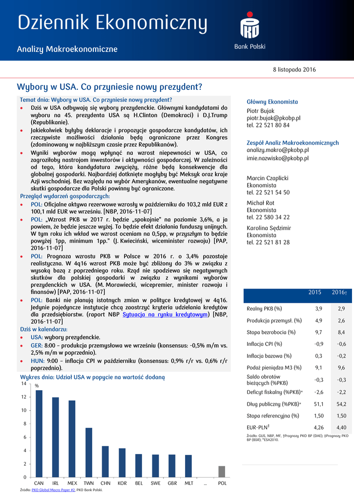 Dziennik Ekonomiczny Analizy Makroekonomiczne 8 listopada 2016 Wybory w USA. Co przyniesie nowy prezydent? Temat dnia: Wybory w USA. Co przyniesie nowy prezydent? Dziś w USA odbywają się wybory prezydenckie. Głównymi kandydatami do wyboru na 45. prezydenta USA są H.Clinton (Demokraci) i D.J.Trump (Republikanie). Jakiekolwiek byłyby deklaracje i propozycje gospodarcze kandydatów, ich rzeczywiste możliwości działania będą ograniczane przez Kongres (zdominowany w najbliższym czasie przez Republikanów). Wyniki wyborów mogą wpłynąć na wzrost niepewności w USA, co zagroziłoby nastrojom inwestorów i aktywności gospodarczej. W zależności od tego, która kandydatura zwycięży, różne będą konsekwencje dla globalnej gospodarki. Najbardziej dotknięte mogłyby być Meksyk oraz kraje Azji wschodniej. Bez względu na wybór Amerykanów, ewentualne negatywne skutki gospodarcze dla Polski powinny być ograniczone. Przegląd wydarzeń gospodarczych: POL: Oficjalne aktywa rezerwowe wzrosły w październiku do 103,2 mld EUR z 100,1 mld EUR we wrześniu. [NBP, 2016-11-07] POL: „Wzrost PKB w 2017 r. będzie „spokojnie” na poziomie 3,6%, a ja powiem, że będzie jeszcze wyżej. To będzie efekt działania funduszy unijnych. W tym roku ich wkład we wzrost oceniam na 0,5pp, w przyszłym to będzie powyżej 1pp, minimum 1pp.” (J. Kwieciński, wiceminister rozwoju) [PAP, 2016-11-07] POL: Prognoza wzrostu PKB w Polsce w 2016 r. o 3,4% pozostaje realistyczna. W 4q16 wzrost PKB może być zbliżony do 3% w związku z wysoką bazą z poprzedniego roku. Rząd nie spodziewa się negatywnych skutków dla polskiej gospodarki w związku z wynikami wyborów prezydenckich w USA. (M. Morawiecki, wicepremier, minister rozwoju i finansów) [PAP, 2016-11-07] POL: Banki nie planują istotnych zmian w polityce kredytowej w 4q16. Jedynie pojedyncze instytucje chcą zaostrzyć kryteria udzielania kredytów dla przedsiębiorstw. (raport NBP Sytuacja na rynku kredytowym) [NBP, 2016-11-07] Dziś w kalendarzu: USA: wybory prezydenckie. GER: 8:00 – produkcja przemysłowa we wrześniu (konsensus: -0,5% m/m vs. 2,5% m/m w poprzednio). HUN: 9:00 – inflacja CPI w październiku (konsensus: 0,9% r/r vs. 0,6% r/r poprzednio). Główny Ekonomista Wykres dnia: Udział USA w popycie na wartość dodaną 14 % 12 Piotr Bujak [email protected] tel. 22 521 80 84 Zespół Analiz Makroekonomicznych [email protected] [email protected] Marcin Czaplicki Ekonomista tel. 22 521 54 50 Michał Rot Ekonomista tel. 22 580 34 22 Karolina Sędzimir Ekonomista tel. 22 521 81 28 2015 2016† Realny PKB (%) 3,9 2,9 Produkcja przemysł. (%) 4,9 2,6 Stopa bezrobocia (%) 9,7 8,4 Inflacja CPI (%) -0,9 -0,6 Inflacja bazowa (%) 0,3 -0,2 Podaż pieniądza M3 (%) 9,1 9,6 Saldo obrotów bieżących (%PKB) -0,3 -0,3 Deficyt fiskalny (%PKB)* -2,6 -2,2 Dług publiczny (%PKB)* 51,1 54,2 Stopa referencyjna (%) 1,50 1,50 4,26 4,40 10 8 ‡ EUR-PLN Źródło: GUS, NBP, MF, †Prognozy PKO BP (DAE); ‡Prognozy PKO BP (BSR); *ESA2010. 6 4 1| 2 0 CAN IRL MEX TWN CHN Źródło: PKO Global Macro Paper #2, PKO Bank Polski. KOR BEL SWE GBR MLT … POL Dziennik ekonomiczny 08.11.2016 Wybory w USA. Co przyniesie nowy prezydent? Dziś w USA odbywają się wybory prezydenckie. Głównymi kandydatami do wyboru na 45. prezydenta USA są H.Clinton (Demokraci) i D.J.Trump (Republikanie). Jakiekolwiek byłyby deklaracje i propozycje gospodarcze kandydatów, ich rzeczywiste możliwości działania będą ograniczane przez Kongres (zdominowany w najbliższym czasie przez Republikanów). Wyniki wyborów mogą wpłynąć na wzrost niepewności w USA, co zagroziłoby nastrojom inwestorów i aktywności gospodarczej. W zależności od tego, która kandydatura zwycięży, różne będą konsekwencje dla globalnej gospodarki. Najbardziej dotknięte mogłyby być Meksyk oraz kraje Azji wschodniej. Bez względu na wybór Amerykanów, ewentualne negatywne skutki gospodarcze dla Polski powinny być ograniczone. Dziś w USA odbywają się wybory prezydenckie. Głównymi kandydatami do wyboru na 45. prezydenta USA są H.Clinton (Demokraci) i D.J.Trump (Republikanie). Obojga kandydatów wiele dzieli, ale łączy ich duży negatywny elektorat (por. wykres na marginesie), co czyni wynik wyborów wciąż dużą niewiadomą. Odsetek Amerykanów, którzy nie lubią danego kandydata 70 % 65 60 55 50 Clinton 45 sty 16 kwi 16 Trump lip 16 paź 16 Źródło: www.realclearpolitics.com, PKO Bank Polski. Wyniki sondaży prezydenckich w USA* 60 % Clinton 55 Trump 50 45 Niewiadomą pozostaje polityka gospodarcza w USA po wyborach, ponieważ w trakcie kampanii kandydaci (w szczególności D.J.Trump) często wycofywali się ze swoich propozycji, bądź składali sprzeczne deklaracje. Należy jednak pamiętać, że jakiekolwiek byłyby propozycje gospodarcze kandydatów ich rzeczywiste możliwości działania będą ograniczane przez Kongres, który w najbliższym czasie (co najmniej w Izbie Deputowanych) będzie zdominowany przez Republikanów (nie zawsze podzielających poglądy Trumpa). Zgody Kongresu będą wymagały m.in. zmiany w podatkach, systemie pomocy społecznej, czy umowach handlowych. Prezydent może jednak stanowić prawo poprzez dekrety (mogą zostać uchylone przez przez Kongres większością 2/3 głosów w obu Izbach), np. nakładać cła, wpływać na proces udzielania wiz, czy wydalania imigrantów, wycofywać się z umów handlowych. Z tego względu, w szczególności wybór D.J.Trumpa może przyczynić się do wzrostu niepewności i wahań na rynkach finansowych (por. wykres na marginesie). H.Clinton będzie postrzegana bardziej jako kontynuatorka polityki B.Obamy (status quo). Oboje kandydatów różni przede wszystkim diagnoza problemów amerykańskiej gospodarki. Dla H.Clinton są to nierówności gospodarcze, stąd jej program charakteryzują kolejne reformy podatkowe (oznaczające dalsze skomplikowanie systemu podatkowego) oraz wzrost wydatków publicznych 