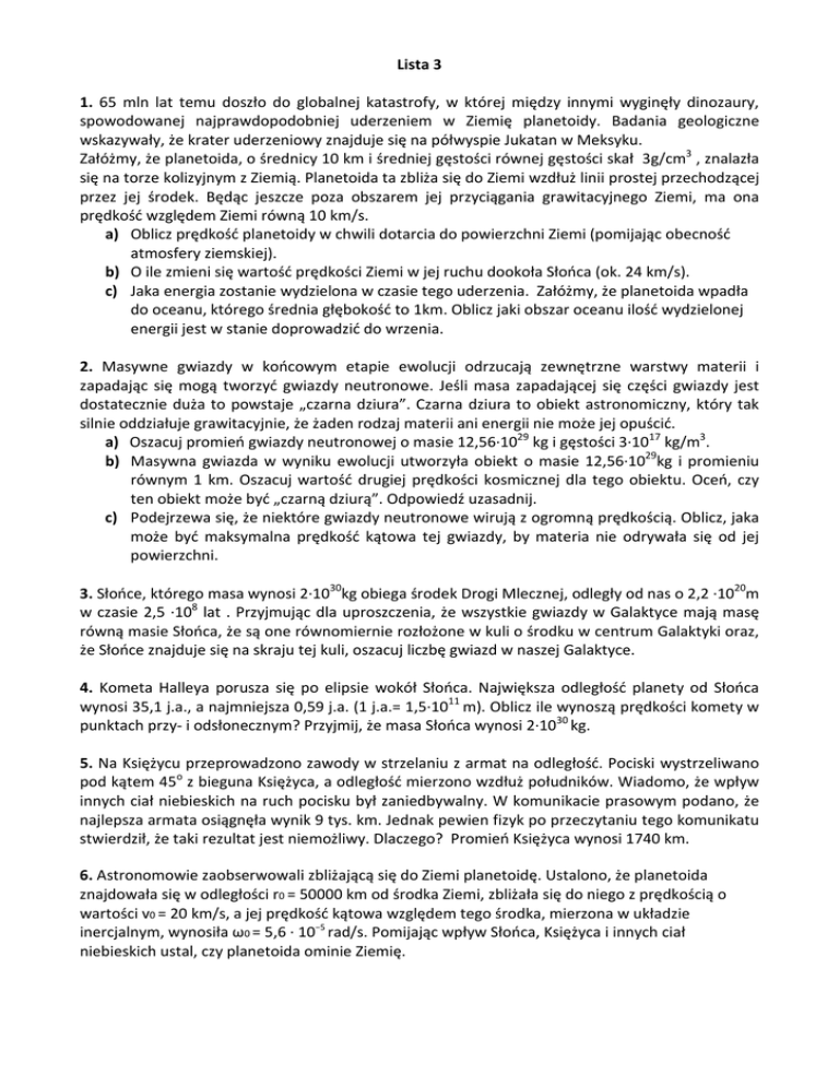 Lista 3 1. 65 mln lat temu doszło do globalnej katastrofy, w której między innymi wyginęły dinozaury, spowodowanej najprawdopodobniej uderzeniem w Ziemię planetoidy. Badania geologiczne wskazywały, że krater uderzeniowy znajduje się na półwyspie Jukatan w Meksyku. Załóżmy, że planetoida, o średnicy 10 km i średniej gęstości równej gęstości skał 3g/cm3 , znalazła się na torze kolizyjnym z Ziemią. Planetoida ta zbliża się do Ziemi wzdłuż linii prostej przechodzącej przez jej środek. Będąc jeszcze poza obszarem jej przyciągania grawitacyjnego Ziemi, ma ona prędkość względem Ziemi równą 10 km/s. a) Oblicz prędkość planetoidy w chwili dotarcia do powierzchni Ziemi (pomijając obecność atmosfery ziemskiej). b) O ile zmieni się wartość prędkości Ziemi w jej ruchu dookoła Słońca (ok. 24 km/s). c) Jaka energia zostanie wydzielona w czasie tego uderzenia. Załóżmy, że planetoida wpadła do oceanu, którego średnia głębokość to 1km. Oblicz jaki obszar oceanu ilość wydzielonej energii jest w stanie doprowadzić do wrzenia. 2. Masywne gwiazdy w końcowym etapie ewolucji odrzucają zewnętrzne warstwy materii i zapadając się mogą tworzyć gwiazdy neutronowe. Jeśli masa zapadającej się części gwiazdy jest dostatecznie duża to powstaje „czarna dziura”. Czarna dziura to obiekt astronomiczny, który tak silnie oddziałuje grawitacyjnie, że żaden rodzaj materii ani energii nie może jej opuścić. a) Oszacuj promień gwiazdy neutronowej o masie 12,56·1029 kg i gęstości 3·1017 kg/m3. b) Masywna gwiazda w wyniku ewolucji utworzyła obiekt o masie 12,56·1029kg i promieniu równym 1 km. Oszacuj wartość drugiej prędkości kosmicznej dla tego obiektu. Oceń, czy ten obiekt może być „czarną dziurą”. Odpowiedź uzasadnij. c) Podejrzewa się, że niektóre gwiazdy neutronowe wirują z ogromną prędkością. Oblicz, jaka może być maksymalna prędkość kątowa tej gwiazdy, by materia nie odrywała się od jej powierzchni. 3. Słońce, którego masa wynosi 2·1030kg obiega środek Drogi Mlecznej, odległy od nas o 2,2 ·1020m w czasie 2,5 ·108 lat . Przyjmując dla uproszczenia, że wszystkie gwiazdy w Galaktyce mają masę równą masie Słońca, że są one równomiernie rozłożone w kuli o środku w centrum Galaktyki oraz, że Słońce znajduje się na skraju tej kuli, oszacuj liczbę gwiazd w naszej Galaktyce. 4. Kometa Halleya porusza się po elipsie wokół Słońca. Największa odległość planety od Słońca wynosi 35,1 j.a., a najmniejsza 0,59 j.a. (1 j.a.= 1,5·1011 m). Oblicz ile wynoszą prędkości komety w punktach przy- i odsłonecznym? Przyjmij, że masa Słońca wynosi 2·1030 kg. 5. Na Księżycu przeprowadzono zawody w strzelaniu z armat na odległość. Pociski wystrzeliwano pod kątem 45o z bieguna Księżyca, a odległość mierzono wzdłuż południków. Wiadomo, że wpływ innych ciał niebieskich na ruch pocisku był zaniedbywalny. W komunikacie prasowym podano, że najlepsza armata osiągnęła wynik 9 tys. km. Jednak pewien fizyk po przeczytaniu tego komunikatu stwierdził, że taki rezultat jest niemożliwy. Dlaczego? Promień Księżyca wynosi 1740 km. 6. Astronomowie zaobserwowali zbliżającą się do Ziemi planetoidę. Ustalono, że planetoida znajdowała się w odległości r0 = 50000 km od środka Ziemi, zbliżała się do niego z prędkością o wartości v0 = 20 km/s, a jej prędkość kątowa względem tego środka, mierzona w układzie inercjalnym, wynosiła ω0 = 5,6 · 10−5 rad/s. Pomijając wpływ Słońca, Księżyca i innych ciał niebieskich ustal, czy planetoida ominie Ziemię.