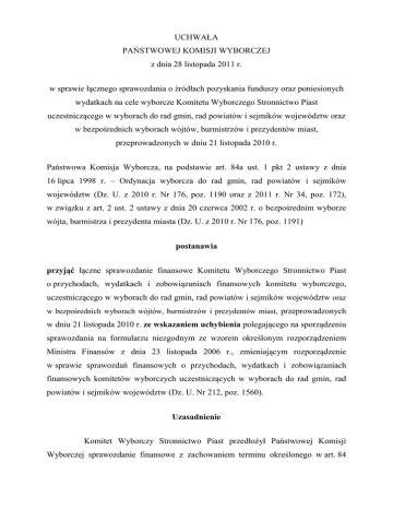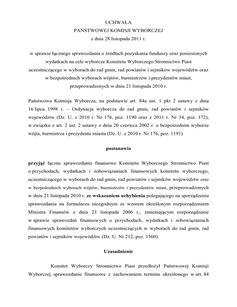 UCHWAŁA PAŃSTWOWEJ KOMISJI WYBORCZEJ z dnia 28 listopada 2011 r. w sprawie łącznego sprawozdania o źródłach pozyskania funduszy oraz poniesionych wydatkach na cele wyborcze Komitetu Wyborczego Stronnictwo Piast uczestniczącego w wyborach do rad gmin, rad powiatów i sejmików województw oraz w bezpośrednich wyborach wójtów, burmistrzów i prezydentów miast, przeprowadzonych w dniu 21 listopada 2010 r. Państwowa Komisja Wyborcza, na podstawie art. 84a ust. 1 pkt 2 ustawy z dnia 16 lipca 1998 r. – Ordynacja wyborcza do rad gmin, rad powiatów i sejmików województw (Dz. U. z 2010 r. Nr 176, poz. 1190 oraz z 2011 r. Nr 34, poz. 172), w związku z art. 2 ust. 2 ustawy z dnia 20 czerwca 2002 r. o bezpośrednim wyborze wójta, burmistrza i prezydenta miasta (Dz. U. z 2010 r. Nr 176, poz. 1191) postanawia przyjąć łączne sprawozdanie finansowe Komitetu Wyborczego Stronnictwo Piast o przychodach, wydatkach i zobowiązaniach finansowych komitetu wyborczego, uczestniczącego w wyborach do rad gmin, rad powiatów i sejmików województw oraz w bezpośrednich wyborach wójtów, burmistrzów i prezydentów miast, przeprowadzonych w dniu 21 listopada 2010 r. ze wskazaniem uchybienia polegającego na sporządzeniu sprawozdania na formularzu niezgodnym ze wzorem określonym rozporządzeniem Ministra Finansów z dnia 23 listopada 2006 r., zmieniającym rozporządzenie w sprawie sprawozdań finansowych o przychodach, wydatkach i zobowiązaniach finansowych komitetów wyborczych uczestniczących w wyborach do rad gmin, rad powiatów i sejmików województw (Dz. U. Nr 212, poz. 1560). Uzasadnienie Komitet Wyborczy Stronnictwo Piast przedłożył Państwowej Komisji Wyborczej sprawozdanie finansowe z zachowaniem terminu określonego w art. 84 2 ust. 2 Ordynacji wyborczej, przy czym sprawozdanie zostało sporządzone na formularzu niezgodnym ze wzorem określonym rozporządzeniem Ministra Finansów z dnia 23 listopada 2006 r., zmieniającym rozporządzenie w sprawie sprawozdań finansowych o przychodach, wydatkach i zobowiązaniach finansowych komitetów wyborczych uczestniczących w wyborach do rad gmin, rad powiatów i sejmików województw (Dz. U. Nr 212, poz. 1560). Zgodnie z art. 84a Ordynacji wyborczej uchybienie to nie stanowi przesłanki do odrzucenia sprawozdania. Wezwanie pełnomocnika finansowego Komitetu Wyborczego Stronnictwa Piast do usunięcia wad sprawozdania spowodowało nadesłanie sprawozdania sporządzonego na prawidłowym formularzu. Żaden z uprawnionych podmiotów określonych w art. 84b Ordynacji wyborczej nie zgłosił Państwowej Komisji Wyborczej zastrzeżeń do sprawozdania Komitetu. Komitet Wyborczy Stronnictwo Piast po uzyskaniu postanowienia potwierdzającego jego utworzenie zarejestrował 85 kandydatów na radnych sejmików województw, 161 kandydatów na radnych powiatów, 33 kandydatów na radnych miast na prawach powiatu, 367 kandydatów na radnych gmin oraz 17 kandydatów na wójtów, burmistrzów i prezydentów miast. Państwowa Komisja Wyborcza, na podstawie przedłożonych dokumentów stwierdziła, co następuje. W złożonym sprawozdaniu finansowym Komitet wykazał, że pozyskał środki w kwocie 28 745,72 zł. Pochodziły one z wpłat z Funduszu Wyborczego partii politycznej Stronnictwo Piast, dokonanych w terminach określonych w Ordynacji wyborczej. Środki finansowe Komitetu były gromadzone na rachunku bankowym nr 94 1240 2500 1111 0010 3555 8467, prowadzonym w Banku PKO SA IV O. w Lublinie. Wydatki Komitetu wyniosły 34 184,29 zł i były przeznaczone na cele związane z wyborami. Koszty kampanii wyborczej nie przekroczyły limitu obliczonego na podstawie art. 83e ust. 2 i 3 Ordynacji wyborczej oraz art. 24 ust. 5 ustawy o bezpośrednim wyborcze wójta, burmistrza i prezydenta miasta, wynoszącego 1 218 137,50 zł. 3 Pozyskiwanie i wydatkowanie środków finansowych przez Komitet odbywało się w terminach określonych w art. 83 ust. 2 i 4 Ordynacji. Komitet wykazał w sprawozdaniu zobowiązania w wysokości 5 978,53 zł, które zostały uregulowane z Funduszu Wyborczego Stronnictwa Piast. Państwowa Komisja Wyborcza, po zapoznaniu się ze sprawozdaniem finansowym Komitetu Wyborczego Stronnictwo Piast oraz załączonymi do niego dokumentami, postanowiła jak w sentencji. Od niniejszego postanowienia nie przysługuje środek prawny. Przewodniczący Państwowej Komisji Wyborczej: Stefan J. Jaworski Zastępcy Przewodniczącego Państwowej Komisji Wyborczej: Andrzej Kisielewicz, Stanisław Kosmal Członkowie Państwowej Komisji Wyborczej: Bogusław Dauter, Maria Grzelka, Janusz Niemcewicz, Włodzimierz Ryms, Stanisław Zabłocki