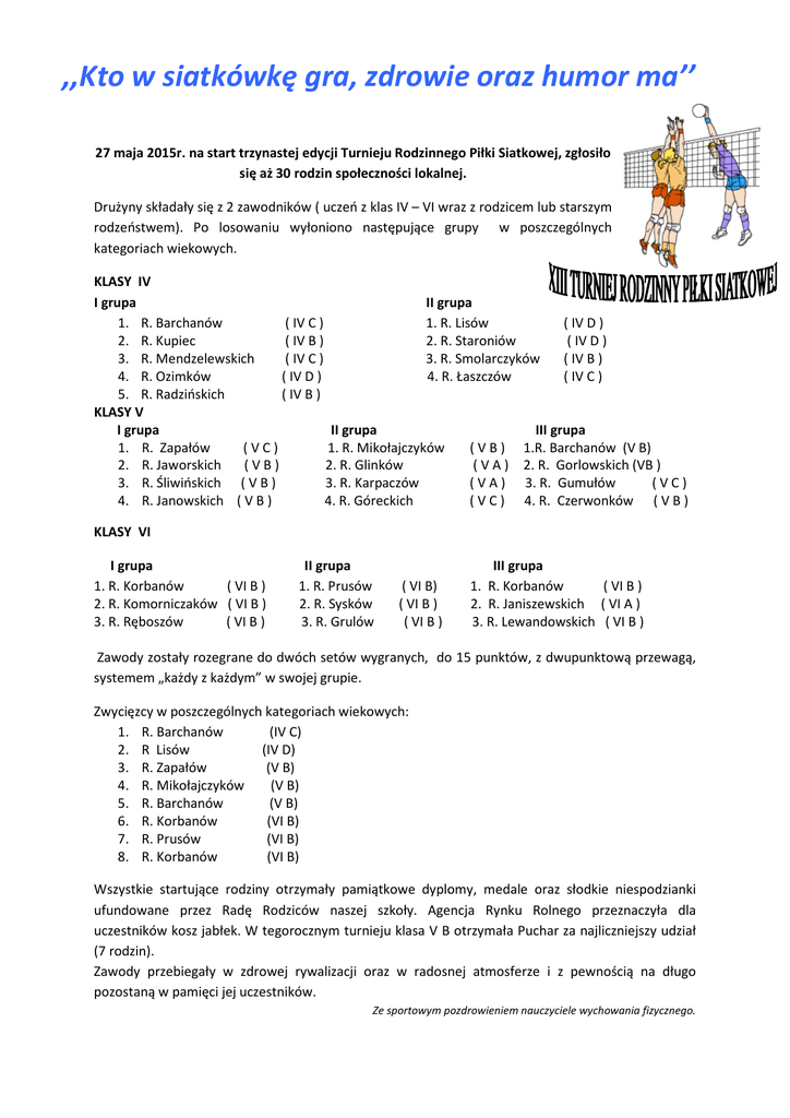 ,,Kto w siatkówkę gra, zdrowie oraz humor ma’’ 27 maja 2015r. na start trzynastej edycji Turnieju Rodzinnego Piłki Siatkowej, zgłosiło się aż 30 rodzin społeczności lokalnej. Drużyny składały się z 2 zawodników ( uczeń z klas IV – VI wraz z rodzicem lub starszym rodzeństwem). Po losowaniu wyłoniono następujące grupy w poszczególnych kategoriach wiekowych. KLASY IV I grupa II grupa 1. R. Barchanów ( IV C ) 1. R. Lisów ( IV D ) 2. R. Kupiec ( IV B ) 2. R. Staroniów ( IV D ) 3. R. Mendzelewskich ( IV C ) 3. R. Smolarczyków ( IV B ) 4. R. Ozimków ( IV D ) 4. R. Łaszczów ( IV C ) 5. R. Radzińskich ( IV B ) KLASY V I grupa II grupa III grupa 1. R. Zapałów (VC) 1. R. Mikołajczyków ( V B ) 1.R. Barchanów (V B) 2. R. Jaworskich (VB) 2. R. Glinków ( V A ) 2. R. Gorlowskich (VB ) 3. R. Śliwińskich ( V B ) 3. R. Karpaczów ( V A ) 3. R. Gumułów (VC) 4. R. Janowskich ( V B ) 4. R. Góreckich ( V C ) 4. R. Czerwonków ( V B ) KLASY VI I grupa 1. R. Korbanów ( VI B ) 2. R. Komorniczaków ( VI B ) 3. R. Ręboszów ( VI B ) II grupa 1. R. Prusów 2. R. Sysków 3. R. Grulów ( VI B) ( VI B ) ( VI B ) III grupa 1. R. Korbanów ( VI B ) 2. R. Janiszewskich ( VI A ) 3. R. Lewandowskich ( VI B ) Zawody zostały rozegrane do dwóch setów wygranych, do 15 punktów, z dwupunktową przewagą, systemem „każdy z każdym” w swojej grupie. Zwycięzcy w poszczególnych kategoriach wiekowych: 1. R. Barchanów (IV C) 2. R Lisów (IV D) 3. R. Zapałów (V B) 4. R. Mikołajczyków (V B) 5. R. Barchanów (V B) 6. R. Korbanów (VI B) 7. R. Prusów (VI B) 8. R. Korbanów (VI B) Wszystkie startujące rodziny otrzymały pamiątkowe dyplomy, medale oraz słodkie niespodzianki ufundowane przez Radę Rodziców naszej szkoły. Agencja Rynku Rolnego przeznaczyła dla uczestników kosz jabłek. W tegorocznym turnieju klasa V B otrzymała Puchar za najliczniejszy udział (7 rodzin). Zawody przebiegały w zdrowej rywalizacji oraz w radosnej atmosferze i z pewnością na długo pozostaną w pamięci jej uczestników. Ze sportowym pozdrowieniem nauczyciele wychowania fizycznego.