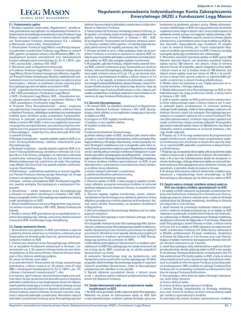 Załącznik nr 1 do Umowy Regulamin prowadzenia Indywidualnego Konta Zabezpieczenia Emerytalnego (IKZE) z Funduszami Legg Mason § 1. Postanowienia ogólne 1. Niniejszy regulamin, zwany dalej „Regulaminem”, określa zasady gromadzenia oszczędności na indywidualnych kontach zabezpieczenia emerytalnego prowadzonych przez Fundusze Legg Mason, którymi zarządza i w imieniu których działa Legg Mason Towarzystwo Funduszy Inwestycyjnych S.A. z siedzibą w Warszawie, zwane dalej „Towarzystwem”. 2. Towarzystwo i Fundusze Legg Mason umożliwiają nabywanie jednostek uczestnictwa Funduszy Legg Mason w ramach IKZE, zgodnie z przepisami ustawy z dnia 20 kwietnia 2004 r. o indywidualnych kontach emerytalnych oraz indywidualnych kontach zabezpieczenia emerytalnego (j.t. Dz. U. z 2014 r., poz. 1147), zwanej dalej „Ustawą o IKE i IKZE”. 3. Wyrażenia użyte w Regulaminie oznaczają: a) Fundusze, Fundusze Legg Mason – fundusze inwestycyjne Legg Mason Senior Fundusz Inwestycyjny Otwarty, Legg Mason Parasol Fundusz Inwestycyjny Otwarty z wydzielonymi subfunduszami oraz inne fundusze inwestycyjne zarządzane przez Towarzystwo, z którymi na podstawie umowy zawartej przez Oszczędzającego jest lub będzie prowadzone IKZE, b) IKE - indywidualne konto emerytalne w rozumieniu Ustawy o IKE i IKZE prowadzone z Funduszami Legg Mason, c) IKZE z Funduszami Legg Mason, IKZE – indywidualne konto zabezpieczenia emerytalnego w rozumieniu Ustawy o IKE i IKZE, prowadzone z Funduszami Legg Mason, d) Grupowe Plany Oszczędnościowe – plany i programy oszczędnościowe, inwestycyjne i emerytalne, o których mowa w Statutach Funduszy, zakładające systematyczne inwestowanie środków przez określone grupy uczestników Funduszy/Subfunduszy w jednostki uczestnictwa Funduszy/Subfunduszy (także w ramach IKE i IKZE), w tym w szczególności pracownicze programy oszczędnościowe, pracownicze programy emerytalne oraz inne grupowe formy inwestowania i oszczędzania, e) Oszczędzający – osoba fizyczna, która ukończyła 16 lat i która zawarła Umowę, f) Strategia indywidualna – sposób podziału wpłat do IKZE w ramach Funduszy/Subfunduszy, ustalany indywidualnie przez Oszczędzającego, g) Strategia modelowa – sposób podziału wpłat do IKZE w ramach Funduszy/Subfunduszy określony w Umowie lub w Załączniku nr 3 do Umowy, polegający na nabywaniu jednostek uczestnictwa wskazanego Funduszu/y lub Subfunduszu/y (Model podstawowy) lub uzależniony od wieku Oszczędzającego (Model Cykl Życia) lub inny sposób podziału zaoferowany przez Towarzystwo, h) Subfundusze – subfundusze wydzielone w ramach Legg Mason Parasol Funduszu Inwestycyjnego Otwartego lub innego funduszu zarządzanego przez Towarzystwo, i) Umowa – umowa o prowadzenie IKZE z Funduszami Legg Mason zawarta pomiędzy Oszczędzającym a wskazanymi Funduszami, j) Uprawniony – osoba wskazana przez Oszczędzającego w Umowie na zasadach określonych w Ustawie o IKE i IKZE, której w przypadku śmierci Oszczędzającego wypłacone zostaną środki zgromadzone na IKZE. 4. Słowa niezdefiniowane inaczej w Regulaminie mają znaczenie nadane im przez Ustawę o IKE i IKZE, Statuty Funduszy lub Umowę. 5. Środki w ramach IKZE gromadzone są na wyodrębnionym rejestrze Oszczędzającego, którego oznaczenie stanowi zarazem oznaczenie IKZE umożliwiające jego identyfikację. § 2. Zasady zawierania Umowy 1. Gromadzenie oszczędności na IKZE jest możliwe w oparciu o pisemną Umowę zawieraną na formularzu ustalonym przez Towarzystwo na wniosek osoby fizycznej, uprawnionej do gromadzenia środków na IKZE. 2. Umowa jest zawierana przez Oszczędzającego jednocześnie ze wszystkimi Funduszami wskazanymi w Umowie, z zastrzeżeniem ust. 5. Do zawarcia Umowy konieczne jest złożenie podpisów za obie strony Umowy. Zawarcie Umowy następuje w dniu złożenia ostatniego podpisu. Do zawarcia Umowy może dojść: a) za pośrednictwem Towarzystwa lub innego uprawnionego dystrybutora, o którym mowa w art. 32 ustawy z dnia 27 maja 2004 r. o funduszach inwestycyjnych (j.t. Dz. U. z 2014 r., poz. 157, „Ustawa o funduszach inwestycyjnych”), albo b) w sytuacji, gdy Fundusze reprezentowane będą przez podmiot, który nie jest uprawniony do pośredniczenia w zbywaniu jednostek uczestnictwa, w tym przyjmowania zleceń ich nabycia. Jeżeli podmiot zawierający w imieniu Funduszy Umowę nie jest uprawniony do pośredniczenia w zbywaniu jednostek uczestnictwa Funduszy, zawarcie Umowy nie stanowi czynności związanej z nabyciem jednostek uczestnictwa. Warunkiem nabycia jednostek uczestnictwa Funduszy przez Oszczędzającego jest złożenie zlecenia nabycia jednostek uczestnictwa w trybie określonym w Statutach Funduszy. 3. Towarzystwo lub Fundusze odmawiają zawarcia Umowy, jeśli zgodnie z ich wiedzą osoba wnioskująca o jej podpisanie nie spełnia wymogów, określonych w Ustawie o IKE i IKZE. W szczególności Towarzystwo lub Fundusze odmówią zawarcia Umowy z osobami, które zgodnie z ich wiedzą dokonały wypłaty jednorazowej lub wypłaty pierwszej raty z IKZE. 4. Umowa wchodzi w życie, a Oszczędzający staje się Uczestnikiem Funduszy w momencie zapisania w rejestrze IKZE nabytych przez Uczestnika jednostek uczestnictwa za kwotę pierwszej wpłaty na IKZE albo przyjętej wypłaty transferowej. 5. W przypadku, gdy lista Funduszy, z którymi można zawrzeć Umowę IKZE, zostanie rozszerzona przez Towarzystwo po zawarciu Umowy, wówczas Oszczędzający, składając zlecenie zmiany alokacji wpłat, o którym mowa w § 3 ust. 1 lit. g, lub zlecenie zmiany struktury zgromadzonych środków, o którym mowa w w § 3 ust. 1 lit. h, w ten sposób, że dotyczy ona jednostek uczestnictwa nowego Funduszu/Subfunduszu zawiera Umowę z nowym Funduszem/Subfunduszem w dniu złożenia tego zlecenia i staje się uczestnikiem tego Funduszu/Subfunduszu w dniu nabycia jednostek uczestnictwa, co skutkuje wejściem w życie Umowy w odniesieniu do tego Funduszu/Subfu