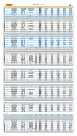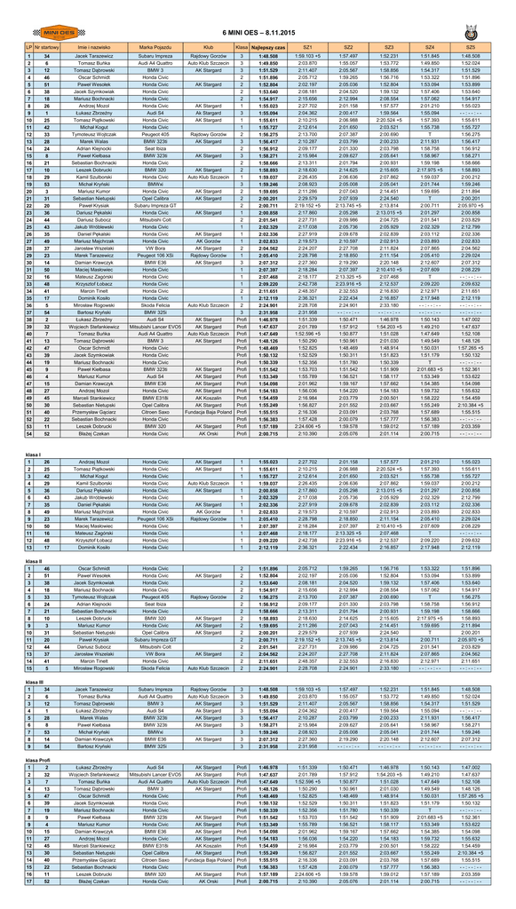 6 MINI OES – 8.11.2015 LP Nr startowy Imie i nazwisko Marka Pojazdu 1 2 3 4 5 6 7 8 9 10 11 12 13 14 15 16 17 18 19 20 21 22 23 24 25 26 27 28 29 30 31 32 33 34 35 36 37 38 39 40 41 42 43 44 45 46 47 48 49 50 51 52 53 34 6 12 46 51 38 18 26 1 25 42 33 28 24 8 21 10 29 53 3 31 20 36 44 43 35 49 37 23 14 50 16 48 41 17 5 54 2 32 7 13 47 39 19 9 4 15 27 45 30 40 22 11 Jacek Tarazewicz Tomasz Buńka Tomasz Dąbrowski Oscar Schmidt Paweł Wesołek Jacek Szymkowiak Mariusz Bochnacki Andrzej Mozol Łukasz Zbrzeźny Tomasz Piątkowski Michał Kogut Tymoteusz Wojtczak Marek Walas Adrian Klejnocki Paweł Kiełbasa Sebastian Bochnacki Leszek Dobrucki Kamil Szulborski Michał Kryński Mariusz Kumor Sebastian Nietupski Paweł Krysiak Dariusz Pękalski Dariusz Subocz Jakub Wróblewski Daniel Pękalski Mariusz Majchrzak Jarosław Wszelaki Marek Tarazewicz Damian Krawczyk Maciej Masłowiec Mateusz Zagórski Krzysztof Łobacz Marcin Tinelt Dominik Kosiło Mirosław Rogowski Bartosz Kryński Łukasz Zbrzeźny Wojciech Stefankiewicz Tomasz Buńka Tomasz Dąbrowski Oscar Schmidt Jacek Szymkowiak Mariusz Bochnacki Paweł Kiełbasa Mariusz Kumor Damian Krawczyk Andrzej Mozol Marceli Stankiewicz Sebastian Nietupski Przemysław Gąciarz Sebastian Bochnacki Leszek Dobrucki 54 52 Błażej Czekan Honda Civic 26 25 42 29 36 43 35 49 23 50 16 48 17 Andrzej Mozol Tomasz Piątkowski Michał Kogut Kamil Szulborski Dariusz Pękalski Jakub Wróblewski Daniel Pękalski Mariusz Majchrzak Marek Tarazewicz Maciej Masłowiec Mateusz Zagórski Krzysztof Łobacz Dominik Kosiło Honda Civic Honda Civic Honda Civic Honda Civic Honda Civic Honda Civic Honda Civic Honda Civic Peugeot 106 XSi Honda Civic Honda Civic Honda Civic Honda Civic 46 51 38 18 33 24 21 10 3 31 20 44 37 41 5 Oscar Schmidt Paweł Wesołek Jacek Szymkowiak Mariusz Bochnacki Tymoteusz Wojtczak Adrian Klejnocki Sebastian Bochnacki Leszek Dobrucki Mariusz Kumor Sebastian Nietupski Paweł Krysiak Dariusz Subocz Jarosław Wszelaki Marcin Tinelt Mirosław Rogowski Honda Civic Honda Civic Honda Civic Honda Civic Peugeot 405 Seat Ibiza Honda Civic BMW 320 Honda Civic Opel Calibra Subaru Impreza GT Mitsubishi Colt VW Bora Honda Civic Skoda Felicia 34 6 12 1 28 8 53 14 54 Jacek Tarazewicz Tomasz Buńka Tomasz Dąbrowski Łukasz Zbrzeźny Marek Walas Paweł Kiełbasa Michał Kryński Damian Krawczyk Bartosz Kryński Subaru Impreza Audi A4 Quattro BMW 3 Audi S4 BMW 323ti BMW 323ti BMWxi BMW E36 BMW 325i Klub Subaru Impreza Rajdowy Gorzów Audi A4 Quattro Auto Klub Szczecin BMW 3 AK Stargard Honda Civic Honda Civic AK Stargard Honda Civic Honda Civic Honda Civic AK Stargard Audi S4 Ak Stargard Honda Civic AK Stargard Honda Civic Peugeot 405 Rajdowy Gorzów BMW 323ti AK Stargard Seat Ibiza BMW 323ti AK Stargard Honda Civic BMW 320 AK Stargard Honda Civic Auto Klub Szczecin BMWxi Honda Civic AK Stargard Opel Calibra AK Stargard Subaru Impreza GT Honda Civic AK Stargard Mitsubishi Colt Honda Civic Honda Civic AK Stargard Honda Civic AK Gorzów VW Bora AK Stargard Peugeot 106 XSi Rajdowy Gorzów BMW E36 AK Stargard Honda Civic Honda Civic Honda Civic Honda Civic Honda Civic Skoda Felicia Auto Klub Szczecin BMW 325i Audi S4 AK Stargard Mitsubishi Lancer EVO5 AK Stargard Audi A4 Quattro Auto Klub Szczecin BMW 3 AK Stargard Honda Civic Honda Civic Honda Civic BMW 323ti AK Stargard Audi S4 AK Stargard BMW E36 AK Stargard Honda Civic AK Stargard BMW E318i AK Koszalin Opel Calibra AK Stargard Citroen Saxo Fundacja Baja Poland Honda Civic BMW 320 AK Stargard Klasa Najlepszy czas SZ1 SZ2 SZ3 SZ4 SZ5 3 3 3 2 2 2 2 1 3 1 1 2 3 2 3 2 2 1 3 2 2 2 1 2 1 1 1 2 1 3 1 1 1 2 1 2 3 Profi Profi Profi Profi Profi Profi Profi Profi Profi Profi Profi Profi Profi Profi Profi Profi 1:48.508 1:49.850 1:51.529 1:51.896 1:52.804 1:53.640 1:54.917 1:55.023 1:55.094 1:55.611 1:55.727 1:56.275 1:56.417 1:56.912 1:58.271 1:58.666 1:58.893 1:59.037 1:59.246 1:59.695 2:00.201 2:00.711 2:00.858 2:01.541 2:02.329 2:02.336 2:02.833 2:04.562 2:05.410 2:07.312 2:07.397 2:07.468 2:09.220 2:11.651 2:12.119 2:24.901 2:31.958 1:46.978 1:47.637 1:47.649 1:48.126 1:48.469 1:50.132 1:50.339 1:51.542 1:53.349 1:54.098 1:54.183 1:54.459 1:55.249 1:55.515 1:56.383 1:57.189 1:59.103 +5 2:03.870 2:11.407 2:05.712 2:02.197 2:08.181 2:15.656 2:27.702 2:04.362 2:10.215 2:12.614 2:13.700 2:10.287 2:09.177 2:15.984 2:13.311 2:18.630 2:26.435 2:08.923 2:11.286 2:29.579 2:19.152 +5 2:17.860 2:27.731 2:17.038 2:27.919 2:19.573 2:24.207 2:28.798 2:27.360 2:18.284 2:18.177 2:42.738 2:48.357 2:36.321 2:28.708 2:31.958 1:51.339 2:01.789 1:52.596 +5 1:50.290 1:52.825 1:52.529 1:52.356 1:53.703 1:55.789 2:01.962 1:56.036 2:16.984 1:56.827 2:16.336 1:57.428 2:24.606 +5 1:57.497 1:55.057 2:05.567 1:59.265 2:05.036 2:04.520 2:12.994 2:01.158 2:00.417 2:06.988 2:01.650 2:07.387 2:03.799 2:01.330 2:09.627 2:01.794 2:14.625 2:06.636 2:05.008 2:07.043 2:07.939 2:13.745 +5 2:05.298 2:09.986 2:05.736 2:09.678 2:10.597 2:27.708 2:18.850 2:19.290 2:07.397 2:13.325 +5 2:23.916 +5 2:32.553 2:22.434 2:24.901 --:--:-1:50.471 1:57.912 1:50.877 1:50.961 1:48.469 1:50.311 1:51.780 1:51.542 1:56.521 1:59.167 1:54.220 2:03.779 2:01.552 2:03.091 2:00.079 1:59.578 1:52.231 1:53.772 1:58.856 1:56.716 1:52.804 1:59.132 2:08.554 1:57.577 1:59.564 2:20.524 +5 2:03.521 2:00.690 2:00.233 2:03.798 2:05.641 2:00.931 2:15.605 2:07.862 2:05.041 2:14.451 2:24.540 2:13.814 2:13.015 +5 2:04.725 2:05.929 2:02.839 2:02.913 2:11.824 2:11.154 2:20.148 2:10.410 +5 2:07.468 2:12.537 2:16.830 2:16.857 2:33.180 --:--:-1:46.978 1:54.203 +5 1:51.028 2:01.030 1:48.914 1:51.823 1:50.339 1:51.909 1:58.117 1:57.662 1:54.183 2:00.501 2:03.667 2:03.768 1:57.777 1:59.012 1:51.845 1:49.850 1:54.317 1:53.322 1:53.094 1:57.406 1:57.062 2:01.210 1:55.094 1:57.393 1:55.738 T 2:11.931 1:58.758 1:58.967 1:59.198 2:17.975 +5 1:59.037 2:01.744 1:59.695 T 2:00.711 2:01.297 2:01.541 2:02.329 2:03.112 2:03.893 2:07.865 2:05.410 2:12.607 2:07.609 T 2:09.220 2:12.971 2:17.948 --:--:---:--:-1:50.143 1:49