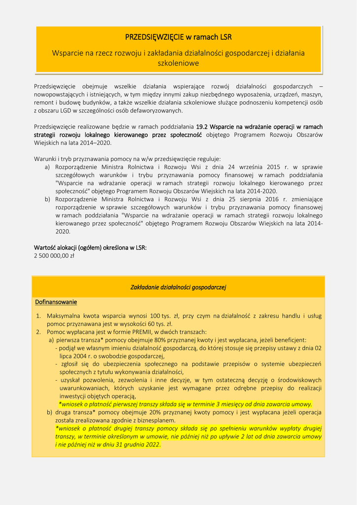 PRZEDSIĘWZIĘCIE w ramach LSR Wsparcie na rzecz rozwoju i zakładania działalności gospodarczej i działania szkoleniowe Przedsięwzięcie obejmuje wszelkie działania wspierające rozwój działalności gospodarczych – nowopowstających i istniejących, w tym między innymi zakup niezbędnego wyposażenia, urządzeń, maszyn, remont i budowę budynków, a także wszelkie działania szkoleniowe służące podnoszeniu kompetencji osób z obszaru LGD w szczególności osób defaworyzowanych. Przedsięwzięcie realizowane będzie w ramach poddziałania 19.2 Wsparcie na wdrażanie operacji w ramach strategii rozwoju lokalnego kierowanego przez społeczność objętego Programem Rozwoju Obszarów Wiejskich na lata 2014–2020. Warunki i tryb przyznawania pomocy na w/w przedsięwzięcie reguluje: a) Rozporządzenie Ministra Rolnictwa i Rozwoju Wsi z dnia 24 września 2015 r. w sprawie szczegółowych warunków i trybu przyznawania pomocy finansowej w ramach poddziałania "Wsparcie na wdrażanie operacji w ramach strategii rozwoju lokalnego kierowanego przez społeczność" objętego Programem Rozwoju Obszarów Wiejskich na lata 2014-2020. b) Rozporządzenie Ministra Rolnictwa i Rozwoju Wsi z dnia 25 sierpnia 2016 r. zmieniające rozporządzenie w sprawie szczegółowych warunków i trybu przyznawania pomocy finansowej w ramach poddziałania "Wsparcie na wdrażanie operacji w ramach strategii rozwoju lokalnego kierowanego przez społeczność" objętego Programem Rozwoju Obszarów Wiejskich na lata 20142020. Wartość alokacji (ogółem) określona w LSR: 2 500 000,00 zł Zakładanie działalności gospodarczej Dofinansowanie 1. Maksymalna kwota wsparcia wynosi 100 tys. zł, przy czym na działalność z zakresu handlu i usług pomoc przyznawana jest w wysokości 60 tys. zł. 2. Pomoc wypłacana jest w formie PREMII, w dwóch transzach: a) pierwsza transza* pomocy obejmuje 80% przyznanej kwoty i jest wypłacana, jeżeli beneficjent: - podjął we własnym imieniu działalność gospodarczą, do której stosuje się przepisy ustawy z dnia 02 lipca 2004 r. o swobodzie gospodarczej, - zgłosił się do ubezpieczenia społecznego na podstawie przepisów o systemie ubezpieczeń społecznych z tytułu wykonywania działalności, - uzyskał pozwolenia, zezwolenia i inne decyzje, w tym ostateczną decyzję o środowiskowych uwarunkowaniach, których uzyskanie jest wymagane przez odrębne przepisy do realizacji inwestycji objętych operacją, *wniosek o płatność pierwszej transzy składa się w terminie 3 miesięcy od dnia zawarcia umowy. b) druga transza* pomocy obejmuje 20% przyznanej kwoty pomocy i jest wypłacana jeżeli operacja została zrealizowana zgodnie z biznesplanem. *wniosek o płatność drugiej transzy pomocy składa się po spełnieniu warunków wypłaty drugiej transzy, w terminie określonym w umowie, nie później niż po upływie 2 lat od dnia zawarcia umowy i nie później niż w dniu 31 grudnia 2022. Kto może skorzystać z pomocy Osoba fizyczna, jeżeli: - jest obywatelem państwa członkowskiego Unii Europejskiej, - jest pełnoletnia, - ma miejsce zamieszkania na obszarze wiejskim objętym LSR, - nie podlega ubezpieczeniu społecznemu rolników z mocy ustawy i w pełnym zakresie, chyba że podejmuje działalność gospodarczą sklasyfikowaną w Polskiej Klasyfikacji Działalności jako produkcja artykułów spożywczych lub produkcja napojów, - w okresie 2 lat poprzedzających dzień złożenia wniosku o przyznanie tej pomocy nie wykonywała działalności gospodarczej, do której stosuje się przepisy ustawy z dnia 2 lipca 2014 r. o swobodzie działalności gospodarczej, w szczególności nie był wpisany do Centralnej Ewidencji i Informacji o Działalności Gospodarczej, - nie została jej dotychczas przyznana pomoc na operację w tym zakresie. Warunki przyznania pomocy Pomoc jest przyznawana podmiotowi, któremu został nadany numer identyfikacyjny (w systemie Agencji Restrukturyzacji i Modernizacji Rolnictwa), jeżeli: 1. koszty kwalifikowalne operacji nie są współfinansowane z innych środków publicznych, 2. operacja, będzie realizowana nie więcej niż w 2 etapach, a wykonanie zakresu rzeczowego zgodnie z zestawieniem rzeczowo-finansowy operacji, w tym poniesienie przez beneficjenta kosztów kwalifikowanych oraz złożenie wniosku o płatność końcową wypłacaną po zrealizowaniu całej operacji nastąpi w terminie 2 lat od dnia zawarcia umowy (jednak nie później niż do 31 grudnia 2022 r.), 3. operacja, która obejmuje koszty inwestycyjne, zakłada realizację inwestycji na obszarze wiejskim objętym LSR, 4. inwestycje w ramach operacji będą realizowane na nieruchomości będącej własnością lub współwłasnością podmiotu ubiegającego się o przyznanie pomocy lub podmiot ten posiada prawo do dysponowania nieruchomością na cele określone we wniosku o przyznanie pomocy co najmniej przez okres realizacji operacji oraz okres podlegania zobowiązaniu do zapewnienia trwałości operacji, 5. operacja jest uzasadniona ekonomicznie i będzie realizowana zgodnie z biznesplanem, 6. podmiot wykaże, że: - posiada doświadczenie w realizacji projektów o charakterze podobnym do operacji, którą zamierza realizować, lub - posiada zasoby odpowiednie do przedmiotu operacji, którą zamierza realizować, lub - posiada kwalifikacje odpowiednie do przedmiotu operacji, którą zamierza realizować, 7. realizacja operacji nie jest możliwa bez udziału środków publicznych, 8. została wydana ostateczna decyzja o środowiskowych uwarunkowaniach, jeżeli jej wydanie jest wymagane przepisami odrębnymi. Pomoc jest przyznawana jeżeli: 1. operacja zakłada podjęcie we własnym imieniu działalności gospodarczej i jej wykonywanie do dnia, w którym upłynie 2 lata od dnia wypłaty płatności końcowej oraz: a) zgłoszenie podmiotu ubiegającego się o przyznanie pomocy do ubezpieczenia emerytalnego, ubezpieczeń rentowych i ubezpieczenia wypadkowego na podstaw