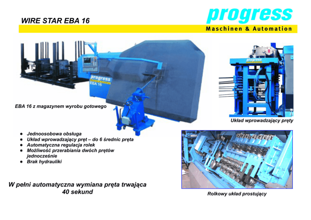 WIRE STAR EBA 16 EBA 16 z magazynem wyrobu gotowego Układ wprowadzający pręty Jednoosobowa obsługa Układ wprowadzający pręt – do 6 średnic pręta Automatyczna regulacja rolek Możliwość przerabiania dwóch prętów jednocześnie Brak hydrauliki W pełni automatyczna wymiana pręta trwająca 40 sekund Rolkowy układ prostujący