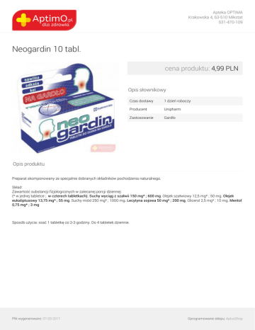 Apteka OPTIMA Krakowska 4, 63-510 Mikstat 531-470-109 Neogardin 10 tabl. cena produktu: 4,99 PLN Opis słownikowy Czas dostawy 1 dzień roboczy Producent Unipharm Zastosowanie Gardło Opis produktu Preparat skomponowany ze specjalnie dobranych składników pochodzenia naturalnego. Skład: Zawartość substancji fizjologicznych w zalecanej porcji dziennej: (* w jednej tabletce ; w czterech tabletkach). Suchy wyciąg z szałwii 150 mg* ; 600 mg. Olejek szałwiowy 12,5 mg* ; 50 mg. Olejek eukaliptusowy 13,75 mg* ; 55 mg. Suchy miód 250 mg* ; 1000 mg. Lecytyna sojowa 50 mg* ; 200 mg. Glicerol 2,5 mg* ; 10 mg. Mentol 0,75 mg* ; 3 mg Sposób użycia: ssać 1 tabletkę co 2-3 godziny. Do 4 tabletek dziennie. Plik wygenerowano: 07-03-2017 Powered by TCPDF (www.tcpdf.org) Oprogramowanie sklepu: AptusShop