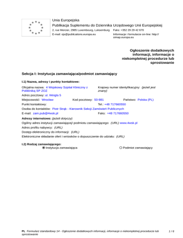 Unia Europejska Publikacja Suplementu do Dziennika Urzędowego Unii Europejskiej 2, rue Mercier, 2985 Luxembourg, Luksemburg Faks: +352 29 29 42 670 E-mail: [email protected] Informacje i formularze on-line: http:// simap.europa.eu Ogłoszenie dodatkowych informacji, informacje o niekompletnej procedurze lub sprostowanie Sekcja I: Instytucja zamawiająca/podmiot zamawiający I.1) Nazwa, adresy i punkty kontaktowe: Oficjalna nazwa: 4 Wojskowy Szpital Kliniczny z Polikliniką SP ZOZ Krajowy numer identyfikacyjny: (jeżeli jest znany) _____ Adres pocztowy: ul. Weigla 5 Miejscowość: Wrocław Kod pocztowy: 50-981 Punkt kontaktowy: _____ Państwo: Polska (PL) Tel.: +48 717660550 Osoba do kontaktów: Piotr Strąk - Kierownik Sekcji Zamówień Publicznych E-mail: [email protected] Faks: +48 717660550 Adresy internetowe: (jeżeli dotyczy) Ogólny adres instytucji zamawiającej/ podmiotu zamawiającego: (URL) www.4wsk.pl Adres profilu nabywcy: (URL) _____ Dostęp elektroniczny do informacji: (URL) _____ Elektroniczne składanie ofert i wniosków o dopuszczenie do udziału: (URL) _____ I.2) Rodzaj zamawiającego: Instytucja zamawiająca Podmiot zamawiający PL Formularz standardowy 14 - Ogłoszenie dodatkowych informacji, informacje o niekompletnej procedurze lub sprostowanie 1/6 Sekcja II: Przedmiot zamówienia II.1.1) Nazwa nadana zamówieniu: Pełnienie funkcji Inżyniera Kontraktu dla inwestycji budowlanej pn.: ,, Rozbudowa budynku Nr 1 na potrzeby Zintegrowanego Bloku Operacyjnego w 4 Wojskowym Szpitalu Klinicznym z Polikliniką SP ZOZ we Wrocławiu K-2857” II.1.2) Krótki opis zamówienia lub zakupu: (podano w pierwotnym ogłoszeniu) 1. Przedmiot zamówienia obejmuje: 1) Przedmiotem niniejszego zamówienia jest pełnienie funkcji Inżyniera Kontraktu polegającej na zarządzaniu Kontraktem na roboty budowlane Inwestycji pn. „Rozbudowa budynku Nr 1 na potrzeby Zintegrowanego Bloku Operacyjnego w 4 Wojskowym Szpitalu Klinicznym z Polikliniką SP ZOZ we Wrocławiu K-2857” oraz nadzorem, koordynacją i logistyką dostaw i montażu wyposażenia w sprzęt meblowo-gospodarczy, sanitarny, AGD i RTV oraz w sprzęt i aparaturę medyczną prowadzoną według Warunków Kontraktowych FIDIC, Kontrakt na Budowę dla Robót Budowlanych i Inżynieryjnych Projektowanych przez Zamawiającego (pierwsze wydanie w języku angielskim 1999, przygotowane i opublikowane przez Międzynarodową Federację Inżynierów Konsultantów (Fédération Internationale des Ingénieurs-Conseils - FIDIC), P.O. Box 86, CH-1000 Lausanne 12, Szwajcaria, wydanie czwarte angielsko – polskie z 2008 r.). 2) Analiza możliwości pozyskania dofinansowania z różnych źródeł oraz przygotowanie wniosku wraz z załącznikami i niezbędnymi dokumentami o dofinansowanie inwestycji z środków Unii Europejskiej lub innych źródeł a w przypadku przyznania dofinansowania prowadzenie i rozliczanie Inwestycji zgodnie z wytycznymi i wymaganiami Instytucji Finansującej oraz umową o dofinansowanie. 3) Przygotowaniu w uzgodnieniu z Zamawiającym niezbędnej dokumentacji oraz przeprowadzenie (po zaakceptowaniu przez Zamawiającego warunków SIWZ), w jego imieniu postępowań o zamówienia publiczne na wyłonienie wykonawców dostaw, montażu wyposażenia oraz aparatury medycznej, oraz skorelowanie przetargów i dostaw z etapami budowy i możliwościami montażu w trakcie realizacji Kontraktu na roboty budowlane i po jego zakończeniu. 4) Rozliczenie inwestycji oraz dostaw wyposażenia i aparatury medycznej zgodnie z umowami o udzielenie dotacji celowych z Ministerstwa Obrony Narodowej (umowa zostanie przekazana po podpisaniu umowy z IK) oraz zgodnie z innymi umowami w przypadku otrzymania dofinansowania/finansowania z różnych źródeł w tym m.inn. że środków Unii Europejskiej, Banku etc. 5) Ocena merytoryczna ofert w Przetargu na wyłonienie wykonawcy robót budowlanych, w zakresie wskazanym przez Zamawiającego (jako biegły w myśl art. 21 ust. 4 pzp) inwestycji Budowy Zintegrowanych Bloków Operacyjnych w oparciu o warunki kontraktowe FIDIC. II.1.3) Wspólny Słownik Zamówień (CPV) Główny przedmiot Dodatkowe przedmioty Słownik główny 71540000 71541000 Słownik uzupełniający (jeżeli dotyczy) PL Formularz standardowy 14 - Ogłoszenie dodatkowych informacji, informacje o niekompletnej procedurze lub sprostowanie 2/6 Sekcja IV: Procedura IV.1)Rodzaj procedury (podano w pierwotnym ogłoszeniu) Otwarta Ograniczona Ograniczona przyspieszona Negocjacyjna Negocjacyjna przyspieszona Dialog konkurencyjny Negocjacyjna z uprzednim ogłoszeniem Negocjacyjna bez uprzedniego ogłoszenia Negocjacyjna z publikacją ogłoszenia o zamówieniu Negocjacyjna bez publikacji ogłoszenia o zamówieniu Udzielenie zamówienia bez uprzedniej publikacji ogłoszenia o zamówieniu w Dzienniku Urzędowym Unii Europejskiej IV.2)Informacje administracyjne IV.2.1)Numer referencyjny: (podano w pierwotnym ogłoszeniu) 66/Log./2013 IV.2.2)Dane referencyjne ogłoszenia w przypadku ogłoszeń przesłanych drogą elektroniczną: Pierwotne ogłoszenie przesłane przez eNotices TED eSender Login: ENOTICES_4wsk Dane referencyjne ogłoszenia: 2013-074750 rok i numer dokumentu IV.2.3)Ogłoszenie, którego dotyczy niniejsza publikacja: Numer ogłoszenia w Dz.U.: 2013/S 109-186542 z dnia: 07/06/2013 (dd/mm/rrrr) IV.2.4)Data wysłania pierwotnego ogłoszenia: 04/06/2013 (dd/mm/rrrr) PL Formularz standardowy 14 - Ogłoszenie dodatkowych informacji, informacje o niekompletnej procedurze lub sprostowanie 3/6 Sekcja VI: Informacje uzupełniające VI.1) Ogłoszenie dotyczy: Procedury niepełnej Sprostowania Informacji dodatkowych VI.2) Informacje na temat niepełnej procedury udzielenia zamówienia: Postępowanie o udzielenie zamówienia zostało przerwane Postępowanie o udzielenie zamówienia uznano za nieskuteczne Zamówienia nie udzielono Zamówienie może być przedmiotem ponownej publikacji VI.3) Informacje do poprawienia lub dodania : VI.3.1) Zmiana oryginalnej info
