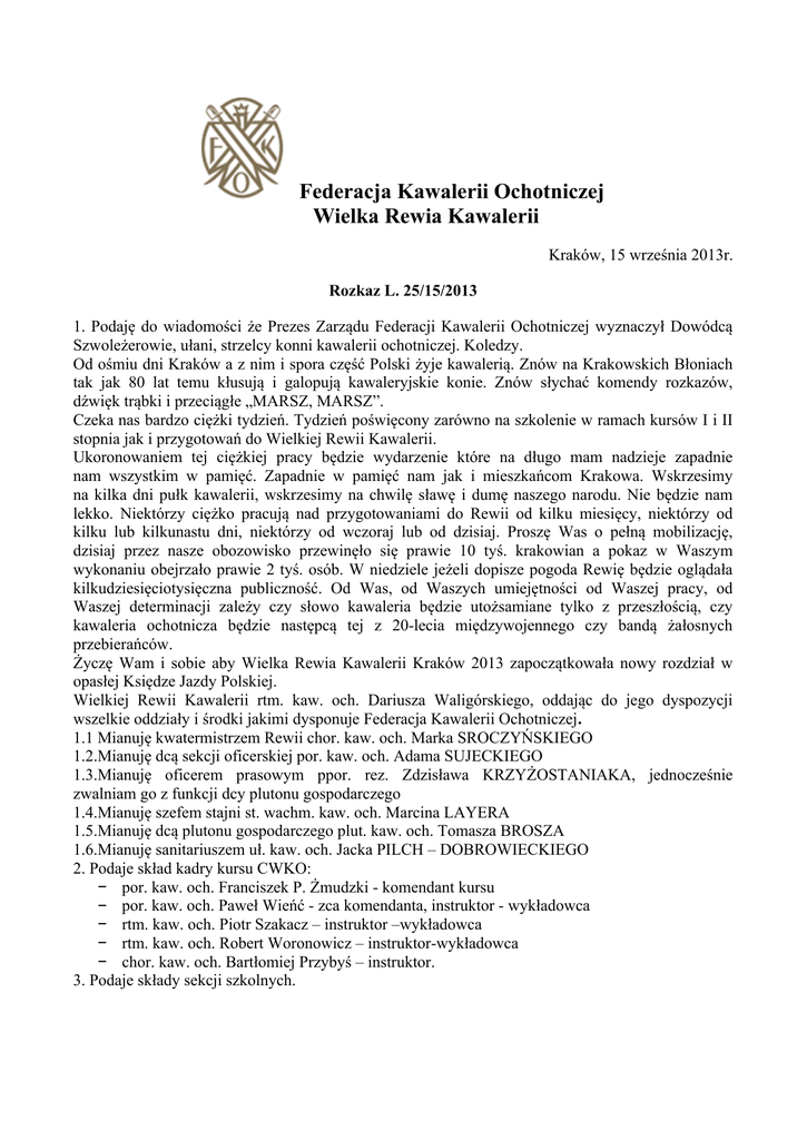 Federacja Kawalerii Ochotniczej Wielka Rewia Kawalerii Kraków, 15 września 2013r. Rozkaz L. 25/15/2013 1. Podaję do wiadomości że Prezes Zarządu Federacji Kawalerii Ochotniczej wyznaczył Dowódcą Szwoleżerowie, ułani, strzelcy konni kawalerii ochotniczej. Koledzy. Od ośmiu dni Kraków a z nim i spora część Polski żyje kawalerią. Znów na Krakowskich Błoniach tak jak 80 lat temu kłusują i galopują kawaleryjskie konie. Znów słychać komendy rozkazów, dźwięk trąbki i przeciągłe „MARSZ, MARSZ”. Czeka nas bardzo ciężki tydzień. Tydzień poświęcony zarówno na szkolenie w ramach kursów I i II stopnia jak i przygotowań do Wielkiej Rewii Kawalerii. Ukoronowaniem tej ciężkiej pracy będzie wydarzenie które na długo mam nadzieje zapadnie nam wszystkim w pamięć. Zapadnie w pamięć nam jak i mieszkańcom Krakowa. Wskrzesimy na kilka dni pułk kawalerii, wskrzesimy na chwilę sławę i dumę naszego narodu. Nie będzie nam lekko. Niektórzy ciężko pracują nad przygotowaniami do Rewii od kilku miesięcy, niektórzy od kilku lub kilkunastu dni, niektórzy od wczoraj lub od dzisiaj. Proszę Was o pełną mobilizację, dzisiaj przez nasze obozowisko przewinęło się prawie 10 tyś. krakowian a pokaz w Waszym wykonaniu obejrzało prawie 2 tyś. osób. W niedziele jeżeli dopisze pogoda Rewię będzie oglądała kilkudziesięciotysięczna publiczność. Od Was, od Waszych umiejętności od Waszej pracy, od Waszej determinacji zależy czy słowo kawaleria będzie utożsamiane tylko z przeszłością, czy kawaleria ochotnicza będzie następcą tej z 20-lecia międzywojennego czy bandą żałosnych przebierańców. Życzę Wam i sobie aby Wielka Rewia Kawalerii Kraków 2013 zapoczątkowała nowy rozdział w opasłej Księdze Jazdy Polskiej. Wielkiej Rewii Kawalerii rtm. kaw. och. Dariusza Waligórskiego, oddając do jego dyspozycji wszelkie oddziały i środki jakimi dysponuje Federacja Kawalerii Ochotniczej. 1.1 Mianuję kwatermistrzem Rewii chor. kaw. och. Marka SROCZYŃSKIEGO 1.2.Mianuję dcą sekcji oficerskiej por. kaw. och. Adama SUJECKIEGO 1.3.Mianuję oficerem prasowym ppor. rez. Zdzisława KRZYŻOSTANIAKA, jednocześnie zwalniam go z funkcji dcy plutonu gospodarczego 1.4.Mianuję szefem stajni st. wachm. kaw. och. Marcina LAYERA 1.5.Mianuję dcą plutonu gospodarczego plut. kaw. och. Tomasza BROSZA 1.6.Mianuję sanitariuszem uł. kaw. och. Jacka PILCH – DOBROWIECKIEGO 2. Podaje skład kadry kursu CWKO: − por. kaw. och. Franciszek P. Żmudzki - komendant kursu − por. kaw. och. Paweł Wieńć - zca komendanta, instruktor - wykładowca − rtm. kaw. och. Piotr Szakacz – instruktor –wykładowca − rtm. kaw. och. Robert Woronowicz – instruktor-wykładowca − chor. kaw. och. Bartłomiej Przybyś – instruktor. 3. Podaje składy sekcji szkolnych. 3.1. Kurs I Stopnia: Sekcja 1: 8 PU – dowódca sekcji, 1. ŚLIŻ Bogdan 2. DĄBRÓWKA Krzysztof 8 PU, 8 PU, 3. KŁONICKI Wojciech STAWOSKI Jacek 8 PU, 4. 8 PU. 5. ŚMIETANA Jakub Sekcja 2: 1 PU - dowódca sekcji, 1. DOMAŃSKI Maciej 3 PSzwol 2. MIZERSKI Piotr 3. MARKIEWICZ Mieszko 15 PU, P3SK, 4. MARĆ Tomasz P3SK, 5. PIERGIES Witold ROSTEK Łukasz P3SK. 6. KURS II stopnia: 3 Szwol, 1. PÓŁKA Piotr 12 PU, 2. JOHANIUK Tadeusz 12 PU, 3. PIASECKI Marek 15 PU, 4. LISIECKI Wojciech P3SK, 5. KŁOS Marcin P3SK. 6. RYŚ Andrzej 3.4. Pluton gospodarczy: − Sekcja I – dca sekcji wach. kaw. och. Andrzej KOWALCZYK st. strz. kaw. och. Jan JABCOŃ strz. kaw. och. Mateusz JAROSZEWSKI st. strz. kaw. och. Rafał STRZELCZYK strz. kaw. och. Wacław BORKOWSKI − Sekcja II st. uł. kaw. och. WARWAS Paweł – dca sekcji st. uł. kaw. och. WARWAS Paweł st. uł. kaw. och. SZCZEPANIAK Mateusz uł. kaw. och. SAJKIEWICZ Tomasz szwol. kaw. och. SIEDLEC Artur − Sekcja III kpr. kaw. och. JAGIELLIŃSKI Stanisław – dca sekcji st. uł. kaw. och. CZERWIEŃ Wiesław ułan kaw. och. ŻMUDZKI Andrzej ułan kaw. och. WĘDRYCHOWICZ Tomasz ułan kaw. och. TELEGA Wacław ułan kaw. och. SMALEC Zbigniew ułan kaw. och. NOSAL Stanisław − Sekcja Oficerska por. kaw. och. Mirosław FIRST chor. kaw. och. MISZTAL Stanisław chor. kaw. och. Tomasz PIECHOWICZ wach. kaw. och. REJDYCH Mirosław 4. Służba: 4.1 W dniu dzisiejszym wartę nocną pełni sekcja I kursu I stopnia. 4.2. W dniu jutrzejszym funkcję oficera dyżurnego pełni: kpr. kaw. och. PÓŁKA Piotr 4.3 Dyżur w stajni w dniu jutrzejszym pełni kurs II stopnia. 4.4. Wartę dzienną pełni sekcja II kursu I stopnia. Dowódca Rewii rtm. kaw. och. Dariusz Waligórski