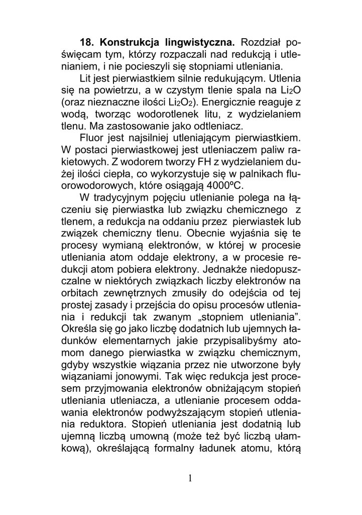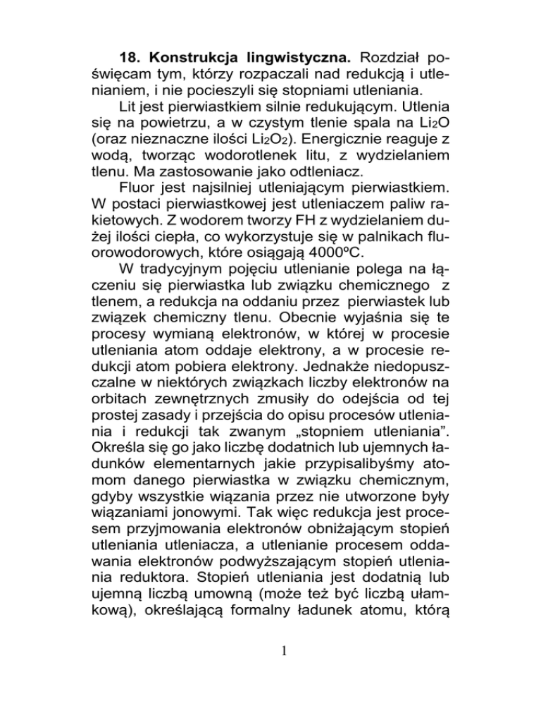 18. Konstrukcja lingwistyczna. Rozdział poświęcam tym, którzy rozpaczali nad redukcją i utlenianiem, i nie pocieszyli się stopniami utleniania. Lit jest pierwiastkiem silnie redukującym. Utlenia się na powietrzu, a w czystym tlenie spala na Li2O (oraz nieznaczne ilości Li2O2). Energicznie reaguje z wodą, tworząc wodorotlenek litu, z wydzielaniem tlenu. Ma zastosowanie jako odtleniacz. Fluor jest najsilniej utleniającym pierwiastkiem. W postaci pierwiastkowej jest utleniaczem paliw rakietowych. Z wodorem tworzy FH z wydzielaniem dużej ilości ciepła, co wykorzystuje się w palnikach fluorowodorowych, które osiągają 4000ºC. W tradycyjnym pojęciu utlenianie polega na łączeniu się pierwiastka lub związku chemicznego z tlenem, a redukcja na oddaniu przez pierwiastek lub związek chemiczny tlenu. Obecnie wyjaśnia się te procesy wymianą elektronów, w której w procesie utleniania atom oddaje elektrony, a w procesie redukcji atom pobiera elektrony. Jednakże niedopuszczalne w niektórych związkach liczby elektronów na orbitach zewnętrznych zmusiły do odejścia od tej prostej zasady i przejścia do opisu procesów utleniania i redukcji tak zwanym „stopniem utleniania”. Określa się go jako liczbę dodatnich lub ujemnych ładunków elementarnych jakie przypisalibyśmy atomom danego pierwiastka w związku chemicznym, gdyby wszystkie wiązania przez nie utworzone były wiązaniami jonowymi. Tak więc redukcja jest procesem przyjmowania elektronów obniżającym stopień utleniania utleniacza, a utlenianie procesem oddawania elektronów podwyższającym stopień utleniania reduktora. Stopień utleniania jest dodatnią lub ujemną liczbą umowną (może też być liczbą ułamkową), określającą formalny ładunek atomu, którą 1 dla odróżnienia od rzeczywistego ładunku jonu oznacza się cyfrą rzymską z opuszczeniem znaku „plus”. Nic teraz nie stoi na przeszkodzie, by, dla przykładu, pierwiastek osm przyjął stopnie utleniania, jakie ładunki rzeczywiste przyjąć nie mogą, a azot także ułamkowe stopnie utleniania. Przykłady dla osmu: OsII (OsI2), OsIII (OsCl3), OsIV (OsO2), OsV (OsF5), OsVI (OsF6), OsVII (OsF7), OsVIII (OsO4). Przykłady dla azotu: N-III (Li3N), N-II (N2H4), N-I (NH2Cl), N-I/3 (HN3), NI (N2O), NII (NO), NIII (N2O3), NIV (NO2), NV (N2O5). Związek stopnia utlenienia z wartościowością w pierwotnym pojęciu oraz z oddawaniem i pobieranie elektronów się zatraca, gdyż „w żadnym trwałym związku chemicznym nie występują ładunki tak wysokie jak spotykane stopnie utleniania, np. +7, +5, czy –4”. Tablice chemiczne (Tabl. chem.), Adamantan, Warszawa 2004, s.64. Transfizyka musi wykazać, że procesy te oraz wszelkie inne procesy, w których występują jony, można opisać bez pojęcia „ładunku elektrycznego”, Zastępują je pojęcia nadmiaru i niedoboru substancji. Zwrot „ładunki, jakie przypisalibyśmy, gdyby” jest wyrazem rezygnacji z fizykalnego opisu tych procesów, a nazwa „stopień utleniania” w procesach, gdzie w większości przypadków utlenianie nie występuje, uprzedza, iż szukanie objaśnienia jest bezcelowe. Konstrukcji lingwistycznych takich jak „stopień utleniania” jest w fizyce wiele, lecz tego nie zauważamy, gdyż oswaja nas z nimi już w młodości szkoła. Efektywność chemii nie pozostawia jednocześnie wątpliwości, że prognozy podejmowane na tak wątpliwej podstawie są trafne. Jest to problem o kluczowym znaczeniu zarówno dla fizyki i transfizyki, 2 gdyż stawia pod znakiem pytania sens „teorii” jako odbicia rzeczywistości. Problem w toku dalszych rozdziałów nabierze wyrazistości. 3