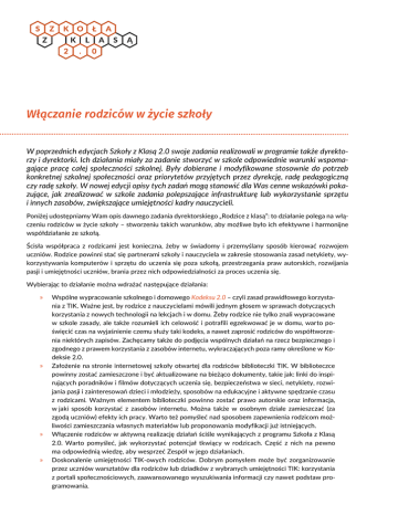 W poprzednich edycjach Szkoły z Klasą 2.0 swoje zadania realizowali w programie także dyrektorzy i dyrektorki. Ich działania miały za zadanie stworzyć w szkole odpowiednie warunki wspomagające pracę całej społeczności szkolnej. Były dobierane i modyfikowane stosownie do potrzeb konkretnej szkolnej społeczności oraz priorytetów przyjętych przez dyrekcję, radę pedagogiczną czy radę szkoły. W nowej edycji opisy tych zadań mogą stanowić dla Was cenne wskazówki pokazujące, jak zrealizować w szkole zadania polepszające infrastrukturę lub wykorzystanie sprzętu i innych zasobów, zwiększające umiejętności kadry nauczycieli. Poniżej udostępniamy Wam opis dawnego zadania dyrektorskiego „Rodzice z klasą”: to działanie polega na włączeniu rodziców w życie szkoły – stworzeniu takich warunków, aby możliwe było ich efektywne i harmonijne współdziałanie ze szkołą. Ścisła współpraca z rodzicami jest konieczna, żeby w świadomy i przemyślany sposób kierować rozwojem uczniów. Rodzice powinni stać się partnerami szkoły i nauczyciela w zakresie stosowania zasad netykiety, wykorzystywania komputerów i sprzętu do uczenia się poza szkołą, przestrzegania praw autorskich, rozwijania pasji i umiejętności uczniów, brania przez nich odpowiedzialności za proces uczenia się. Wybierając to działanie można wdrażać następujące działania: » » » » Wspólne wypracowanie szkolnego i domowego Kodeksu 2.0 – czyli zasad prawidłowego korzystania z TIK. Ważne jest, by rodzice z nauczycielami mówili jednym głosem w sprawach dotyczących korzystania z nowych technologii na lekcjach i w domu. Żeby rodzice nie tylko znali wypracowane w szkole zasady, ale także rozumieli ich celowość i potrafili egzekwować je w domu, warto poświęcić czas na wyjaśnienie czemu służy taki kodeks, a nawet zaprosić rodziców do współtworzenia niektórych zapisów. Zachęcamy także do podjęcia wspólnych działań na rzecz bezpiecznego i zgodnego z prawem korzystania z zasobów internetu, wykraczających poza ramy określone w Kodeksie 2.0. Założenie na stronie internetowej szkoły otwartej dla rodziców biblioteczki TIK. W biblioteczce powinny zostać zamieszczone i być aktualizowane na bieżąco dokumenty, takie jak: linki do inspirujących poradników i filmów dotyczących uczenia się, bezpieczeństwa w sieci, netykiety, rozwijania pasji i zainteresowań dzieci i młodzieży, sposobów na edukacyjne i aktywne spędzanie czasu z rodzicami. Ważnym elementem biblioteczki powinno zostać prawo autorskie oraz informacja, w jaki sposób korzystać z zasobów internetu. Można także w osobnym dziale zamieszczać (za zgodą uczniów) efekty ich pracy. Warto też pomyśleć nad sposobem zapewnienia rodzicom możliwości zamieszczania własnych materiałów lub proponowania modyfikacji już istniejących. Włączenie rodziców w aktywną realizację działań ściśle wynikających z programu Szkoła z Klasą 2.0. Warto pomyśleć, jak wykorzystać potencjał tkwiący w rodzicach. Część z nich na pewno ma odpowiednią wiedzę, aby wesprzeć Zespół w jego działaniach. Doskonalenie umiejętności TIK-owych rodziców. Dobrym pomysłem może być zorganizowanie przez uczniów warsztatów dla rodziców lub dziadków z wybranych umiejętności TIK: korzystania z portali społecznościowych, zaawansowanego wyszukiwania informacji czy nawet podstaw programowania. Wskazówki dla Zespołu: » » » » » » » Warto zacząć od rzetelnej diagnozy istniejącej współpracy z rodzicami i analizy potrzeb zarówno rodziców, nauczycieli jak i uczniów. Jaka jest wiedza rodziców w zakresie wspierania dzieci w procesie uczenia się, czy wykorzystywania nowych technologii? Jakie są oczekiwania rodziców w tym zakresie? W jakie szkolne działania rodzice często i chętnie się angażują? Jakie obszary są najbardziej problematyczne w zakresie współpracy z rodzicami? Z czego to może wynikać? Co możemy zrobić, żeby to zmienić? Co dokładnie chcemy osiągnąć poprzez realizację tego zadania? Te i wiele innych pytań należy zadać sobie na samym wstępie – dobra, wnikliwa diagnoza pozwoli zaplanować działanie odpowiadające potrzebom szkoły. Diagnoza potrzeb powinna służyć wyznaczaniu konkretnych celów, jakie chcemy osiągnąć. Dobrze jest wyznaczyć sobie na początek maksymalnie 2-3 cele i zacząć małymi krokami. Słuchajmy tego, co mają nam do powiedzenia rodzice i bierzmy pod uwagę ich sugestie i pomysły. Żeby rodzice chcieli włączać się w działania szkoły, musimy dać im poczucie, że są współtwórcami obowiązujących zasad, a nie tylko ich odbiorcami. Przekonujmy rodziców na różne sposoby. Pokazujmy, że bez wsparcia rodziców i umiejętności posługiwania się nowymi technologiami i mediami dzieci nie będą przygotowane do wielu sytuacji, które spotkają na dalszej drodze edukacyjnej i zawodowej. Pokazujmy, że komputery nie są tylko źródłem rozrywki, ale także narzędziem pracy i nauki, a nowe metody pracy i samodzielność edukacyjna uczniów pomagają im się rozwijać. Możemy zorganizować dla rodziców lekcję pokazową albo warsztaty z uczniami jako trenerami pokazującymi, czego i jak się uczą, wprowadzając tym samym rodziców w ich świat. Włączajmy rodziców w działania! Może to być wspólna debata szkolna nad stworzeniem/modyfikacją Kodeksu 2.0 – zarówno szkolnego, jak i domowego – wspólne planowanie działań realizowanych w Szkole z Klasą 2.0 w trójkącie: rodzic-nauczyciel-uczeń. Można też zaprosić rodziców do współorganizowania zajęć związanych z nowymi metodami nauczania, nowymi technologiami lub innych (w zależności od umiejętności rodziców). Kluczowe jest także budowanie dobrej relacji dyrektor-Rada Rodziców i ustalenie (wspólnie z Radą) harmonogramu działań, na który wszyscy się zgadzają. Dobrym pomysłem jest powołanie zespołu nauczycieli do 