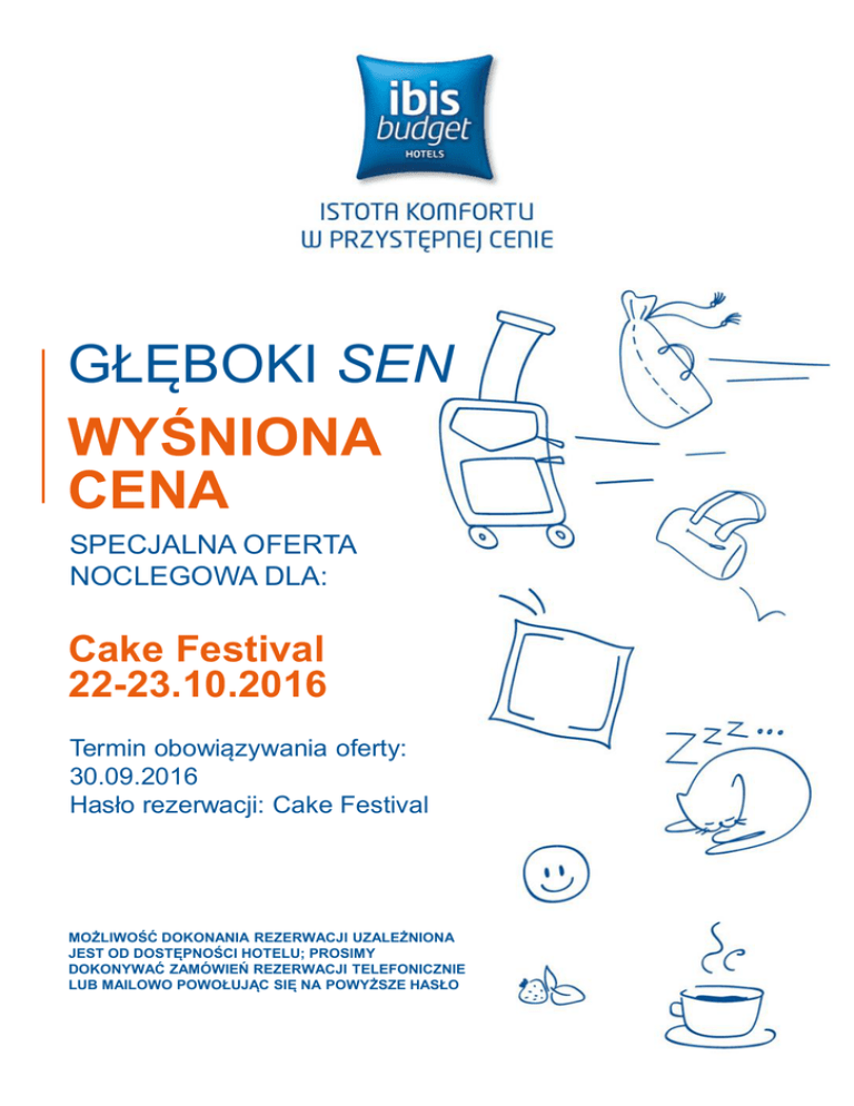GŁĘBOKI SEN WYŚNIONA CENA SPECJALNA OFERTA NOCLEGOWA DLA: Cake Festival 22-23.10.2016 Termin obowiązywania oferty: 30.09.2016 Hasło rezerwacji: Cake Festival MOŻLIWOŚĆ DOKONANIA REZERWACJI UZALEŻNIONA JEST OD DOSTĘPNOŚCI HOTELU; PROSIMY DOKONYWAĆ ZAMÓWIEŃ REZERWACJI TELEFONICZNIE LUB MAILOWO POWOŁUJĄC SIĘ NA POWYŻSZE HASŁO IBIS BUDGET KATOWICE CENTRUM al.Roździeńskiego 18, 40-202 Katowice T: +48 32 350 50 40, F: +48 32 255 55 01 [email protected] Szanowni Państwo, W zwiazku z organizowanym I Cake Festiwalem – w Katowicach w dniach 22-23.10.2016, chciałabym zaproponować zakwaterowanie uczestników biorących udział w tym wydarzeniu. Istotą marki ibis budget jest zapewnienie komfortu oraz usług wysokiej jakości w przystępnej cenie. Oferujemy również pyszne i zdrowe śniadania w formie bufetu bez ograniczeń, a także całodobowy dostęp do automatów z przekąskami oraz z gorącymi i zimnymi napojami w hotelowym lobby. Przy hotelu znajduje się również wygodny i dozorowany parking. Hotel znajduje się w odległości zaledwie 0,75km od Międzynarodowego Centum Kongresowego , dokąd wygodnie można dojechać samochodem lub dotrzeć pieszo (ok.10min). Poniżej mam przyjemność przedstawić specjalną ofertę zakwaterowania : ZAKWATEROWANIE CENA ZA POKÓJ ZA NOC Pokój jednoosobowy ze śniadaniem 129 pln (brutto) Pokój dwuosobowy ze śniadaniami 144 pln (brutto) Parking 21pln (brutto)/sam.osobowy 80pln (brutto)/bus Mamy nadzieję, że nasza oferta spełni Państwa oczekiwania i przyczyni się do nawiązania owocnej współpracy. W razie jakichkolwiek pytań lub wątpliwości, proszę o kontakt. Z poważaniem, Małgorzata Hamala dyrektor hotelu