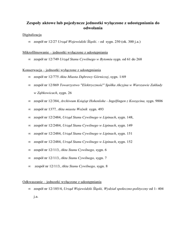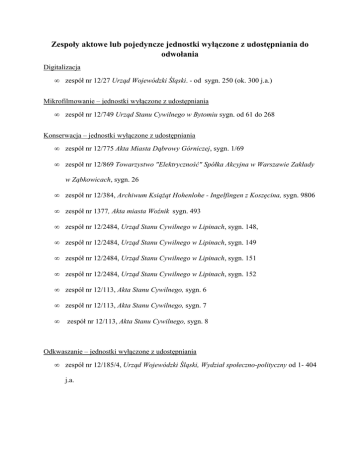 Zespoły aktowe lub pojedyncze jednostki wyłączone z udostępniania do odwołania Digitalizacja • zespół nr 12/27 Urząd Wojewódzki Śląski. - od sygn. 250 (ok. 300 j.a.) Mikrofilmowanie – jednostki wyłączone z udostępniania • zespół nr 12/749 Urząd Stanu Cywilnego w Bytomiu sygn. od 61 do 268 Konserwacja – jednostki wyłączone z udostępniania • zespół nr 12/775 Akta Miasta Dąbrowy Górniczej, sygn. 1/69 • zespół nr 12/869 Towarzystwo "Elektryczność" Spółka Akcyjna w Warszawie Zakłady w Ząbkowicach, sygn. 26 • zespół nr 12/384, Archiwum Książąt Hohenlohe - Ingelfingen z Koszęcina, sygn. 9806 • zespół nr 1377, Akta miasta Woźnik sygn. 493 • zespół nr 12/2484, Urząd Stanu Cywilnego w Lipinach, sygn. 148, • zespół nr 12/2484, Urząd Stanu Cywilnego w Lipinach, sygn. 149 • zespół nr 12/2484, Urząd Stanu Cywilnego w Lipinach, sygn. 151 • zespół nr 12/2484, Urząd Stanu Cywilnego w Lipinach, sygn. 152 • zespół nr 12/113, Akta Stanu Cywilnego, sygn. 6 • zespół nr 12/113, Akta Stanu Cywilnego, sygn. 7 • zespół nr 12/113, Akta Stanu Cywilnego, sygn. 8 Odkwaszanie – jednostki wyłączone z udostępniania • zespół nr 12/185/4, Urząd Wojewódzki Śląski, Wydział społeczno-polityczny od 1- 404 j.a. Konserwacja masowa – zespoły wyłączone z udostępniania • zespół nr 12/398 Katowickie Zjednoczenie Przemysłu Węglowego Opracowanie – zespoły wyłączone z udostępniania • zespół nr 12/1061, Akta stanu cywilnego Parafii Rzymskokatolickiej w Sączowie • zespół nr 12/1062, Akta stanu cywilnego Parafii Rzymskokatolickiej w Siemonii • zespół nr 12/1150, Akta gminy Skała • zespół nr 12/2805 Urząd Stanu Cywilnego w Zawierciu • zespół nr 12/893 Akta stanu cywilnego Parafii Rzymskokatolickiej Chruszczobród • zespół nr 12/897 Akta stanu cywilnego Parafii Rzymskokatolickiej Niegowonice • zespół nr 12/2699 Urząd Stanu Cywilnego w Szarleju • zespół nr 12/2700 Urząd Stanu Cywilnego w Piekarach Śląskich Zespoły wyłączone ze względu na prace remontowe • 12/766 Wojewódzkie Biuro Projektów w Katowicach • 12/773 Akta Miasta Będzina, od sygn. 648 wzwyż • 12/776 Akta Miasta Sosnowca, sygn. 1-6837 • 12/786 Akta gminy Rokitno Szlacheckie • 12/848 Towarzystwo Francusko - Włoskie Dąbrowskich Kopalń Węgla Spółka Akcyjna w Dąbrowie Górniczej • 12/849 Franko - Polskie Towarzystwo Górnicze Spółka Akcyjna (Dąbrowa Górnicza) w Sosnowcu • 12/857 H. Dietel Spółka Akcyjna Przemysłu Włókienniczego w Sosnowcu • 12/862 Huta Bankowa w Dąbrowie Górniczej • 12/903 Towarzystwo Zakładów Przędzalni Bawełny, Tkalni i Blecharni „Zawiercie” Spółka Akcyjna w Zawierciu • 12/906 Fabryka Szkła dawniej S. Reich i Spółka w Zawierciu • 12/909 Komunalna Kasa Oszczędności Powiatu Zawierciańskiego • 12/1161 Akta gminy Libiąż Mały • 12/1599 Kasa Oszczędnościowo - Pożyczkowa w Ożarowicach