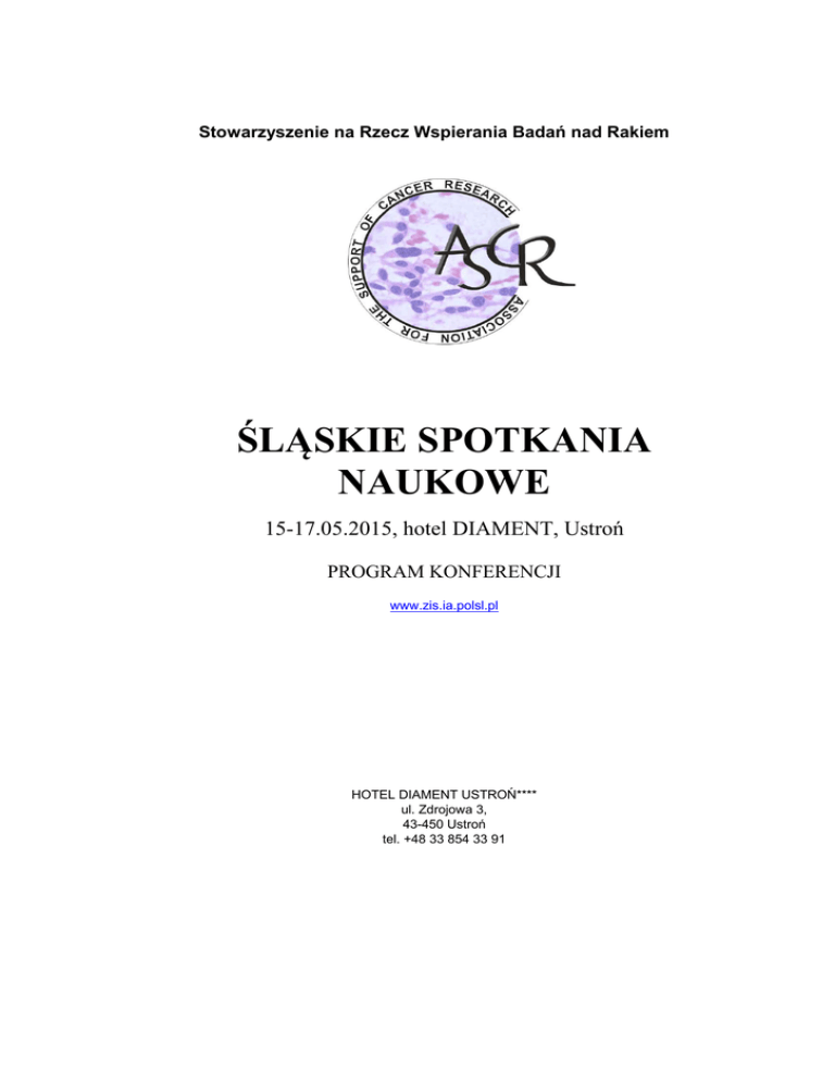 Stowarzyszenie na Rzecz Wspierania Badań nad Rakiem ŚLĄSKIE SPOTKANIA NAUKOWE 15-17.05.2015, hotel DIAMENT, Ustroń PROGRAM KONFERENCJI www.zis.ia.polsl.pl HOTEL DIAMENT USTROŃ**** ul. Zdrojowa 3, 43-450 Ustroń tel. +48 33 854 33 91 ŚLĄSKIE SPOTKANIA NAUKOWE 15-17.05.2015, hotel DIAMENT, Ustroń PROGRAM KONFERENCJI Piątek 18:00-20:00 Kolacja - restauracja w hotelu Diament SESJA 1 Współpraca i projekty naukowe na Śląsku 20:00-20:15 Rzeszowska Joanna Politechnika Śląska Widłak Piotr 20:15-20:30 Centrum Onkologii - Instytut im. M Skłodowskiej-Curie Karol Jelonek 20:30-20:45 Centrum Onkologii - Instytut im. M Skłodowskiej-Curie Wprowadzenie Projekt ONKO.SYS – Kompleksowa infrastruktura informatyczna dla badań nad nowotworami (prezentacja projektu) SYSCANCER - Zintegrowany system informatyczny wspomagający badania nad nowotworami pochodzenia środowiskowego (prezentacja projektu) Dyskusja. Moderatorzy: Joanna Rzeszowska, Andrzej Świerniak, Piotr Widłak 20:45-21:00 SESJA 2 Regulacja ekspresji genów na poziomie transkryptu i białka Sobota 09:00-9:10 Rzeszowska Joanna 9:10-9:20 Biernacki Krzysztof 9:20-9:30 Hudy Dorota 9:30-9:40 Poterała Aleksandra 9:40-9:50 Ślęzak-Prochazka Izabella Politechnika Śląska Politechnika Śląska Politechnika Śląska Politechnika Śląska Wprowadzenie Analiza wpływu struktury miRNA na regulację ekspresji genów Badanie regulacji procesu syntezy białek zależnego od sekwencji regulatorowej końca 3’ transkryptu Białka Ago: funkcje i rola w regulacji ekspresji genów Wpływ promieniowania jonizującego na aktywność miRNA Politechnika Śląska 9:50-10:00 Jaksik Roman 10:00-10:10 Krzywoń Aleksandra Politechnika Śląska Politechnika Śląska Gramatyka Michalina 10:10-10:20 Centrum Onkologii - Instytut im. M Skłodowskiej-Curie Olbryt Magdalena 10:20-10:30 2 Centrum Onkologii - Instytut im. M Skłodowskiej-Curie Analiza fenotypu mutatora związanego z polimerazą epsilon Popromienny efekt sąsiedztwa po ekspozycji na promieniowanie ultrafioletowe Zmiany metaboliczne w napromienianych kardiomiocytach Wpływ hipoksji cyklicznej i chronicznej ŚLĄSKIE SPOTKANIA NAUKOWE 15-17.05.2015, hotel DIAMENT, Ustroń PROGRAM KONFERENCJI Przerwa kawowa 10:30-11:00 c.d. SESJA 2 Regulacja ekspresji genów na poziomie transkryptu i białka Rusin Marek 11:00-11:10 Centrum Onkologii - Instytut im. M Skłodowskiej-Curie Naumowicz Anna 11:10-11:20 11:20-11:30 Centrum Onkologii - Instytut im. M Skłodowskiej-Curie Kardyńska Małgorzata Centrum Onkologii - Instytut im. M Skłodowskiej-Curie Pietrowska Monika 11:40-11:50 Centrum Onkologii - Instytut im. M Skłodowskiej-Curie Widłak Wiesława 11:50-12:00 Oddziaływania ścieżek sygnałowych zależnych od czynników transkrypcyjnych NFκB i HSF1 Wrażliwość odpowiedzi szlaku NF-kB na zmiany temperatury Politechnika Śląska Jelonek Karol 11:30-11:40 Analiza skutków synergistycznej aktywacji przeciwnowotworowego białka p53 Centrum Onkologii - Instytut im. M Skłodowskiej-Curie Odpowiedź organizmu na promieniowanie jonizujące u pacjentów z nowotworami regionu głowy i szyi oraz prostaty; analiza porównawcza proteomu surowicy krwi Proteom, lipidom oraz miRN-om egzosomów uwalnianych z komórek raka głowy i szyi w odpowiedzi na czynniki genotoksyczne Regulacja apoptozy indukowanej stresem termicznym – badania postgenomiczne SESJA 3 Molekularne markery nowotworowe 12:00-12:10 Sieroń Aleksander 12:10-12:20 Bułdak Rafał 12:20-12:40 12:40-12:50 Śląski Uniwersytet Medyczny Śląski Uniwersytet Medyczny Ratuszna Alicja Uniwersytet Śląski Malarz Katarzyna Uniwersytet Śląski Ekspresja genu supresorowego, hipermetylowany w raku 1 (HIC1) w nowotworze krtani Rola adipocytokin w progresji nowotworów Kierunki badan nad terapią raka w zespołach Ślaskiego Miedzyuczelnianego Centrum Edukacji i Badan Interdyscyplinarnych Uniwersytetu Śląskiego Wpływ reaktywnych form tlenu, generowanych przez pochodne tiosemikarbazonu, na wewnątrzkomórkowe stężenie glutationu 3 ŚLĄSKIE SPOTKANIA NAUKOWE 15-17.05.2015, hotel DIAMENT, Ustroń PROGRAM KONFERENCJI Przerwa obiadowa 13:00-14:00 c.d. SESJA 3 Molekularne markery nowotworowe Lisowska Katarzyna 14:00-14:10 Centrum Onkologii - Instytut im. M Skłodowskiej-Curie Poszukiwanie markerów molekularnych w raku jajnika Gdowicz-Kłosok Agnieszka W poszukiwaniu nowych markerów prognostycznych i 14:10-14:20 14:20-14:30 Centrum Onkologii - Instytut im. M Skłodowskiej-Curie Analiza wpływu sylwetki genetycznej chorego na przeżywalność w niedrobnokomórkowym raku płuca Król Łukasz Politechnika Śląska Mazurek Agnieszka 14:30-14:40 Centrum Onkologii - Instytut im. M Skłodowskiej-Curie Tęcza Karolina 14:40-14:50 Centrum Onkologii - Instytut im. M Skłodowskiej-Curie 14:50-15:00 Golda Adam 15:00-15:10 Lalik Anna Gliwickie Centrum Medyczne Monitorowanie chorych na raka gardła środkowego z wykorzystaniem detekcji DNA wirusa HPV1 Farmakogenetyczne modele odpowiedzi na chemioterapię w raku piersi Zależne od wyciszenia Arylsulfatazy B zmiany ekspresji genów w komórkach endotelium i mięsni gładkich tętnicy płucnej Wybrane aspekty badań nad zmianami glikozylacji w komórkach nowotworowych Politechnika Śląska Roś Małgorzata 15:10-15:20 predykcyjnych u pacjentów chorych na niedrobnokomórkowego raka płuca Centrum Onkologii - Instytut im. M Skłodowskiej-Curie Składniki lipidomu surowicy jako potencjalne wczesne markery rozwoju raka płuca SESJA 4 Biotechnologia - nowe metody i możliwości Chadalski Marek 15:20-15:30 Centrum Onkologii - Instytut im. M Skłodowskiej-Curie 15:30-15:40 Cwalina Beata 15:40-15:50 Hudecki Andrzej 15:50-16:00 Mielańczyk Anna Politechnika Śląska Politechnika Śląska Politechnika Śląska Oleszko Natalia 16:00-16:10 Centrum Materiałów Polimerowych i Węglowych Polska Akademia Nauk Szweda Róża 16:10-16:20 16:20-16:30 4 Otrzymywanie rekombinowanej rozpuszczalnej formy podoplaniny w komórkach ssaczych Tworzenie się biof