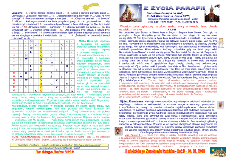 Uzupełnij: 1. „Prawo zostało nadane przez …” 2. „Łaska i prawda przyszły przez … Chrystusa 3. „Boga nikt nigdy nie …” 4. „Jednorodzony Bóg, który jest w … Ojca, /o Nim/ pouczył”. 5. Przeznaczeniem każdego z nas jest … 6. „Chrystus znalazł … w świecie” 7. Miłość … każdego człowieka na świat przychodzącego. 8. Jan „przyszedł na … aby zaświadczyć o światłości” 9. „Na świecie było /Słowo/, a świat stał się przez Nie, lecz świat Go nie …” 10. „Chrystus został … narodom”. 11. /Słowo/ przyszło do swojej … 12. Jan „przyszedł, aby … uwierzyli przez niego” 13. „Na początku było Słowo, a Słowo było u Boga, i … było Słowo”. 14. Słowo stało się ciałem i jest źródłem naszego życia i otwarcia się na drugiego człowieka i uwielbienia dla … 15. „Światłość w ciemności świeci i ciemność jej nie …” 1 - Matka Boża tyle wiedziała x x M J E A x o Mesjaszu od wielkich 2 x x x x x J E A proroków Starego Testamentu 3 x x x W D Ł x od Izajasza, wprost 4 x x x x x Ł N E x z psalmów mesjańskich … 5 A jednak wsłuchiwała się w to, x x x x M O Ć x co opowiadali o Mesjaszu 6 x x x x x x W R Ę prości pasterze, którzy mówili 7 x x x x O W E A językiem codziennym, jakim 8 Ś I D C O x posługiwali się przy pasieniu 9 bydła i strzyżeniu owiec. – x x x x P Z Ł x Opowiadali o widzeniu anioła, 10 x x O O Z Y a każdy zobaczył go inaczej, 11 x x W A N Ś I chociaż to był wciąż ten sam 12 x x x W Y Y x anioł…– Opowiadali jak 13 ważne było to, że przebudzili x x x x B G M x się w nocy. Wierzyli bowiem, 14 x x x S Ó Y x że gdy Bóg przerwie sen, to 15 x x x O G R Ę A ma coś ważnego do powiedzenia. – Opowiadali językiem tak prostym, jak język kolęd … - Pokochajmy prostą wiarę dziecka, wiarę pasterza, który we wszystkim widzi coś wielkiego, chociaż nie wszystko potrafi wypowiedzieć. Kryje się w tym wielka wiara i wielka miłość Boga, który potrafi przychodzić do ludzi w niespodziewany sposób. [Ks. Jan Twardowski]. Astrologowie, którzy wpatrzeni w gwiazdę przyszli, by oddać cześć Bogu, byli poganami, ludźmi niewierzącymi. Nie znali przecież ani Pisma Świętego, ani żydowskich proroków, ani jerozolimskiej świątyni. …Trzej królowie uczą nas pokory i spokoju. Pokory, bo może jestem gorszy od tego, który inaczej wierzy , - może on kiedyś mocniej uwierzy niż ja. Spokoju – bo Bóg prowadzi Bożą sprawę. Objawia się i w potędze – i w słabości. Byle Mu zaufać. - *Jak długo nieraz rozum musi podróżować, ile musi tłuc się na wielbłądach, ile udźwignąć pakunków, żeby wreszcie pokłonić się Panu Bogu. Pokłon rozumu jest niezwykły i wzruszający. Pasterze może uklękli, a może stali tylko w stajni z sercem wyrywającym się do nieba, a rozum dumny, szukający prawdy, wszystko sprawdzający, położył się na ziemi jak cichutka myszka. Pokłon rozumu jest ważniejszy, bo głębszy od pokłonu serca. [x Jan Twardowski, W świetle Ewangelii, s. 12-13]. MOJE POSTANOWIENIE: Pomodlę się o miłosierdzie i o wiarę - aby … nie zabrakło mi ufności w Miłość, Pokój i Dobro … powierzę też Bogu wszystkich moich bliskich … Kancelaria Parafialna e-mail : [email protected] http://www.stanislaw-bm.pl/ [gazetka do użytku wewnętrznego Parafii] . ‘ Stanisława Biskupa na Woli; 01-244 Warszawa; ul. Bema 73/75, Kancelaria Parafialna czynna: poniedziałek - piątek godz. 9:00 - 10:00; 16:00 - 17:30 ; tel. 22 632 38 00 Chrystus został ogłoszony narodom, znalazł wiarę w świecie, Jemu chwała na wieki. (1 Tm 3,16) J 1,1-18 Na początku było Słowo, a Słowo było u Boga, i Bogiem było Słowo. Ono było na początku u Boga. Wszystko przez Nie się stało, a bez Niego nic się nie stało, co się stało. W Nim było życie, a życie było światłością ludzi, a światłość w ciemności świeci i ciemność jej nie ogarnęła. Pojawił się człowiek posłany przez Boga - Jan mu było na imię. Przyszedł on na świadectwo, aby zaświadczyć o światłości, by wszyscy uwierzyli przez niego. Nie był on światłością, lecz /posłanym/, aby zaświadczyć o światłości. Była światłość prawdziwa, która oświeca każdego człowieka, gdy na świat przychodzi. Na świecie było /Słowo/, a świat stał się przez Nie, lecz świat Go nie poznał. Przyszło do swojej własności, a swoi Go nie przyjęli. Wszystkim tym jednak, którzy Je przyjęli, dało moc, aby się stali dziećmi Bożymi, tym, którzy wierzą w imię Jego - którzy ani z krwi, ani z żądzy ciała, ani z woli męża, ale z Boga się narodzili. A Słowo stało się ciałem i zamieszkało wśród nas. I oglądaliśmy Jego chwałę, chwałę, jaką Jednorodzony otrzymuje od Ojca, pełen łaski i prawdy. Jan daje o Nim świadectwo i głośno woła w słowach: Ten był, o którym powiedziałem: Ten, który po mnie idzie, przewyższył mnie godnością, gdyż był wcześniej ode mnie. Z Jego pełności wszyscyśmy otrzymali - łaskę po łasce. Podczas gdy Prawo zostało nadane przez Mojżesza, łaska i prawda przyszły przez Jezusa Chrystusa. Boga nikt nigdy nie widział, Ten Jednorodzony Bóg, który jest w łonie Ojca, /o Nim/ pouczył. Trudno być człowiekiem twórczym, pełnym radości i optymizmu, jeśli uważamy, że wszystko jest w rękach niezrozumiałego i budzącego lęk przeznaczenia. Jednak w miarę jak odkrywamy, że przeznaczeniem każdego z nas jest Miłość – ta, która oświeca każdego człowieka na świat przychodzącego i która będąc Słowem, stała się ciałem -– odnajdujemy w niej źródło naszego życia – twórczości, prawdziwej radości, otwarcia na drugiego człowieka i uwielbienia dla Stwórcy. [O. C. Binkiewicz OP, „Oremus” - I - 2004, s. 17]. Ojciec Franciszek: «Istnieje wiele powodów, aby wierzyć w zdolność ludzkości do wspólnego działania w solidarności, w uznaniu swego wzajemnego