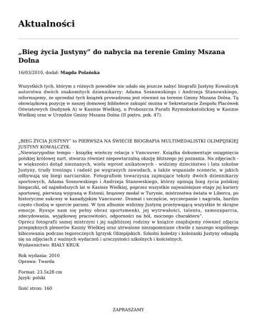 Aktualności „Bieg życia Justyny” do nabycia na terenie Gminy Mszana Dolna 16/03/2010, dodał: Magda Polańska Wszystkich tych, którym z różnych powodów nie udało się jeszcze nabyć biografii Justyny Kowalczyk autorstwa dwóch znakomitych dziennikarzy: Adama Sosnowskiego i Andrzeja Stanowskiego, informujemy, że sprzedaż tych książek prowadzona jest również na terenie Gminy Mszana Dolna. Tą obowiązkową pozycję w naszej domowej bibliotece zakupić można w Sekretariacie Zespołu Placówek Oświatowych (budynek A) w Kasinie Wielkiej, u Proboszcza Parafii Rzymskokatolickiej w Kasinie Wielkiej oraz w Urzędzie Gminy Mszana Dolna (II piętro, pok. 47). „BIEG ŻYCIA JUSTYNY” to PIERWSZA NA ŚWIECIE BIOGRAFIA MULTIMEDALISTKI OLIMPIJSKIEJ JUSTYNY KOWALCZYK. „Niewiarygodne tempo - książkę wieńczy relacja z Vancouver. Książka dokumentuje osiągnięcia polskiej królowej nart, stwarza również niepowtarzalną okazję bliższego jej poznania. Na zdjęciach w większości dotąd nieznanych, wielu wprost unikatowych - widzimy dzieciństwo i lata szkolne Justyny, trudy treningu i radość po wygranych zawodach, a także wspaniałe scenerie, w jakich odbywają się biegi narciarskie. Fotografiom towarzyszą zajmujące teksty dwóch dziennikarzy sportowych, Adama Sosnowskiego i Andrzeja Stanowskiego, którzy opisują bieg życia polskiej biegaczki, od najmłodszych lat w Kasinie Wielkiej, poprzez wszystkie najważniejsze etapy jej kariery sportowej, pierwszą wygraną w Estonii, brązowy medal w Turynie, mistrzostwa świata w Libercu, po historyczne sukcesy w kanadyjskim Vancouver. Dramat i szczęście, wyczerpanie i nagroda, bardzo często chodzą w sporcie parami. W tym albumie widzimy Justynę przeżywającą wszystkie te skrajne emocje. Rysuje nam się pełny obraz sportsmenki, jej wytrwałości, talentu, samozaparcia, zdecydowania, wyjątkowej pracowitości, odporności na ból, mocnego charakteru”. Oprócz fotografii samej mistrzyni i jej najbliższej rodziny w książce znajdujemy również zdjęcia przepięknych plenerów Kasiny Wielkiej oraz utrwalone niezapomniane chwile z naszego wspólnego kibicowania podczas tegorocznych Igrzysk Olimpijskich. Szkolni koledzy i koleżanki Justyny odnajdą się na zdjęciach z ważnych wydarzeń i uroczystości szkolnych i kościelnych. Wydawnictwo: BIAŁY KRUK Rok wydania: 2010 Oprawa: Twarda Format: 23.5x28 cm Język: polski Ilość stron: 160 ZAPRASZAMY Magda Polańska