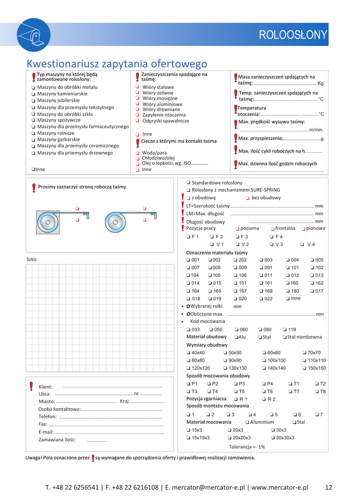 ROLOOSàONY Kwestionariusz zapytania ofertowego Typ maszyny na której bħdČ zamontowane rolosųony: O Maszyny do obróbki metalu O Maszyny kamieniarskie O Maszyny jubilerskie O Maszyny dla przemysųu tekstylnego O Maszyny do obróbki szkųa O Maszyny spoǏywcze O Maszyny dla przemysųu farmaceutycznego O Maszyny rolnicze O Maszyny garbarskie O Maszyny dla przemysųu ceramicznego O Maszyny dla przemysųu drzewnego OInne O O O O O O O Zanieczyszczenia spadajČce na taƑmħ: Wióry stalowe Wióry Ǐeliwne Wióry mosiħǏne Wióry aluminiowe Wióry drewniane Zapylenie otoczenia Odpryski spawalnicze Masa zanieczyszczeń spdających na taśmę: ................................................ Kg Temp. zanieczyszczeń spdających na taśmę:.................................................°C Temperatura otoczenia: ............................................°C Max. prędkość wysuwu taśmy: ....................................................m/min. O Inne Max. przyspieszenie:..............................g Ciecze z którymi ma kontakt taƑma O O O O Max. ilość cykli roboczych na h ............. Woda/para Chųodziwo/olej Olej o lepkoƑci wg. ISO............. Inne Max. dzienna ilość godzin roboczych ................................................................ OStandardowe rolosłony Prosimy zaznaczyć stronę roboczą taśmy. taśmy ORolosłony z mechanizmem SURE-SPRING O z obudową O O O O Obez obudowy ........................................................................ mm LT=Szerokość taśmy LM=Max. długość ..................................................................... mm ...................................................... mm Długość obudowy Pozycja pracy OF 1 Opozioma Ofrontalna OF 2 OF 3 OF 4 OV 1 OV 2 OV 3 Opionowa OV 4 Oznaczenie materiału taśmy Szkic ❏ 001 ❏ 002 ❏ 202 ❏ 003 ❏ 004 ❏ 005 ❏ 007 ❏ 008 ❏ 009 ❏ 091 ❏ 101 ❏ 102 ❏ 104 ❏ 105 ❏ 106 ❏ 011 ❏ 012 ❏ 013 ❏ 014 ❏ 015 ❏ 151 ❏ 161 ❏ 160 ❏ 162 ❏ 164 ❏ 165 ❏ 167 ❏ 169 ❏ 180 ❏ 017 ❏ 018 ❏ 019 ❏ 020 ❏ 022 ❏ inne mm s Wybranej rolki s Obliczone max. .................................................................. mm s Kod mocowania ❏ 033 ❏ 050 Materiał obudowy ❏ 060 ❏ 080 ❏ 119 OAlu OStal OStal nierdzewna Wymiary obudowy ❏ 40x40 ❏ 50x50 ❏ 60x60 ❏ 70x70 ❏ 80x80 ❏ 90x90 ❏ 100x100 ❏ 110x110 ❏ 120x120 ❏ 130x130 ❏ 140x140 ❏ 150x150 Sposób mocowania obudowy ............................................................................. Klient: Ulica: ............................................................nr. ................ Miasto: .............................................. Kraj: ......................... Osoba kontaktowa:.............................................................. Telefon: .............................................................................. Fax: ....................................................................................... E-mail: ................................................................................... Zamawiana ilość: ............... ❏ P1 ❏ P2 ❏ P3 ❏ P4 ❏ T1 ❏ T2 ❏ T3 ❏ T4 ❏ T5 ❏ T6 ❏ T7 ❏ T8 Pozycja zgarniacza OR 1 Sposób montażu mocowania ❏1 ❏2 ❏3 Materiał mocowania OR 2 ❏4 ❏5 Aluminium O ❏6 ❏7 OStal ❏ 15x3 ❏ 20x3 ❏ 30x3 ❏ 15x15x3 ❏ 20x20x3 ❏ 30x30x3 Tolerancja +- 1% Uwaga! Pola oznaczone przez sČ wymagane do sporzČdzenia oferty i prawidųowej realizacji zamówienia. T. +48 22 6256541 | F. +48 22 6216108 | E. [email protected] | www.mercator-e.pl 12