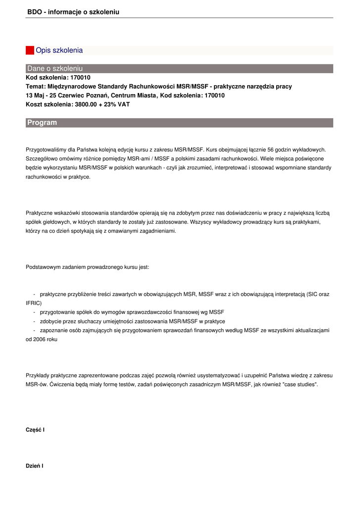 BDO - informacje o szkoleniu Opis szkolenia Dane o szkoleniu Kod szkolenia: 170010 Temat: Międzynarodowe Standardy Rachunkowości MSR/MSSF - praktyczne narzędzia pracy 13 Maj - 25 Czerwiec Poznań, Centrum Miasta, Kod szkolenia: 170010 Koszt szkolenia: 3800.00 + 23% VAT Program Przygotowaliśmy dla Państwa kolejną edycję kursu z zakresu MSR/MSSF. Kurs obejmującej łącznie 56 godzin wykładowych. Szczegółowo omówimy różnice pomiędzy MSR-ami / MSSF a polskimi zasadami rachunkowości. Wiele miejsca poświęcone będzie wykorzystaniu MSR/MSSF w polskich warunkach - czyli jak zrozumieć, interpretować i stosować wspomniane standardy rachunkowości w praktyce. Praktyczne wskazówki stosowania standardów opierają się na zdobytym przez nas doświadczeniu w pracy z największą liczbą spółek giełdowych, w których standardy te zostały już zastosowane. Wszyscy wykładowcy prowadzący kurs są praktykami, którzy na co dzień spotykają się z omawianymi zagadnieniami. Podstawowym zadaniem prowadzonego kursu jest: - praktyczne przybliżenie treści zawartych w obowiązujących MSR, MSSF wraz z ich obowiązującą interpretacją (SIC oraz IFRIC) - przygotowanie spółek do wymogów sprawozdawczości finansowej wg MSSF - zdobycie przez słuchaczy umiejętności zastosowania MSR/MSSF w praktyce - zapoznanie osób zajmujących się przygotowaniem sprawozdań finansowych według MSSF ze wszystkimi aktualizacjami od 2006 roku Przykłady praktyczne zaprezentowane podczas zajęć pozwolą również usystematyzować i uzupełnić Państwa wiedzę z zakresu MSR-ów. Ćwiczenia będą miały formę testów, zadań poświęconych zasadniczym MSR/MSSF, jak również "case studies". Część I Dzień l BDO - informacje o szkoleniu 1. Podstawy prawne i założenia koncepcyjne MSR/MSSF 2. Fundacja i Rada Międzynarodowych Standardów Sprawozdawczość Finansowej (MSSF) 3. MSSF w polskim prawie bilansowym 4. Adaptacja MSSF w Dyrektywach Unii Europejskiej 5. Założenia koncepcyjne i interpretacje zasad sporządzania i prezentacji sprawozdań finansowych według MSSF 6. MSR 1: Prezentacja sprawozdań finansowych 7. MSR 8: Polityka rachunkowości, zmiany w wartościach szacunkowych i korekty błędów 8. MSR 10: Zdarzenia następujące po dacie bilansu 9. MSR 18: Przychody 10. Wprowadzenie do MSSF/MSR (krótka informacja na temat istoty MSSF oraz Rady Międzynarodowych Standardów Rachunkowości i jej roli w procesie międzynarodowej harmonizacji rachunkowości); charakterystyka rachunkowości wg MSSF, Ramy Konceptualne MSR (podstawowe założenia, cechy jakościowe informacji, definicje elementów sprawozdań finansowych, koncepcje wyceny); sprawozdanie finansowe wg MSR (zakres, zasady przygotowywania i prezentacji, prezentacja bilansu i rachunku zysków i strat), specyficzne zdarzenia w rachunkowości (błędy, zmiany szacunków, zdarzenia po dniu bilansowym); polityka rachunkowości (istota, kryteria wyboru, zmiany); zasady ujmowania przychodów (sprzedaż produktów, przychody z usług oraz przychody z odsetek) Dzień 2 1. Część I Sprawozdania finansowe wg MSR/MSSF 2. MSSF 1: Zastosowanie MSR/MSSF po raz pierwszy 3. Zestawienie zmian w kapitale wg MSR 1 4. Sprawozdanie z dochodów całkowitych wg MSR 1 5. MSR 34: Śródroczna sprawozdawczość finansowa 6. MSR 29: Sprawozdawczość finansowa w warunkach hiperinflacji 7. MSR 33: Zysk przypadający na jedną akcję 8. Wraz z ilustrującymi przykładami zostanie zaprezentowany standard dotyczący sporządzania sprawozdania finansowego według MSSF po raz pierwszy a także techniki księgowe dotyczące korekt lat ubiegłych i lub zmiany zasad rachunkowości. Omówiona zostanie zawartość sprawozdania według MSSF. Zdarzenia po dacie bilansu wymagające i nie wymagające korekt, data zatwierdzenia sprawozdania finansowego. Część II Dzień 3 Instrumenty finansowe - wycena i ujęcie w księgach: 1. Standardy rachunkowości dotyczące instrumentów finansowych, zakres standardów 2. Podstawowe definicje i klasyfikacja instrumentów finansowych, przykłady 3. Wycena instrumentów finansowych: BDO - informacje o szkoleniu - Zasady wyceny poszczególnych kategorii instrumentów finansowych - Omówienie wyceny według wartości godziwej - Omówienie wyceny według zamortyzowanego kosztu z zastosowaniem efektywnej stopy procentowej - Ćwiczenia praktyczne - wycena kontraktu forward według wartości godziwej, wycena pożyczek i kredytów w księgach pożyczkobiorcy i kredytodawcy według zamortyzowanego kosztu 4. Ujęcie instrumentów finansowych w księgach rachunkowych: - Początkowe ujęcie- wycena i moment ujęcia, ujęcie transakcji na dzień zawarcia i rozliczenia transakcji, trwała utrata wartości- ćwiczenia praktyczne 5. Wbudowane instrumenty pochodne: - Pojęcie wbudowanych instrumentów pochodnych - Zasady wydzielania instrumentów pochodnych - Ćwiczenia praktyczne - wydzielanie instrumentu pochodnego Dzień 4 Instrumenty finansowe - rachunkowość zabezpieczeń i ujawnienia w sprawozdaniu: 1. Rachunkowość zabezpieczeń: - Ogólne zasady księgowania rachunkowości zabezpieczeń - Warunki stosowania rachunkowości zabezpieczeń (wymogi formalne i dokumentacyjne) - Modele zabezpieczeń (zabezpieczenie przepływów pieniężnych oraz wartości godziwej) - Ćwiczenia praktyczne - ujęcie księgowe zabezpieczenia przepływów pieniężnych oraz wartości godziwej 2. Ujawnienia w sprawozdaniach finansowych: - MSR 32 "Instrumenty finansowe: prezentacja" - MSSF 7 "Instrumenty finansowe - ujawnienia" - Przykłady ujawnień zgodnych z MSSF 7 Część III BDO - informacje o szkoleniu Dzień 5 1. Aktywa i pasywa bilansu 2. MSR 2: Zapasy 3. MSR 16: Rzeczowe aktywa trwałe 4. MSR 38: Aktywa niematerialne 5. Wycena początkowa zapasów (ze szczególnym uwzględnieniem ustalania kosztu wytworzenia); wycena zapasów na dzień bilansowy (pomiar wartości realizacji netto, odpisy aktualizujące wartość); ujęcie rzeczowych środków trwałych (p